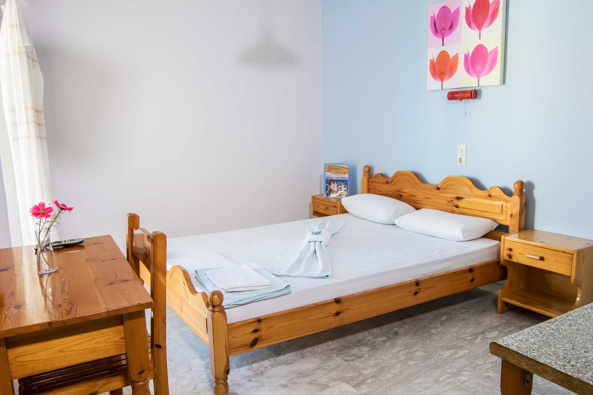 Dubbelrum med balkong och havsutsikt. En dubbelsäng eller två enkelsängar. Möjlighet till extrabädd i enkelsäng. Wifi ingår. Luftkonditionering mot avgift. Kylskåp. Tv med lokala kanaler. Hårtork. Badrum med dusch och wc. Städning 5 ggr/vecka. Barn under två år räknas in i max antal personer i rummet.