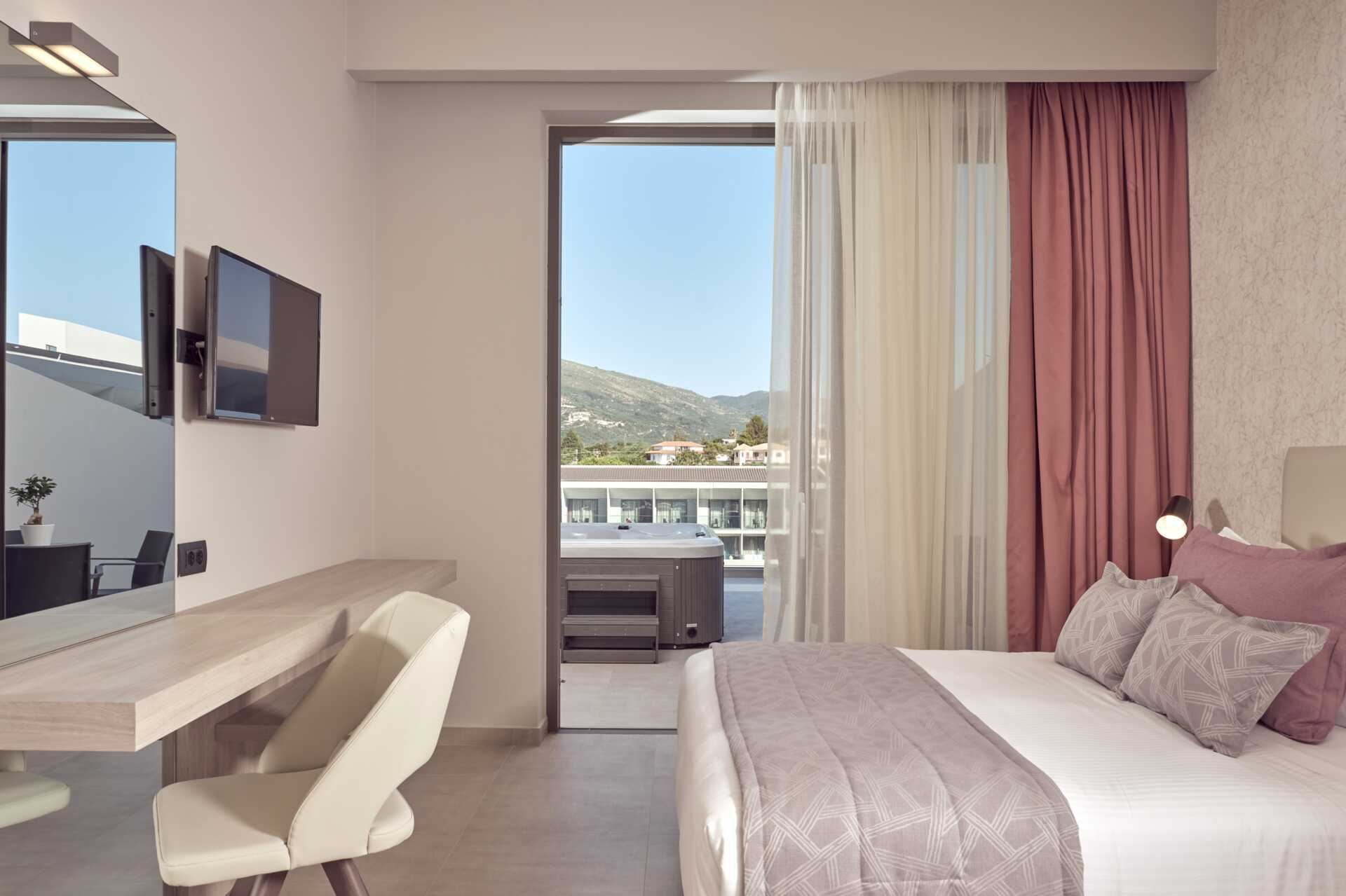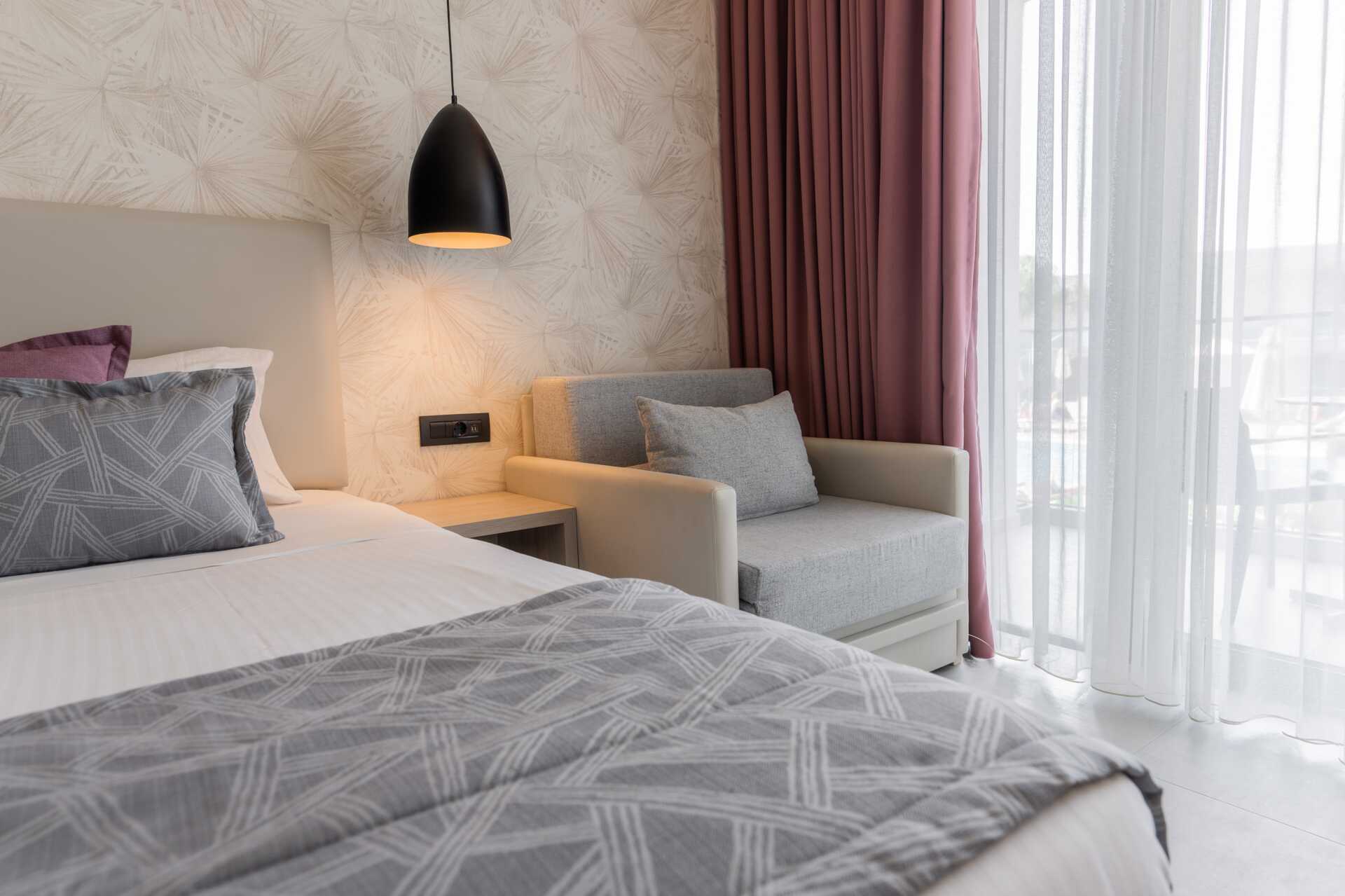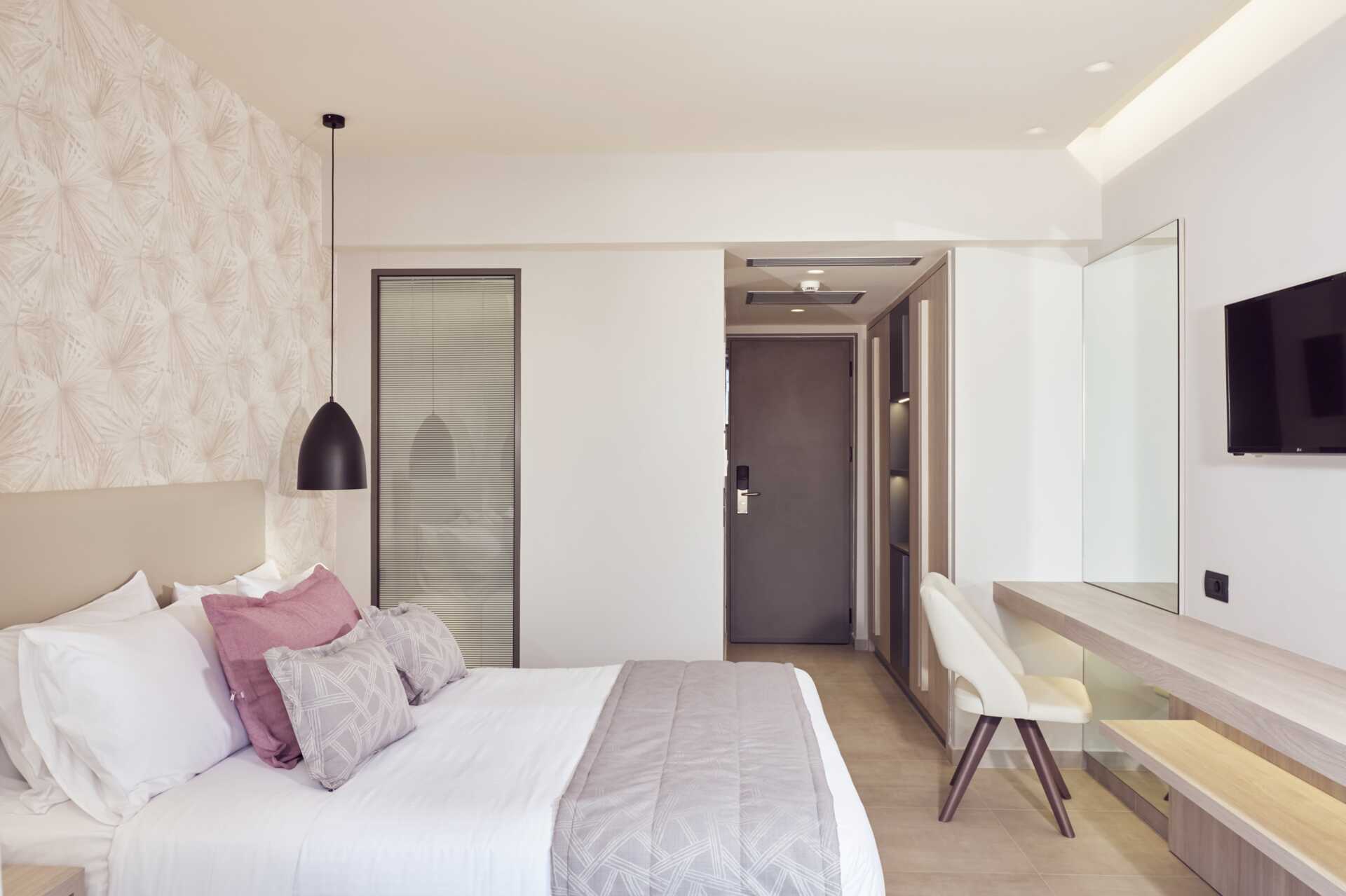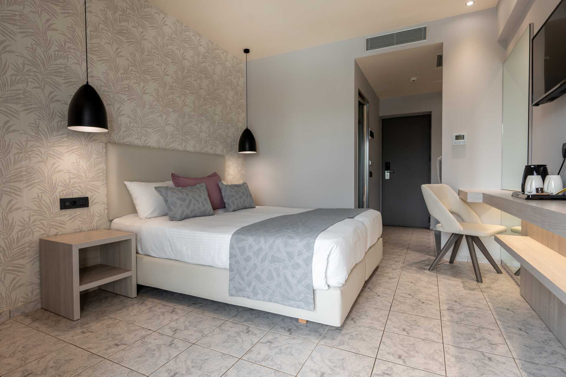 Dubbelrum med balkong. En dubbelsäng eller två enkelsängar. Möjlighet till extrabädd i bäddbar fåtölj. Wifi och luftkonditionering ingår. Deponering mot avgift. Kylskåp. Vattenkokare samt kaffe och te. Tv med internationella kanaler. Hårtork. Badrum dusch samt wc. Städning 7 ggr/vecka. Barn under två år räknas in i maxantalet personer i rummet.