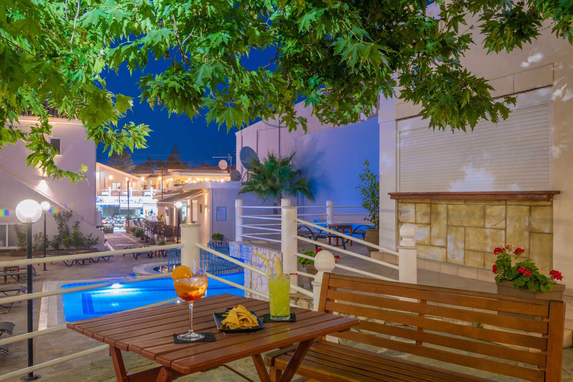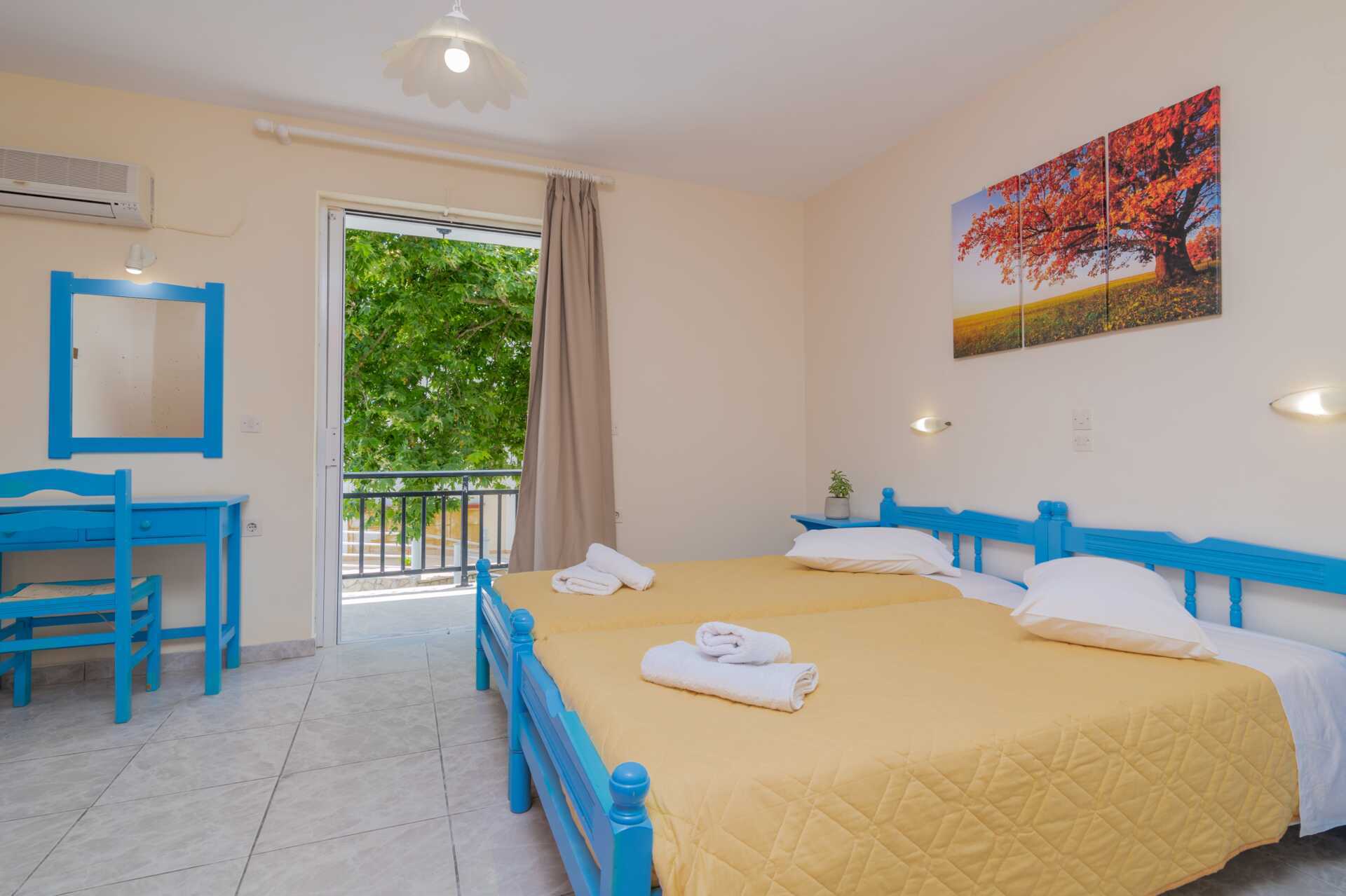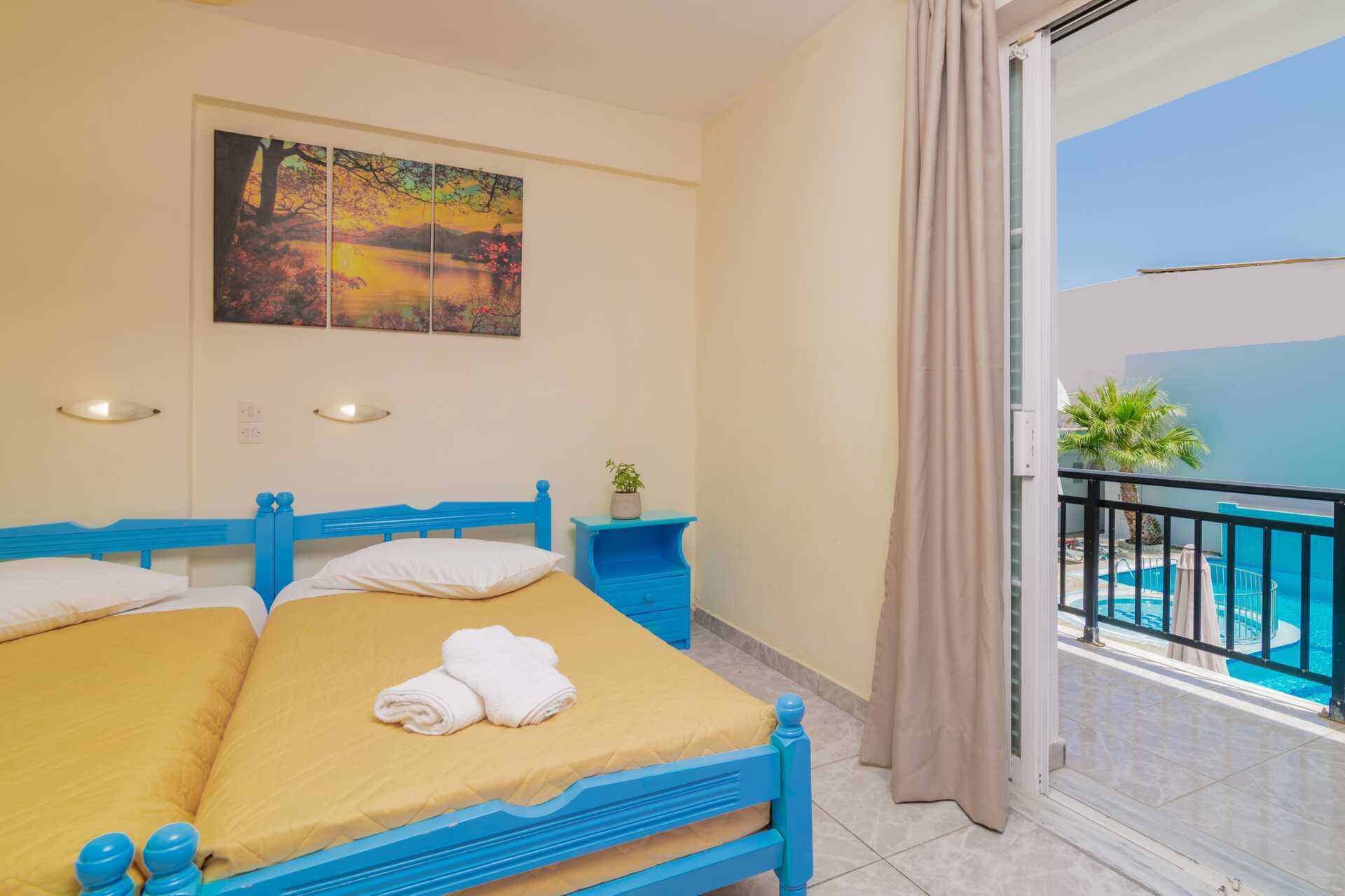Dubbelrum med balkong eller markbalkong, vissa med poolutsikt. Två enkelsängar. Möjlighet till extrabädd i enkelsäng. Wifi och deponering ingår. Luftkonditionering mot avgift. Kylskåp. Badrum med dusch och wc. Städning 7 ggr/vecka.