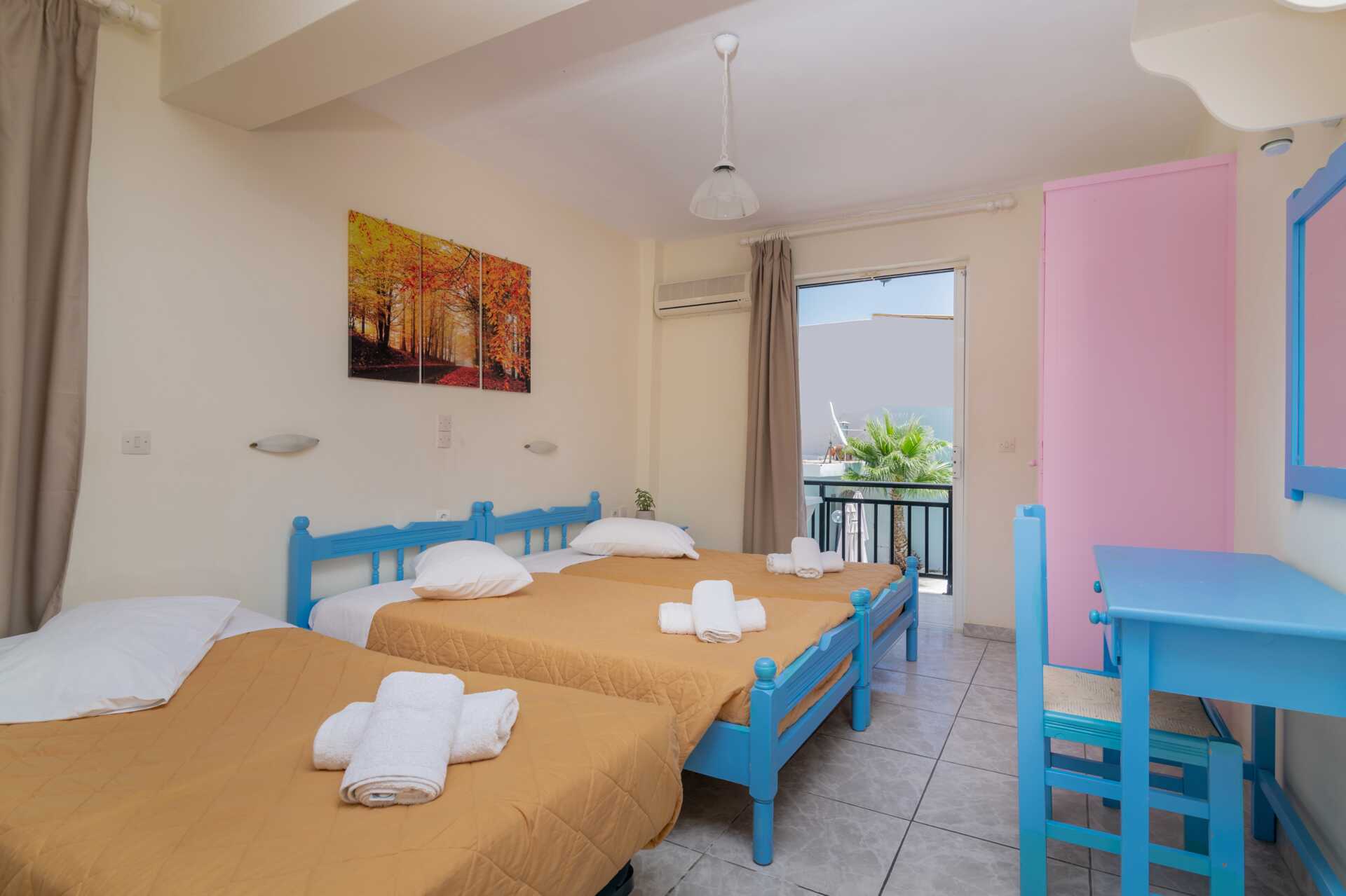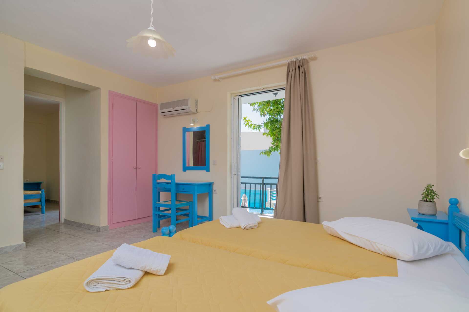 Familjerum med balkong eller markbalkong. Familjerummet består av två sovrum med två enkelsängar i varje rum. Wifi och deponering ingår. Luftkonditionering mot avgift. Kylskåp. Badrum med dusch och wc. Städning 7 ggr/vecka.