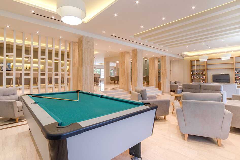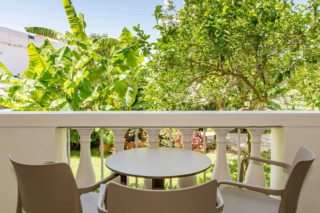 Rom 105 hade en mörk balkong i ett hörn, som begränsade utsikten mot poolområdet.