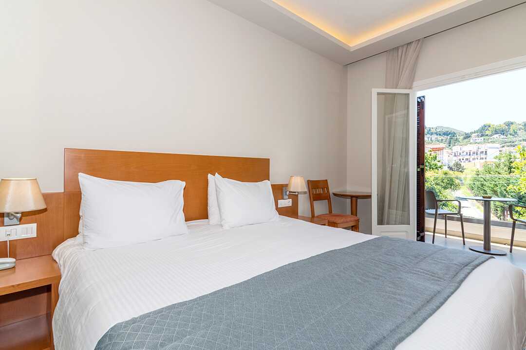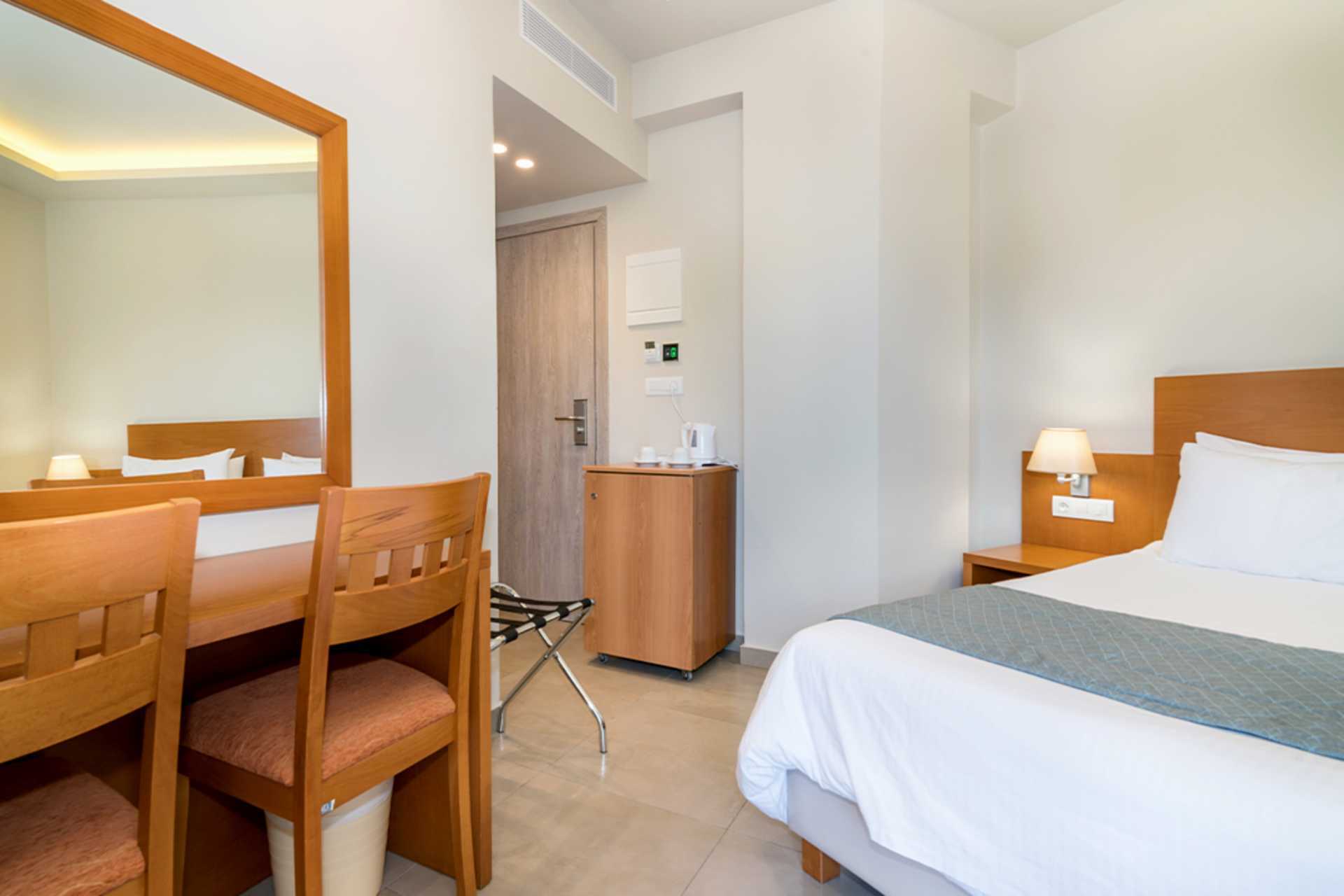 Trippelrum med balkong. En dubbelsäng och en enkelsäng. Wifi ingår. Luftkonditionering och deponering mot avgift. Kylskåp och vattenkokare. Tv ned internationella kanaler. Hårtork. Badrum med dusch och wc. Städning 7 ggr/vecka. Barn under två år räknas in i max antal personer i rummet.