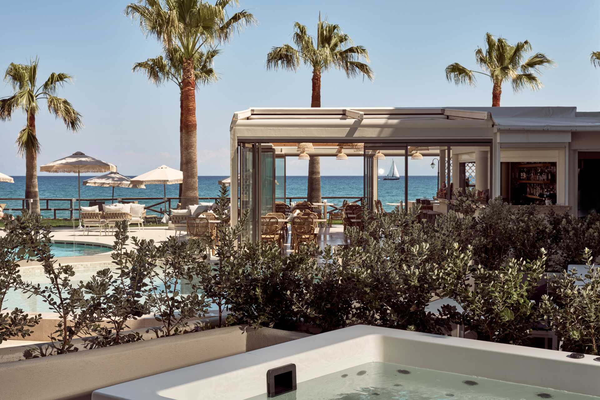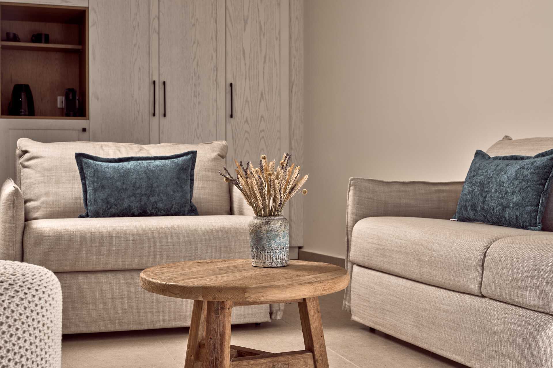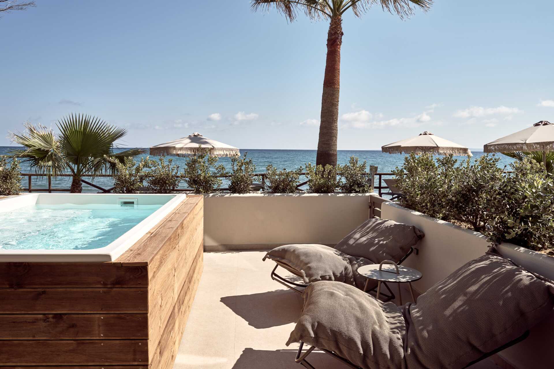 Juniorsvit deluxe med en jacuzzi samt två sköna fåtöljer samt en soffa på markterrassen. Sovrumsdel med en dubbelsäng och en vardagsrumsdel med en bäddsoffa och en bäddbar fåtölj. Wifi, luftkonditionering och deponering ingår. Kylskåp. Vattenkokare samt kaffe och te. Nespresso kaffemaskin. Tv med internationella kanaler. Tofflor. Hårtork. Badrum med dusch och wc. Städning 7 ggr/vecka.