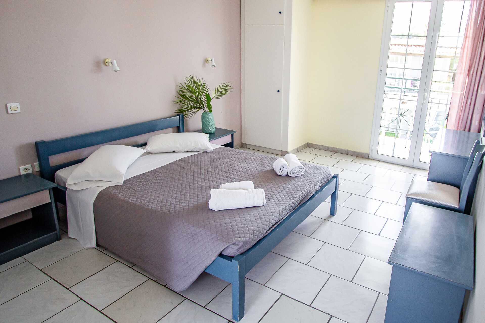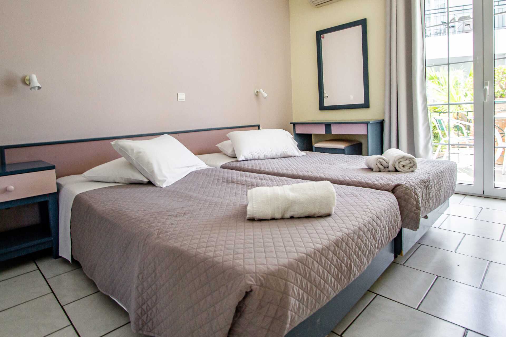 Enrumslägenhet med 3 ord. bäddar med balkong. En dubbelsäng eller två enkelsängar. Minikök med kylskåp, vattenkokare, kokplattor och enkel köksutrusting. Wifi och deponering ingår. Luftkonditionering mot avgift. Badrum med dusch samt wc. Städning 7 ggr/vecka.
