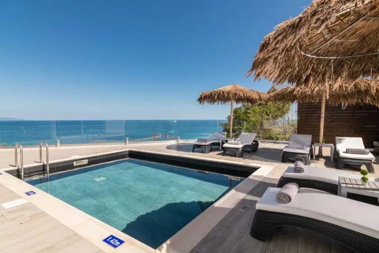 Denna överdådiga villa har en exklusiv pool och en utomhusbubbelpool med ett forsande vattenfall, som båda erbjuder hisnande utsikt över bergen och havet.