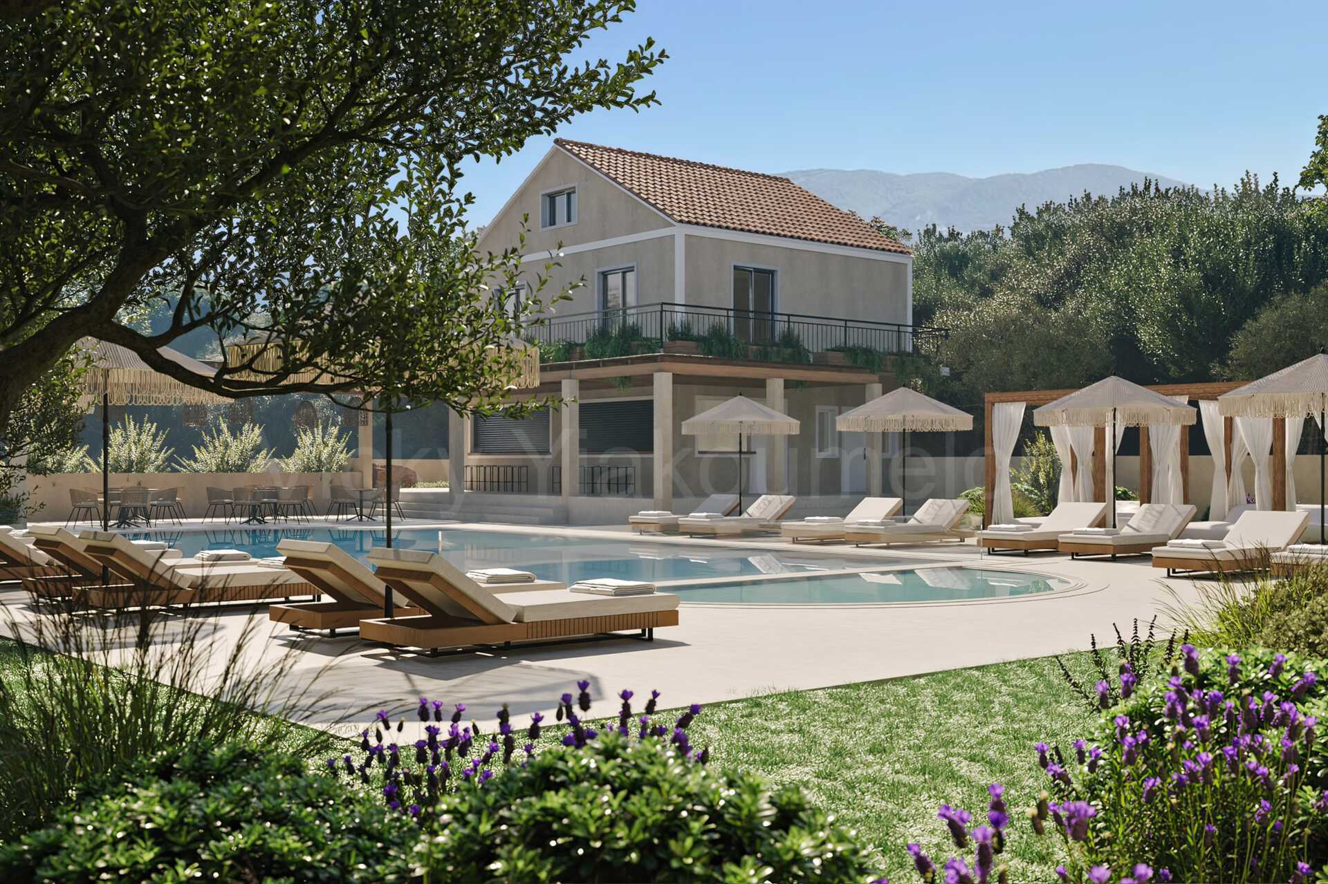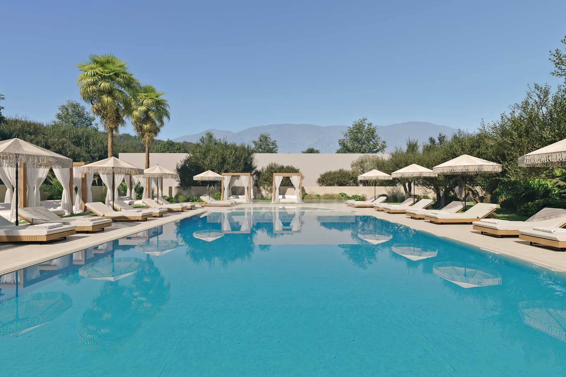 Ett poolområde med en pool med en grundare del för barn. Solstolar, parasoll och fasta solskydd.