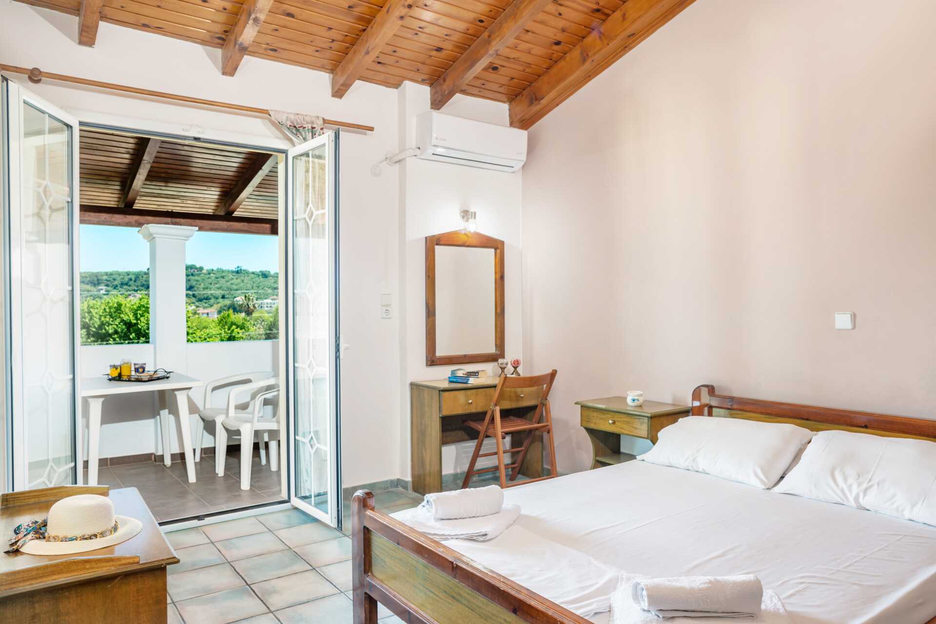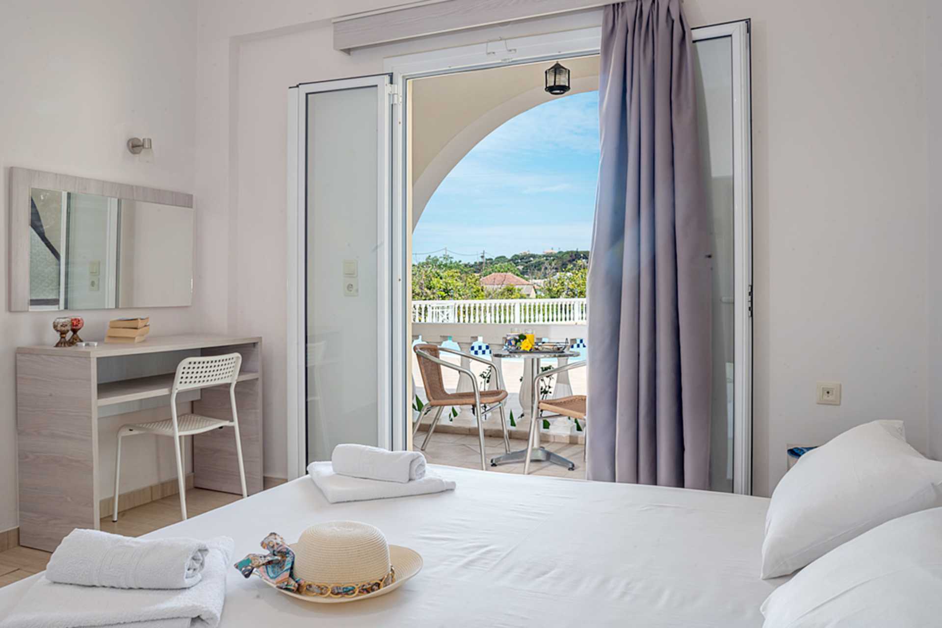 Enrumslägenhet med balkong eller markbalkong med poolutsikt. En dubbelsäng eller två separata sängar. Möjlighet till extrabädd i enkelsäng. Minikök med kylskåp, kokplattor, vattenkokare och enkel köksutrustning. Wifi och deponering ingår. Luftkonditionering mot avgift. Tv med internationella kanaler. Badrum med dusch och wc. Städning 7 ggr/vecka.