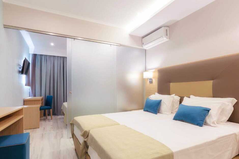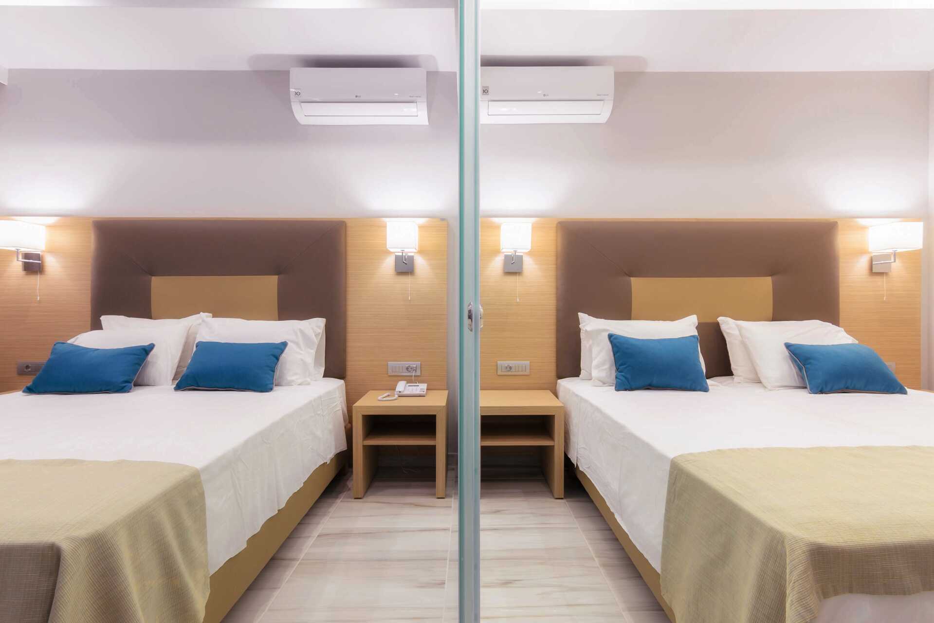 Familjerum med 2 ord. bäddar med balkong eller terrass. Familjerummet består av två sovrum med en skjutdörr mellan rummen. En dubbelsäng och två enkelsängar. Wifi, luftkonditionering och deponering ingår. Kylskåp. Tv med internationella kanaler. Badrockar och tofflor. Hårtork. Badrum med dusch samt wc. Städning 7 ggr/vecka.