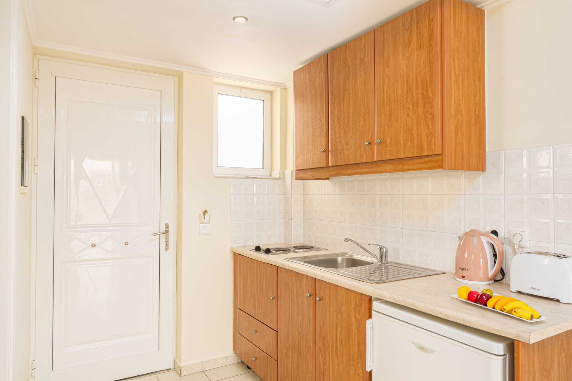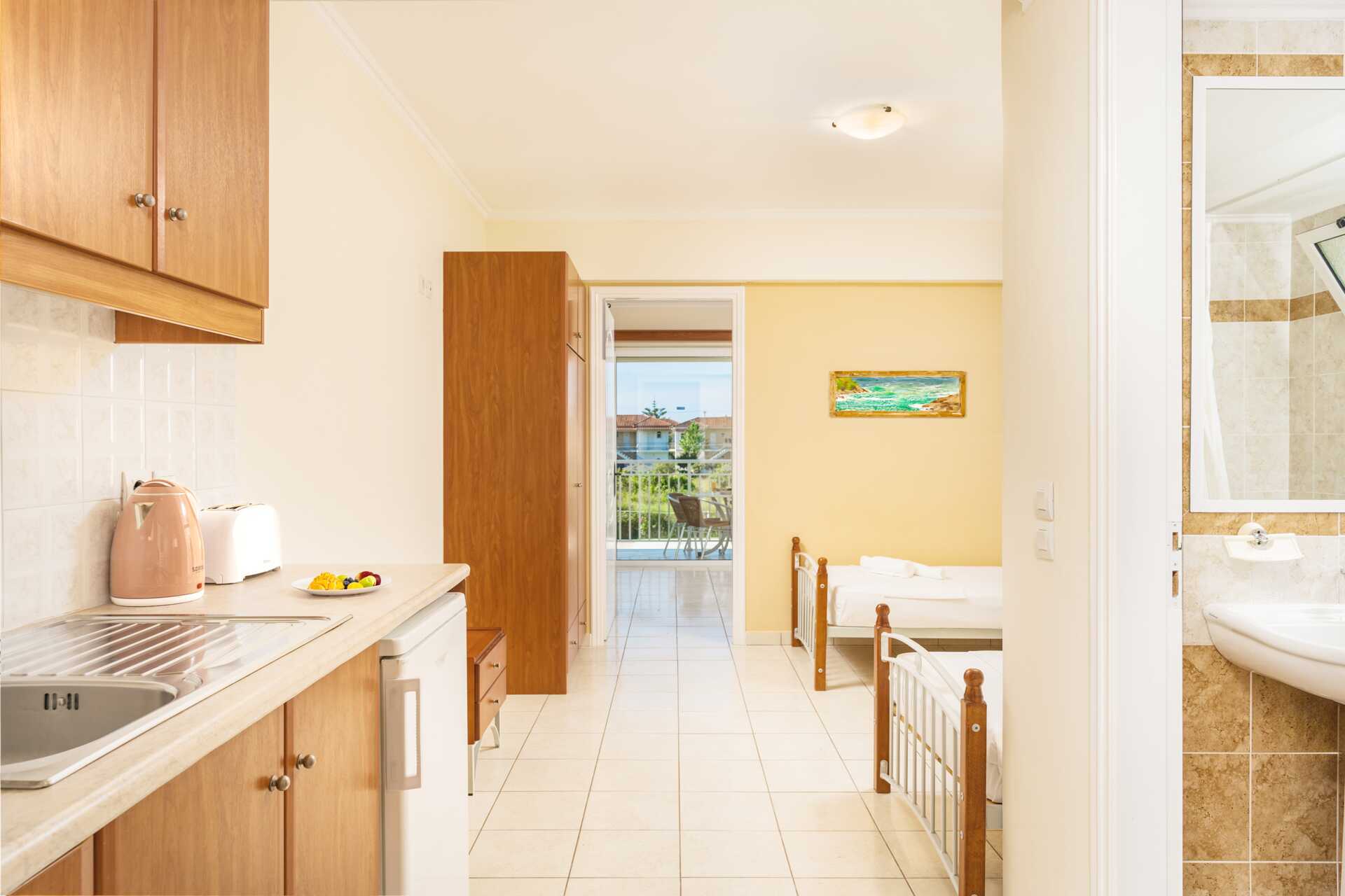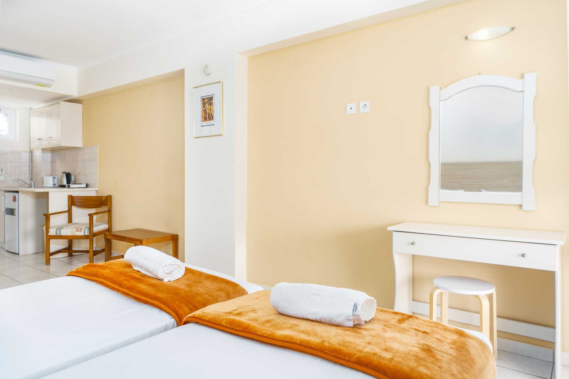 Enrumslägenhet med balkong eller markbalkong. Sovrum kombinerat med minikök. Två enkelsängar. Möjlighet till extrabädd i enkelsäng. Minikök med en kokplatta, kylskåp, brödrost, vattenkokare och enkel köksutrustning. Wifi, luftkonditionering och deponering ingår. Hårtork. Badrum med dusch och wc. Städning 6 ggr/vecka.