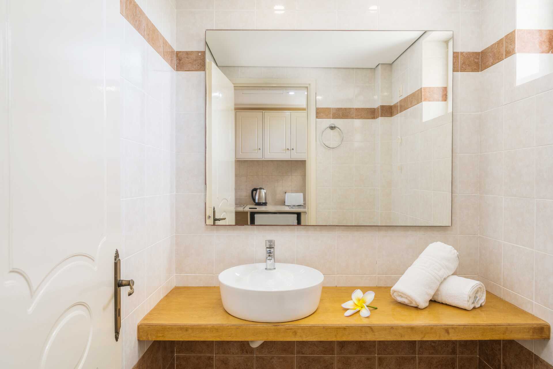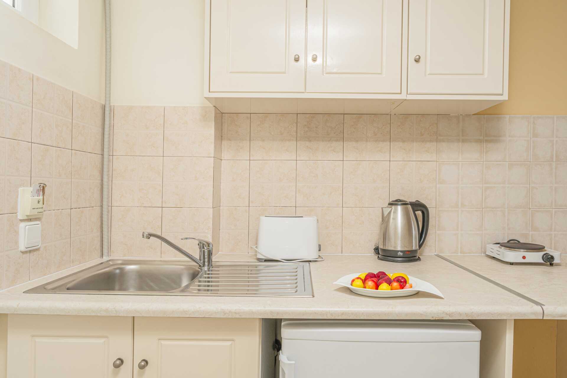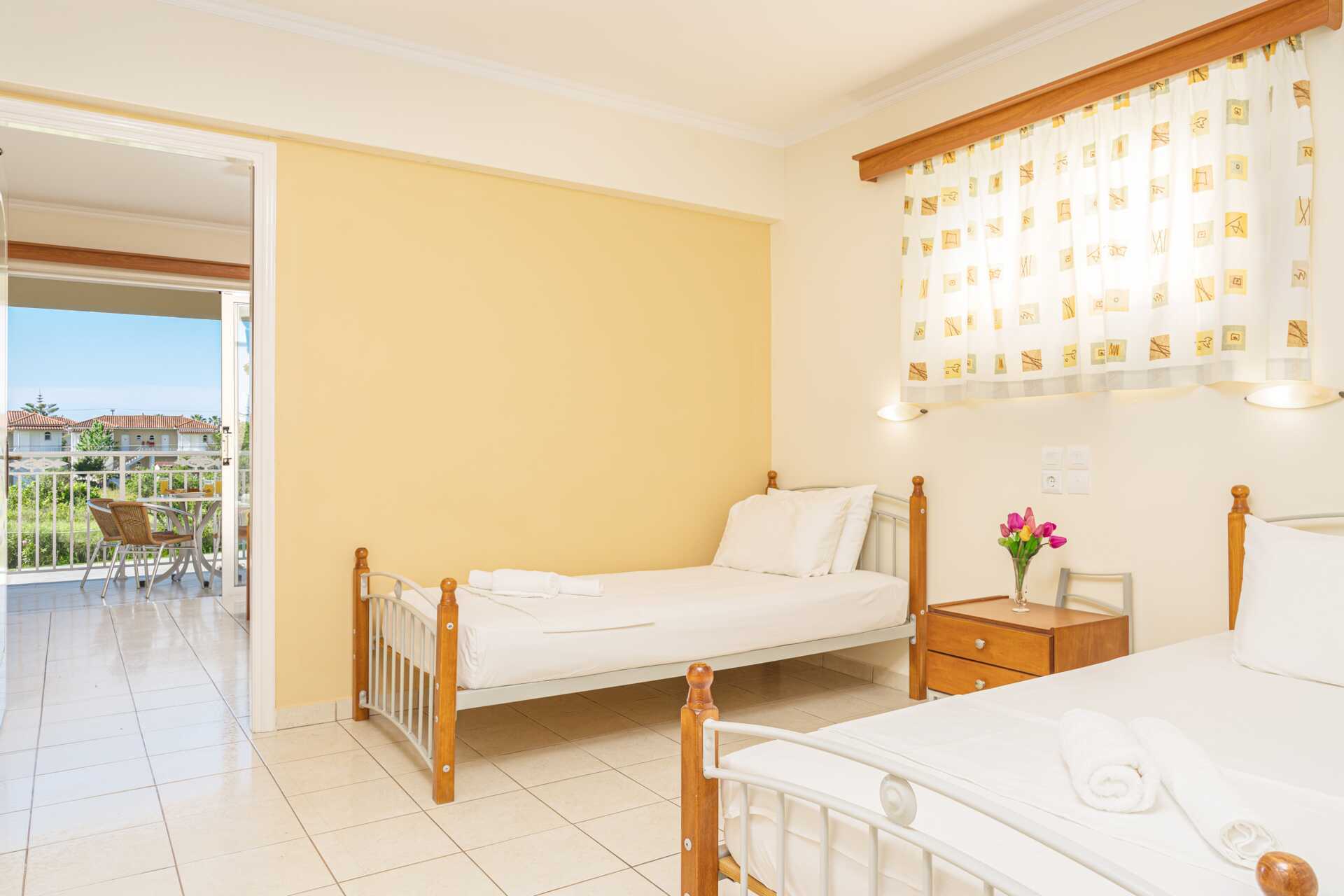 Enrumslägenhet med balkong eller markbalkong. Sovrum kombinerat med minikök. Två enkelsängar. Möjlighet till extrabädd i enkelsäng. Minikök med en kokplatta, kylskåp, brödrost, vattenkokare och enkel köksutrustning. Wifi, luftkonditionering och deponering ingår. Hårtork. Badrum med dusch och wc. Städning 6 ggr/vecka.