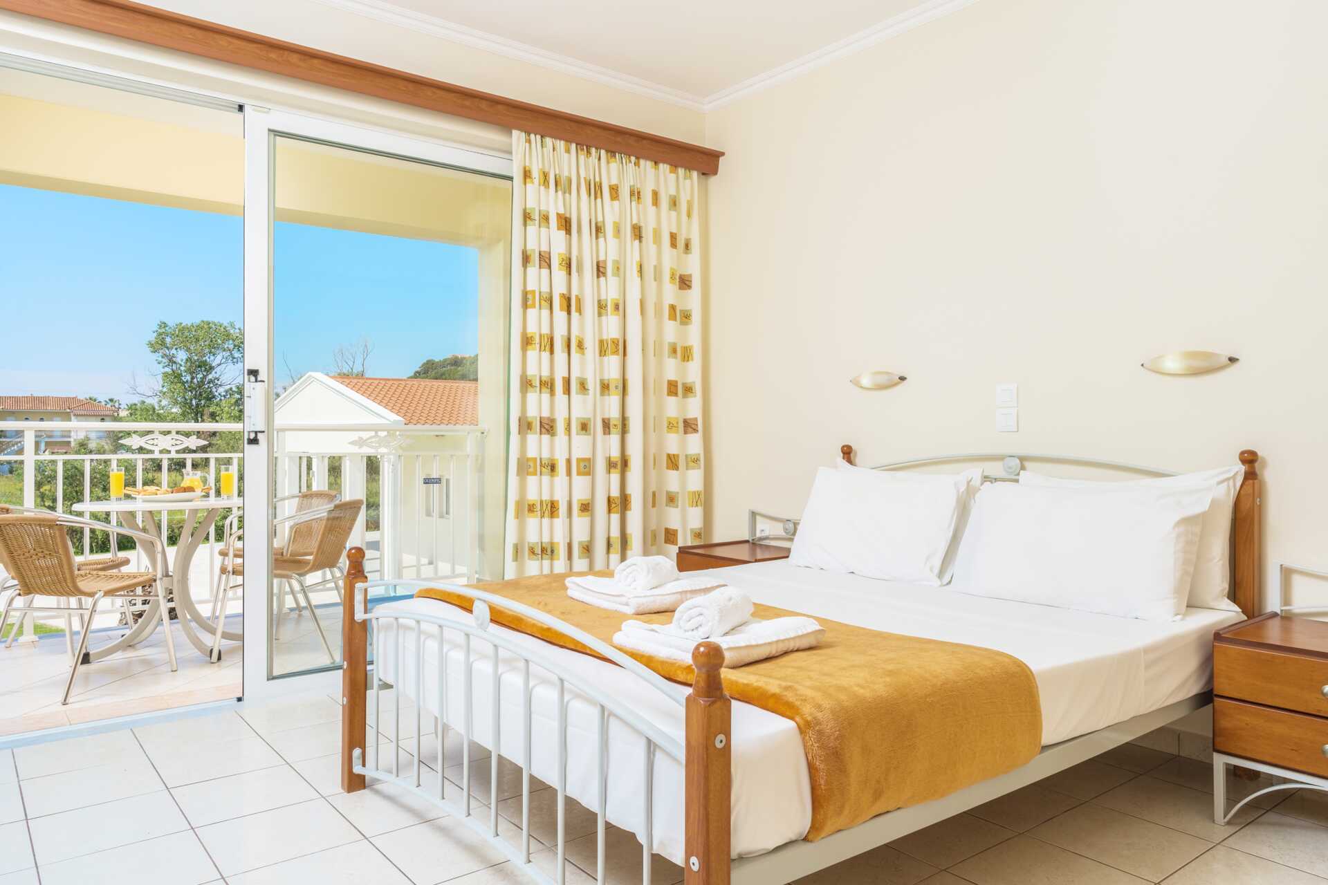 Tvårumslägenhet med markbalkong. Sovrum och kombinerat vardagsrum med minikök. En dubbelsäng eller två enkelsängar. Möjlighet till extrabäddar i två enkelsängar. Minikök med en kokplatta, kylskåp, vattenkokare, brödrost och enkel köksutrustning. Wifi, luftkonditionering och deponering ingår. Hårtork. Badrum med badkar och wc. Städning 6 ggr/vecka.