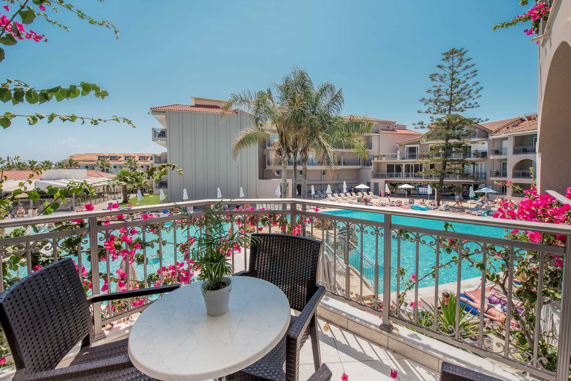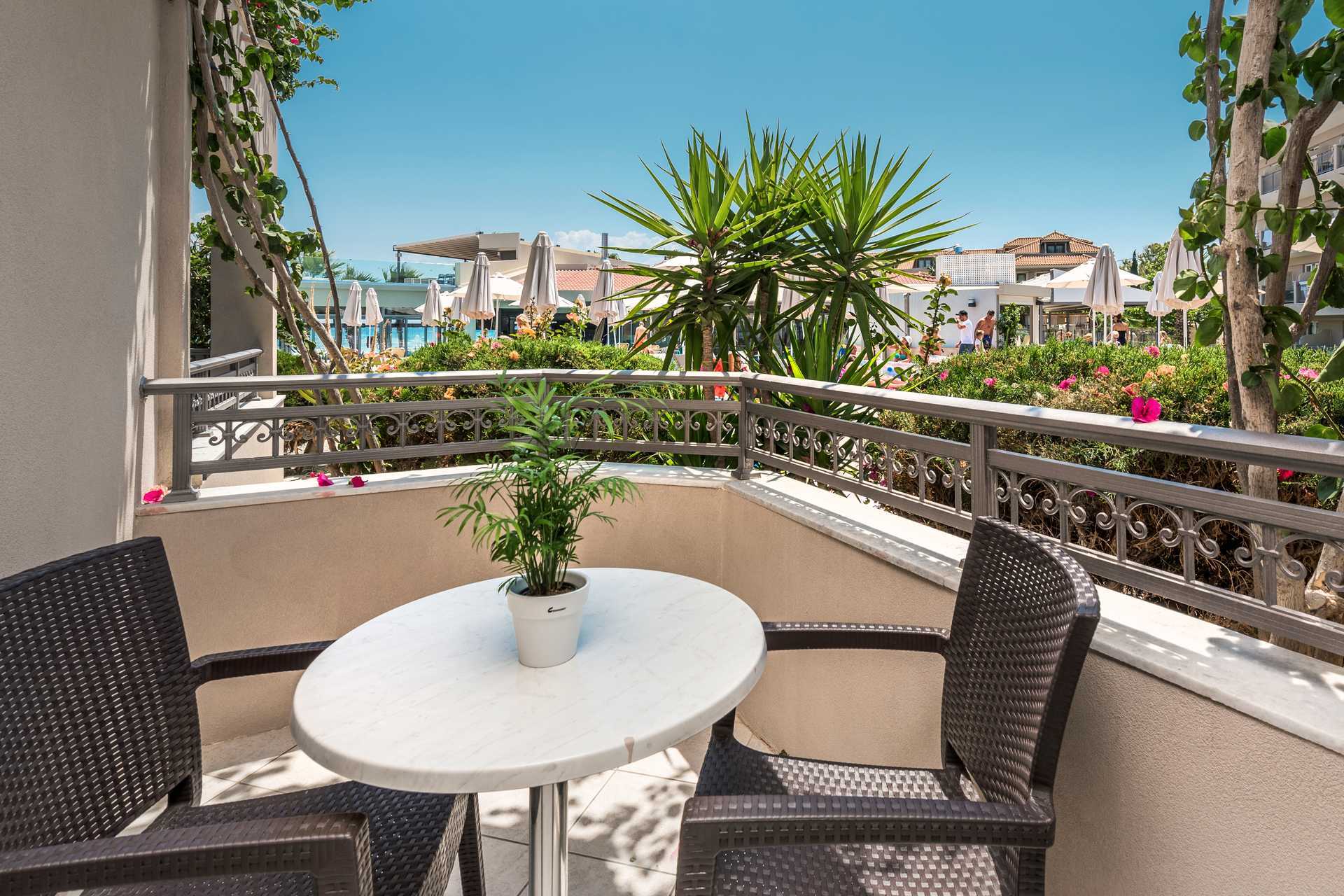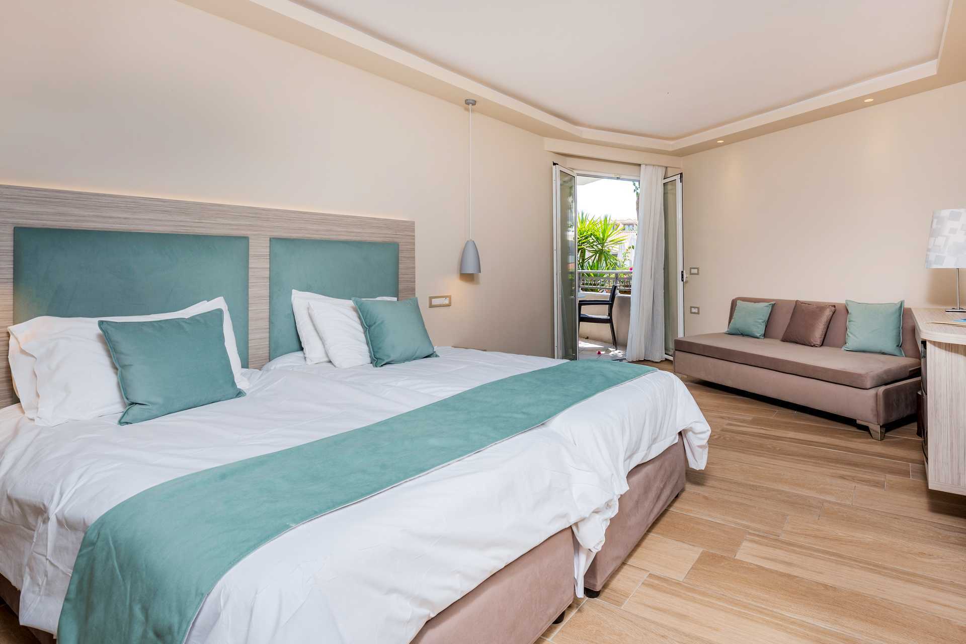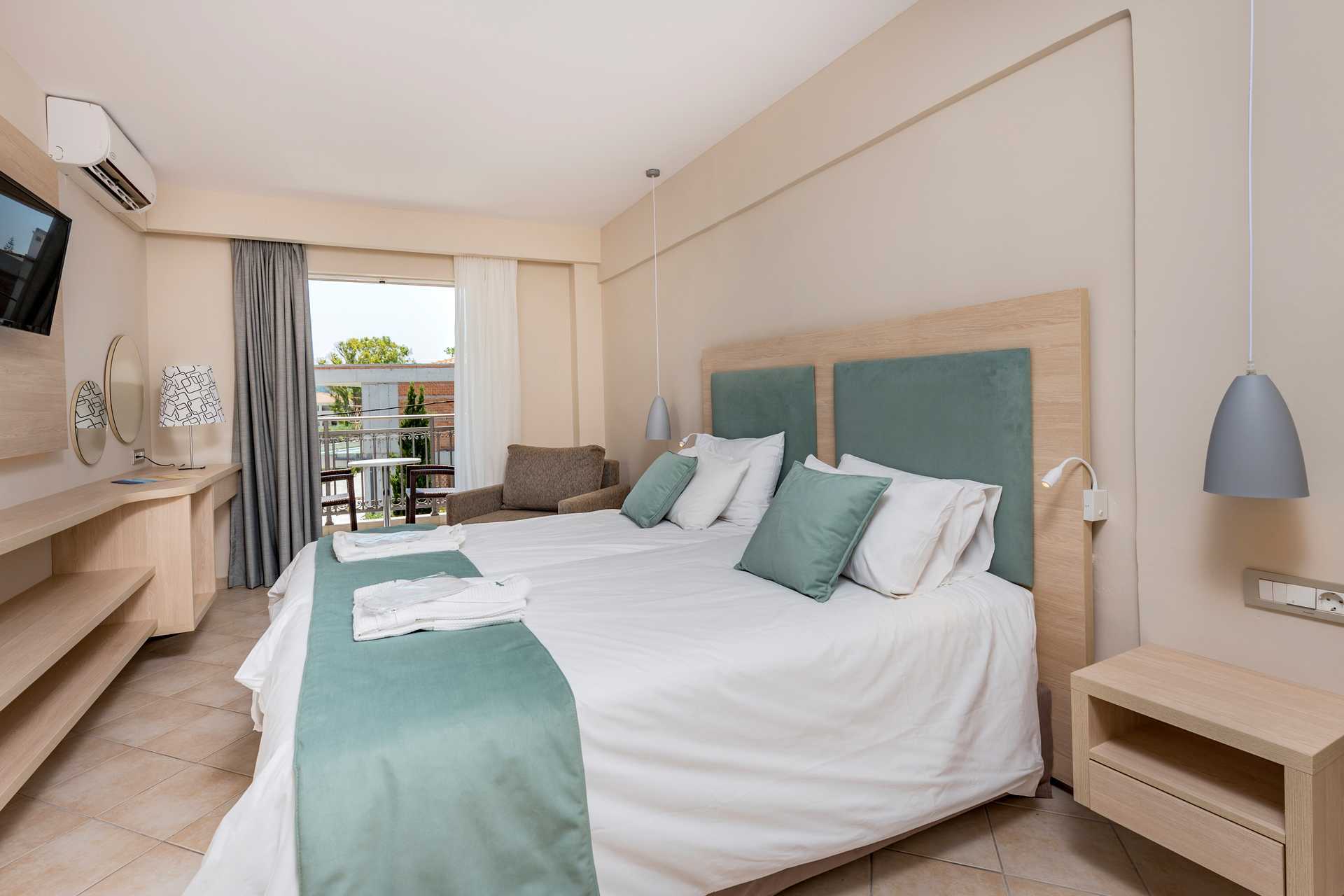 Dubbelrum med balkong eller markbalkong. Vissa av rummen har poolutsikt, vissa balkonger med begränsad havsutsikt. Två enkelsängar. Möjlighet till extrabädd i bäddbar fåtölj. Kylskåp. Vattenkokare samt kaffe och te. Wifi, luftkonditionering och deponering ingår. Tv med internationella kanaler. Hårtork. Badrum med dusch och wc. Städning 6 ggr/vecka.