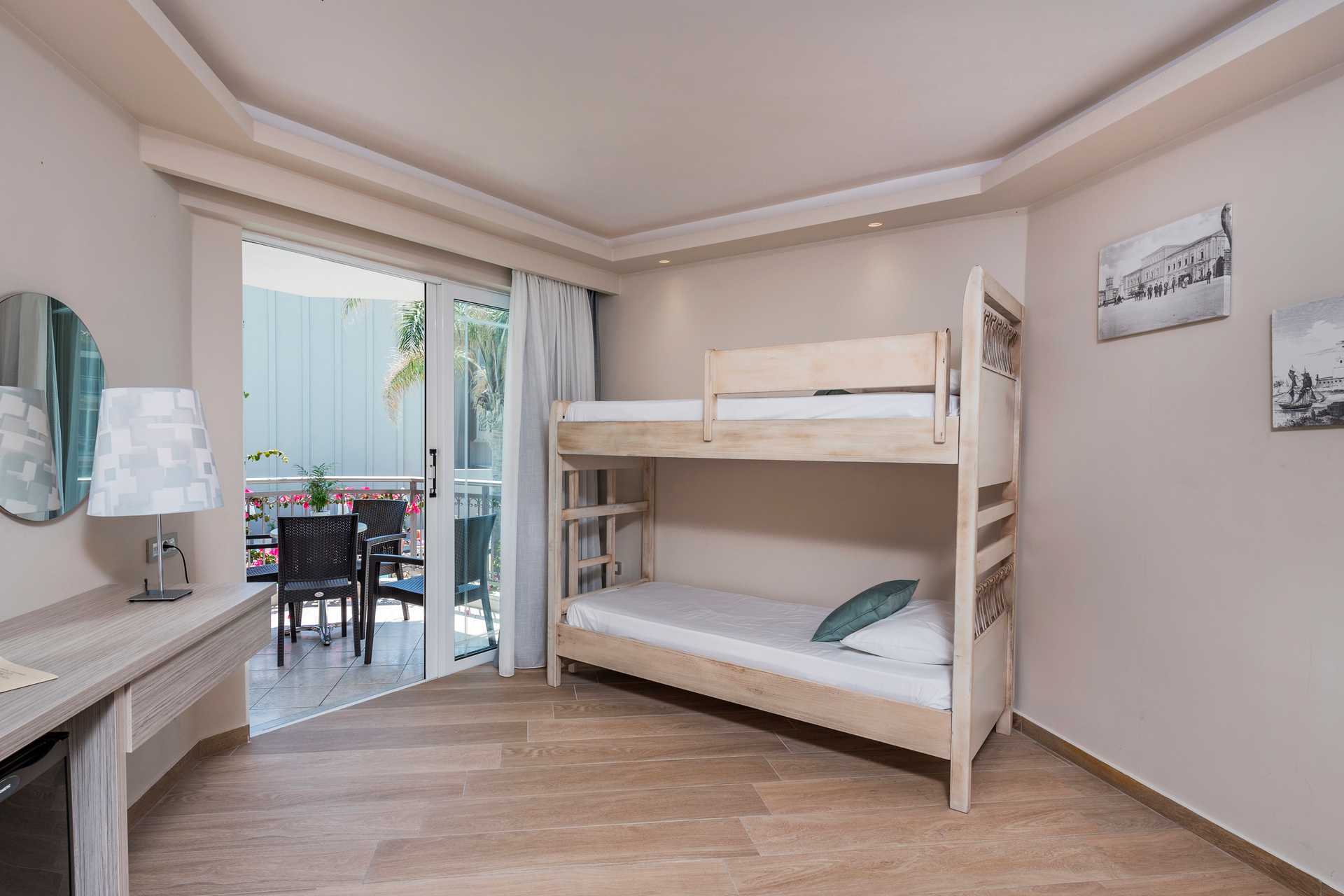 Familjerum med balkong eller markbalkong och poolutsikt. Två enkelsängar. Möjlighet till extrabäddar i en våningssäng som är 190 cm lång. Kylskåp. Vattenkokare samt kaffe och te. Wifi, luftkonditionering och deponering ingår. Tv med internationella kanaler. Hårtork. Badrum med dusch och wc. Städning 6 ggr/vecka.
