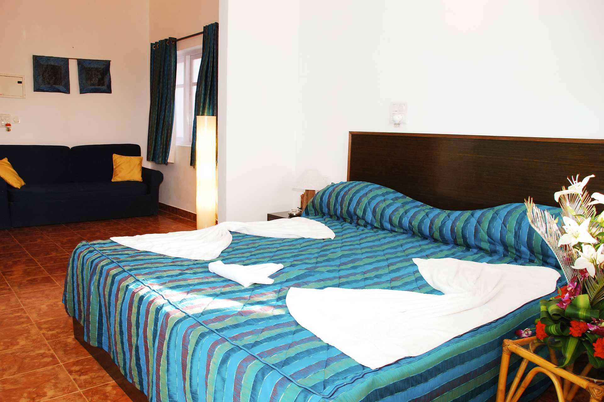 Dubbelrum med balkong eller terrass. En dubbelsäng eller två enkelsängar. Möjlighet till extrabädd i bäddsoffa. Wifi, luftkonditionering och deponering ingår. Takfläkt. Minibar. Vattenkokare samt kaffe och te. Tv med internationella kanaler. Hårtork. Badrum med dusch och wc. Städning 7 ggr/vecka.