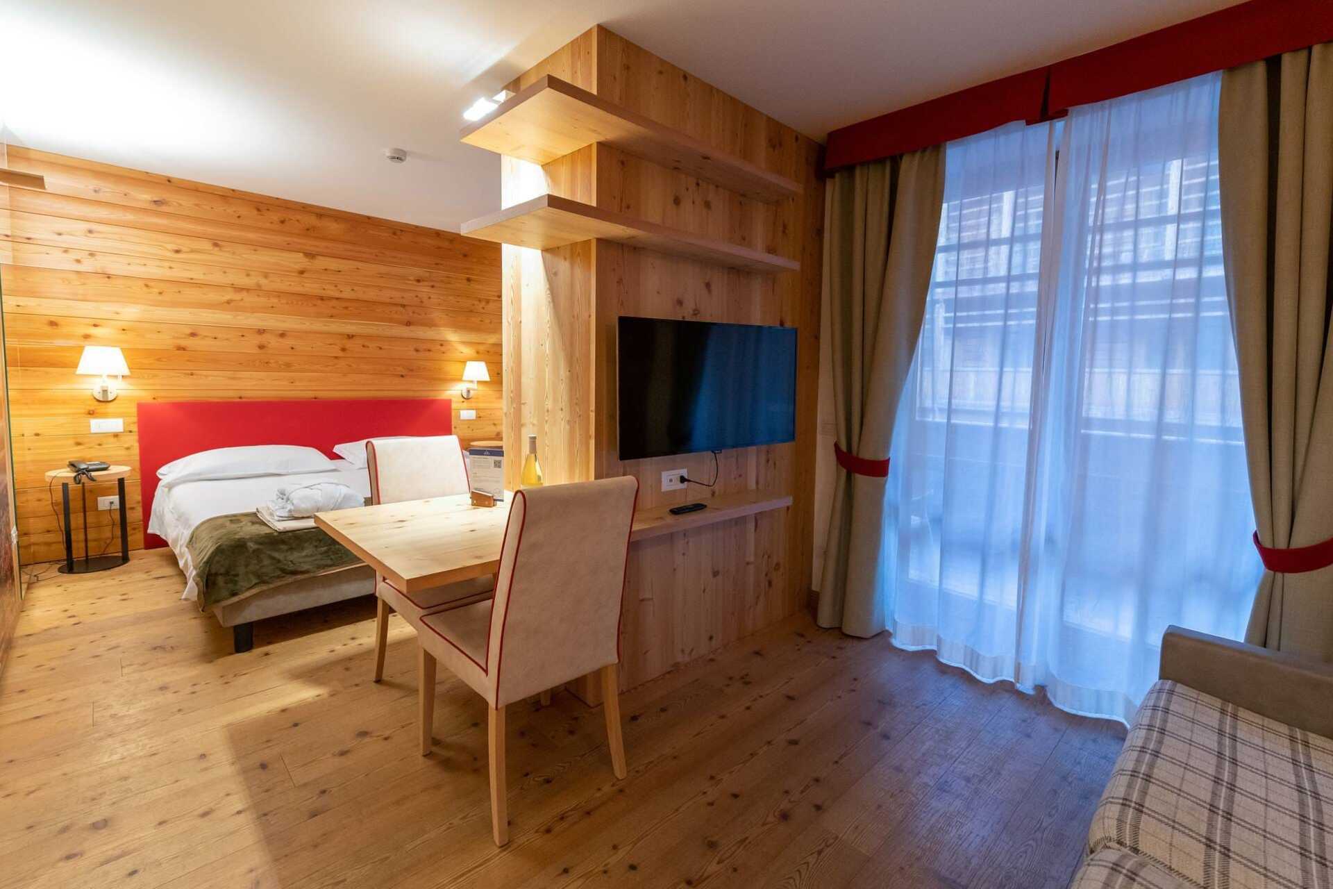 Dubbelrum med balkong. Några dubbelrum är i etage med en trappa upp till ett loft. En dubbelsäng. Wifi, luftkonditionering för värme och deponering ingår. Kylskåp. Kaffemaskin - kapslar mot avgift. Tv med internationella kanaler. Badrockar, poolhanddukar samt tofflor. Hårtork. Badrum med dusch och wc. Städning 5 ggr/vecka.