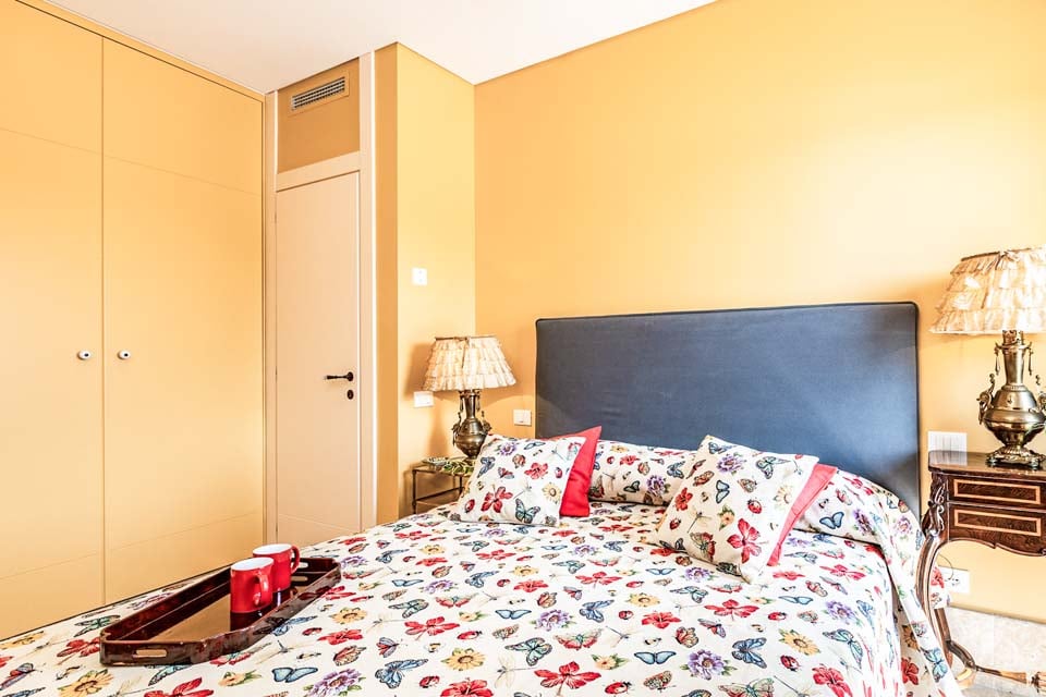 Dubbelsäng, luftkonditionering, dörrar till terrass