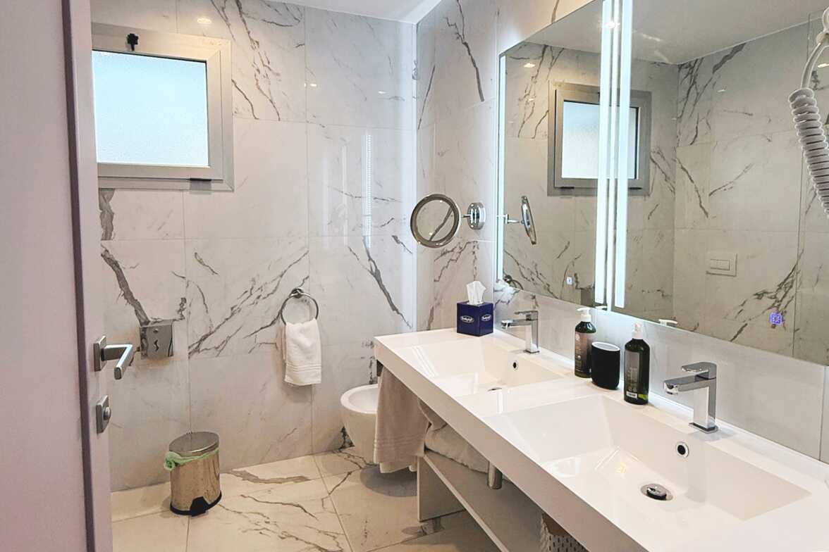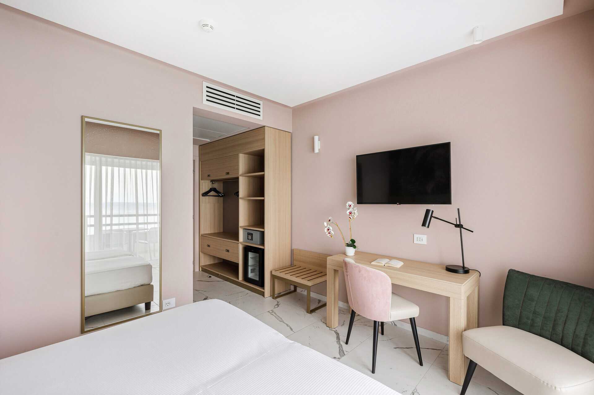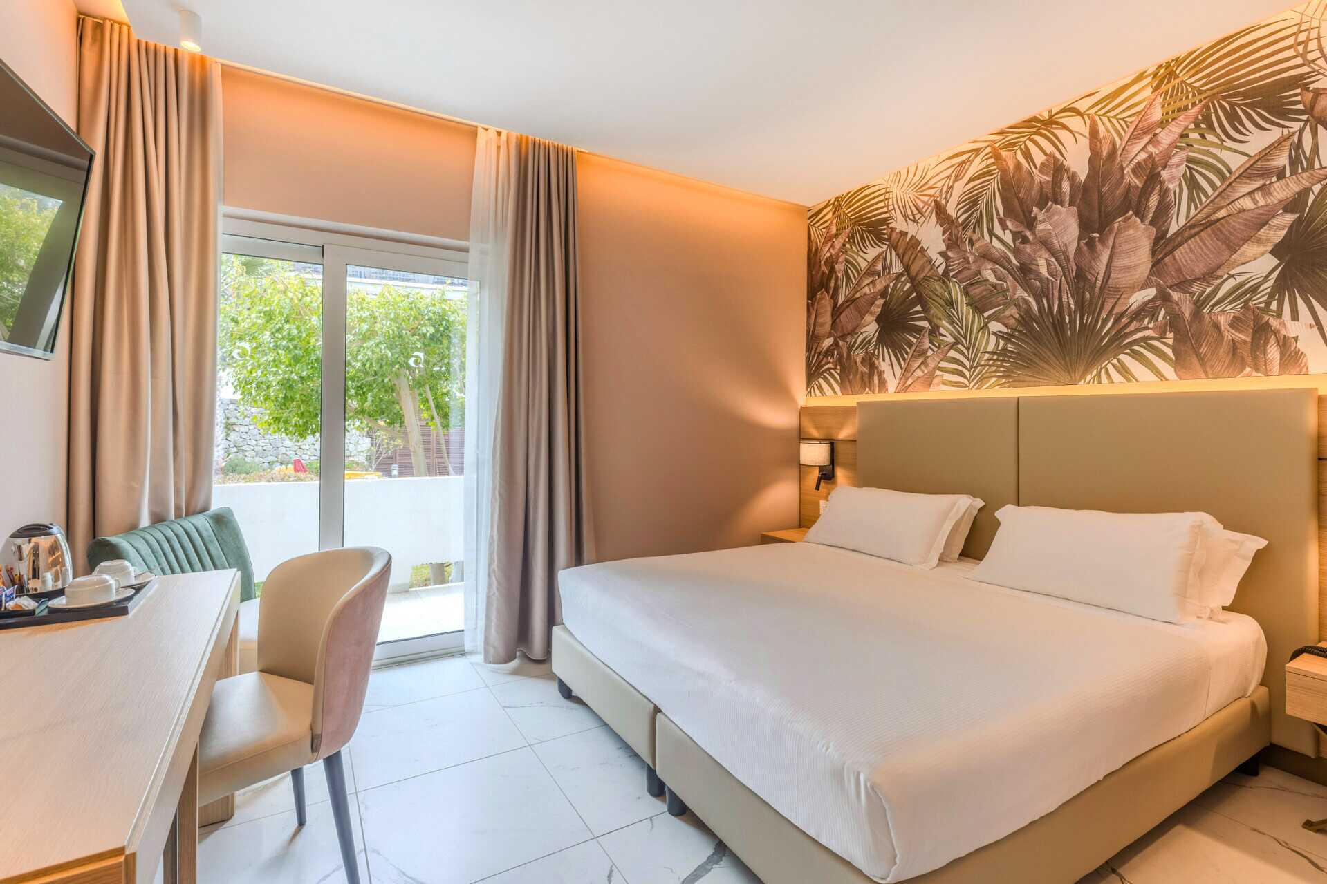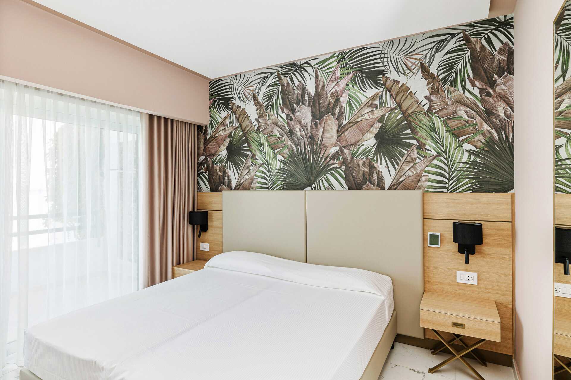 Dubbelrum med balkong eller terrass, vissa med havsutsikt. En dubbelsäng eller två enkelsängar. Möjlighet till extrabädd. Wifi, luftkonditionering och deponering ingår. Litet kylskåp. Tv med internationella kanaler. Hårtork. Badrum med dusch samt wc. Städning 3 ggr/vecka..