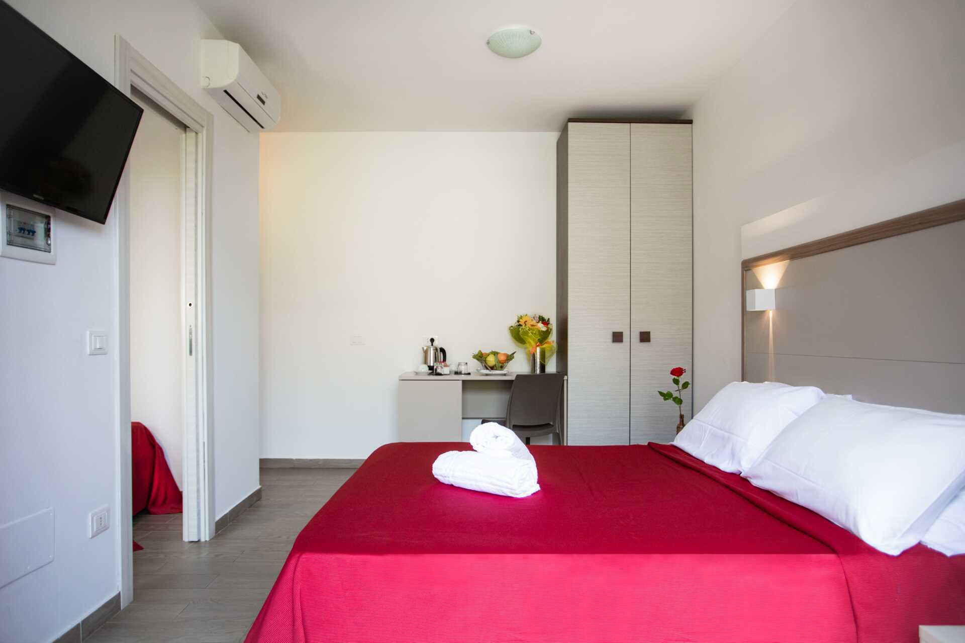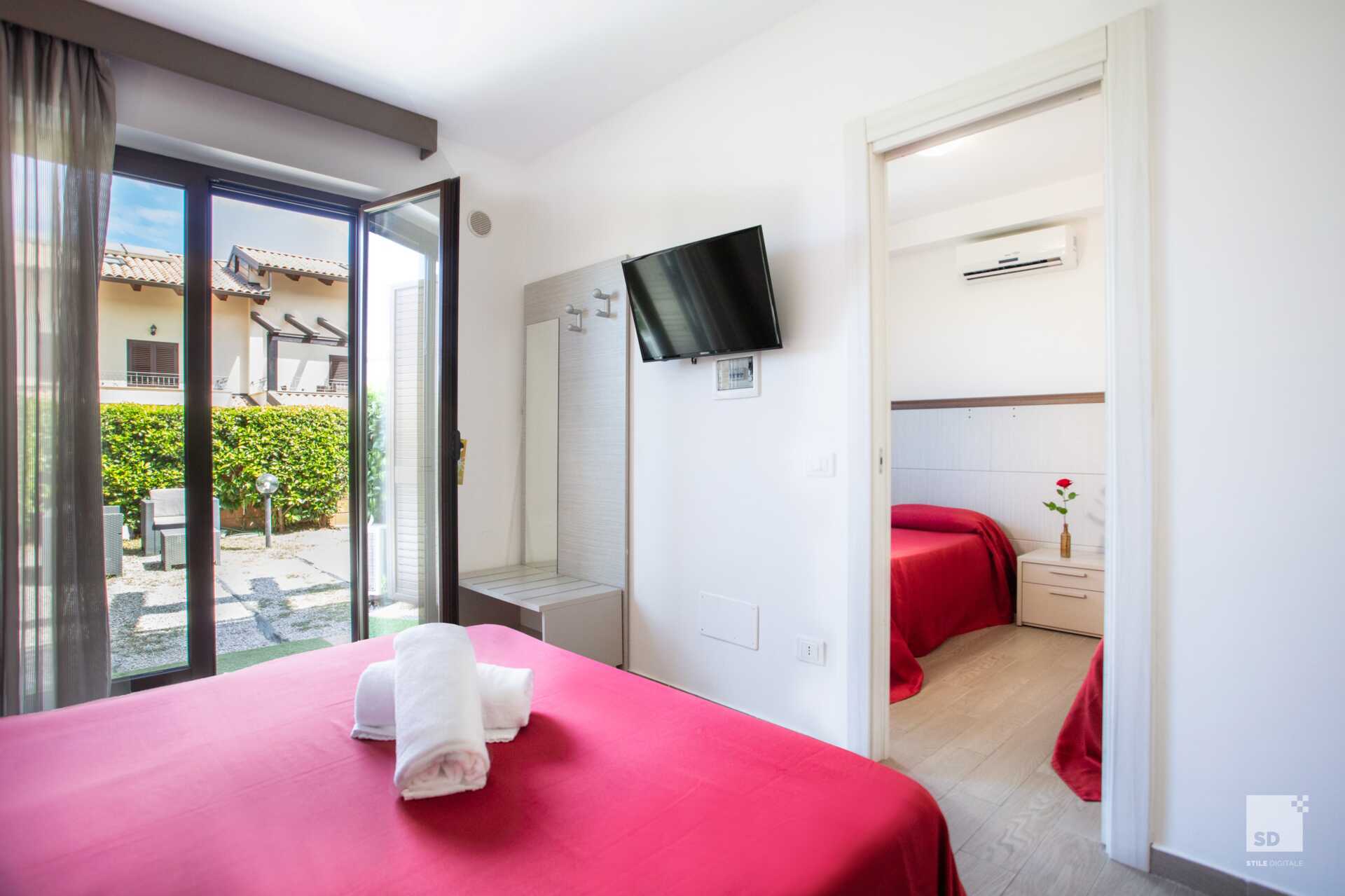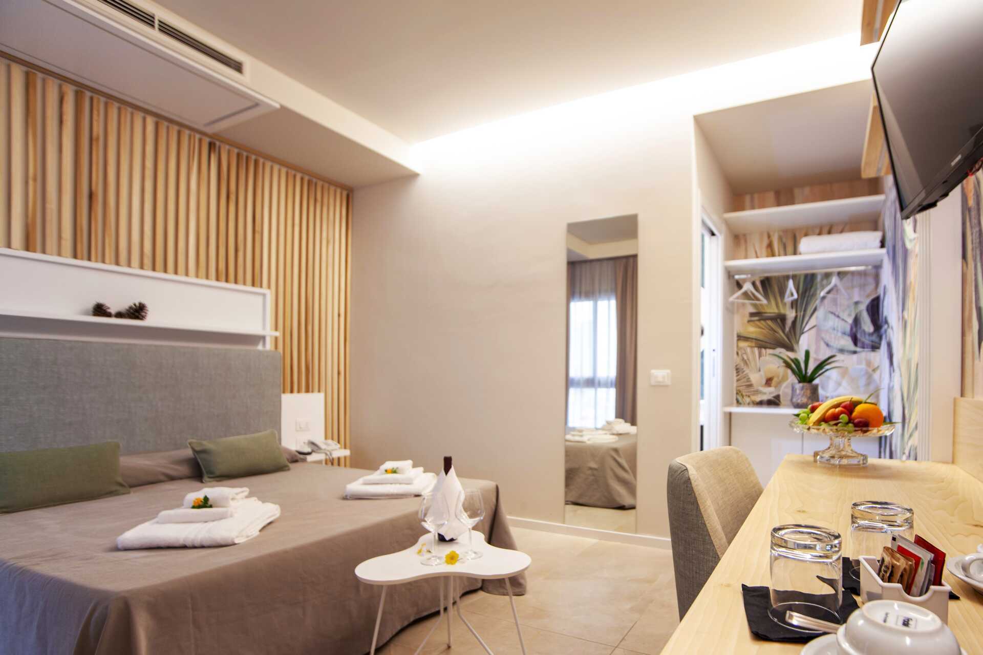 Dubbelrum med balkong eller terrass. En dubbelsäng eller två enkelsängar. Möjlighet till extrabäddar i bäddsoffa. Wifi, luftkonditionering och deponering ingår. Vattenkokare. Kylskåp. Tv med lokala kanaler. Hårtork. Badrum med badkar eller dusch samt wc. Städning 7 ggr/vecka.