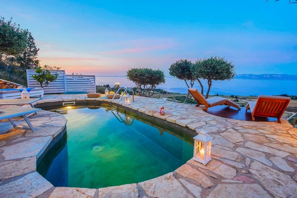 Inuti skapar det höga trätaket och de synliga bjälkarna en inbjudande atmosfär. Blå kakelplattor ger en touch av medelhavskänsla och kompletterar den otroliga havsutsikten genom de stora skjutdörrarna. Vardagsrummet med öppen planlösning har ett modernt, fullt utrustat kök, medan det mysiga vardagsrummet har en smart-TV och matplats. Två sovrum med queen size-säng erbjuder en bekväm natts sömn för upp till fyra gäster, och två separata duschrum utlovar föryngring efter soliga dagar.