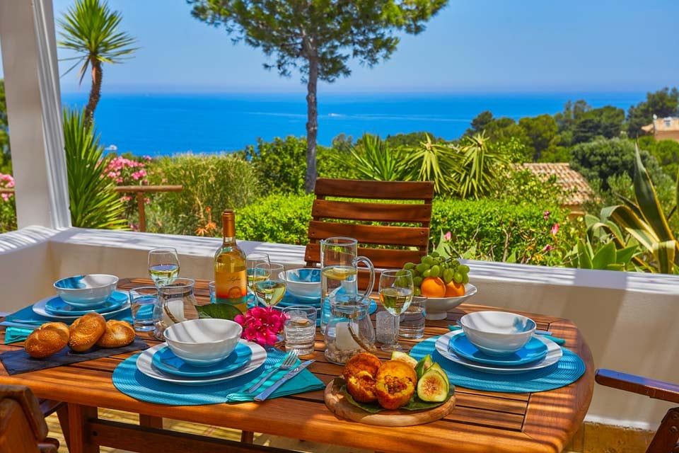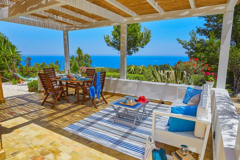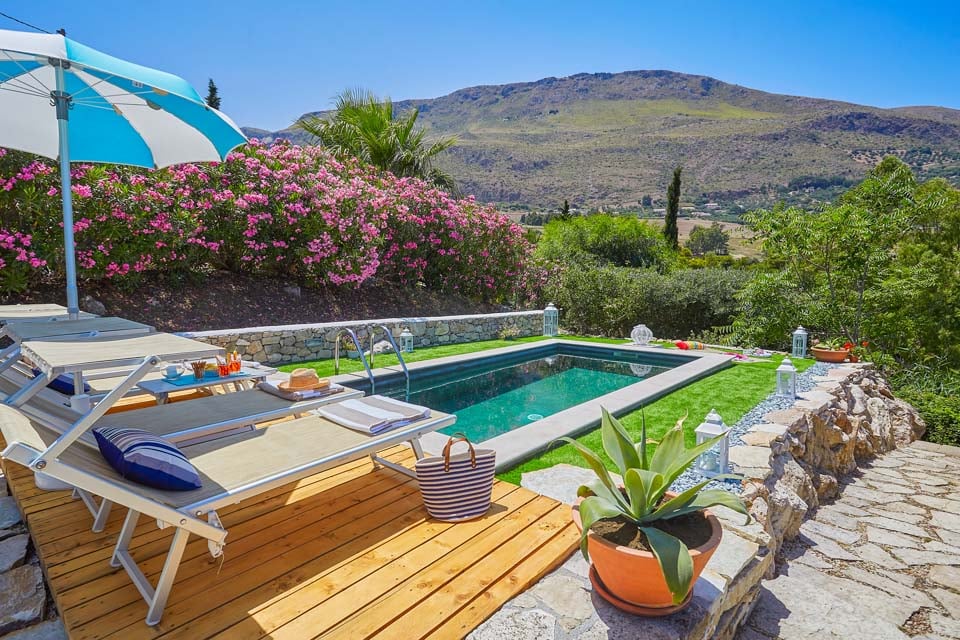Utanför har villan en exceptionell terrass med panoramautsikt över bergen, sluttningarna och den djupblå bukten Cala Mazzo di Sciacca. Den skuggiga verandan erbjuder gott om plats för måltider utomhus, komplett med ett stort matbord och gott om bekväma sittplatser. En andra veranda på baksidan av villan är utrustad med en portabel grill och ett handfat, perfekt för att laga färska måltider. Du hittar din privata pool inbäddad i en medelhavsträdgård, med en fantastisk utsikt över havet, solstolar och till och med en gräsmatta.