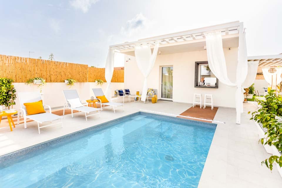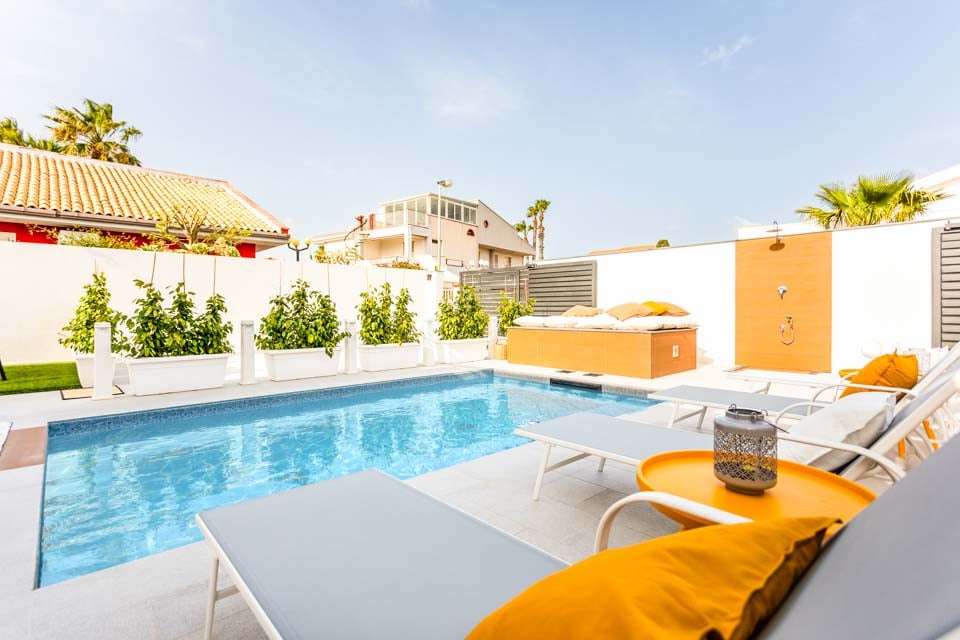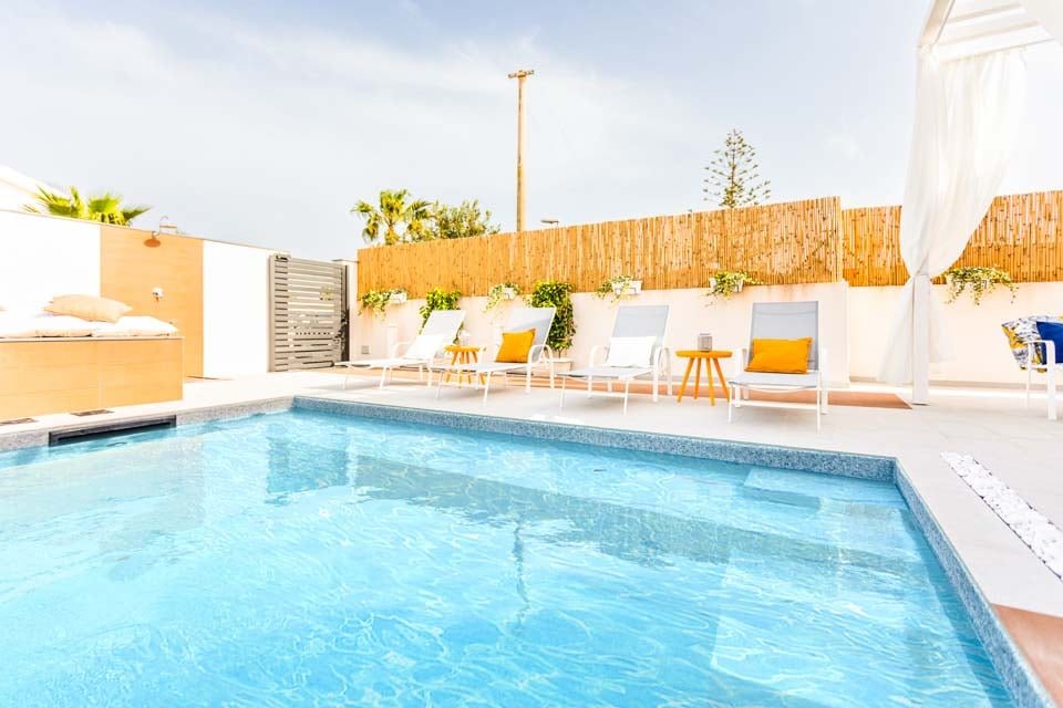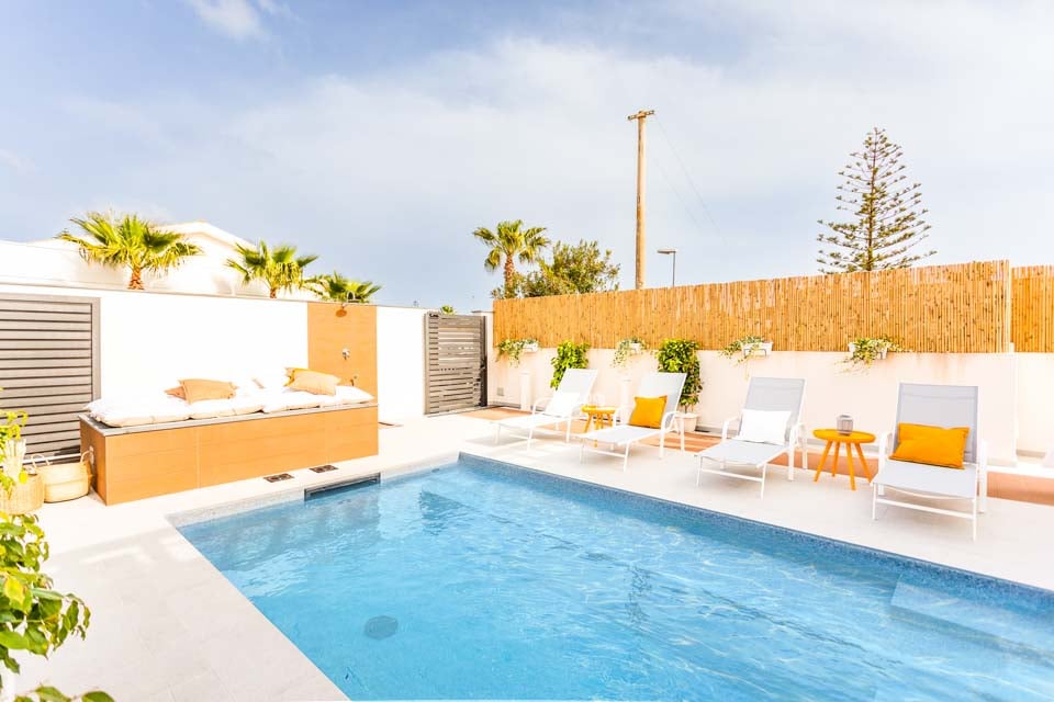 Utomhus väntar din privata pool – perfekt för ett morgondopp eller avkoppling efter en dag med utforskande av kusten. Poolhanddukar finns, så att du kan packa lätt och koppla av bekvämt.