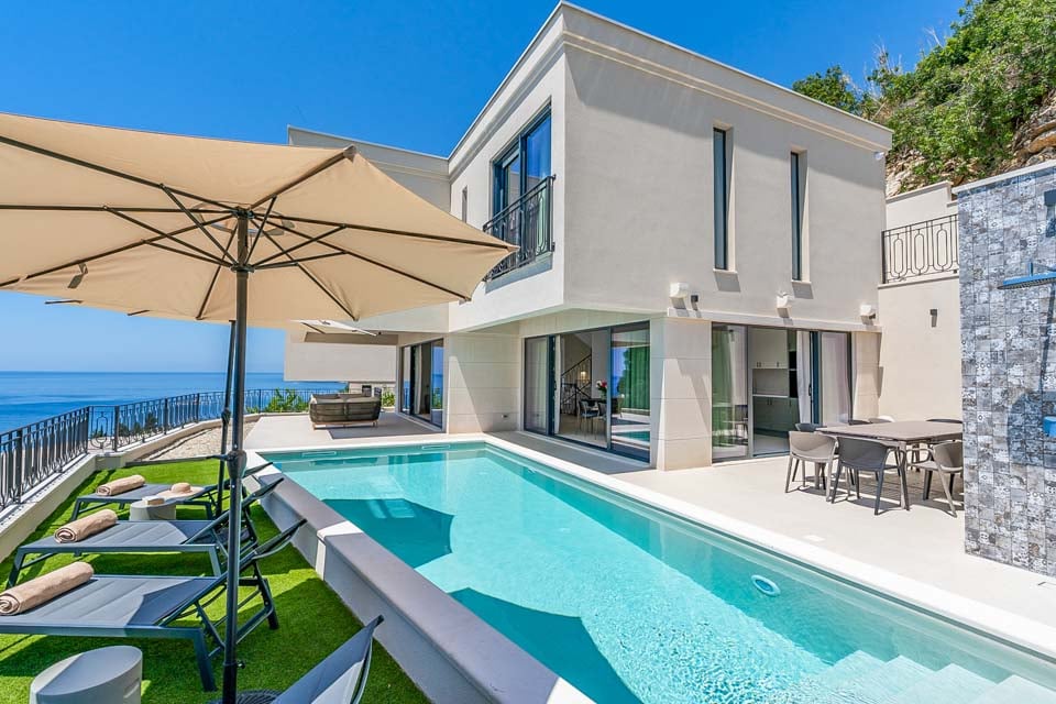 Öppen terrass, Matsal utomhus, Matmöjligheter utomhus, Matplats, Grill, Elektrisk grill, Solstolar, Parasoll, Trädgårdsmöbler, Havsutsikt
