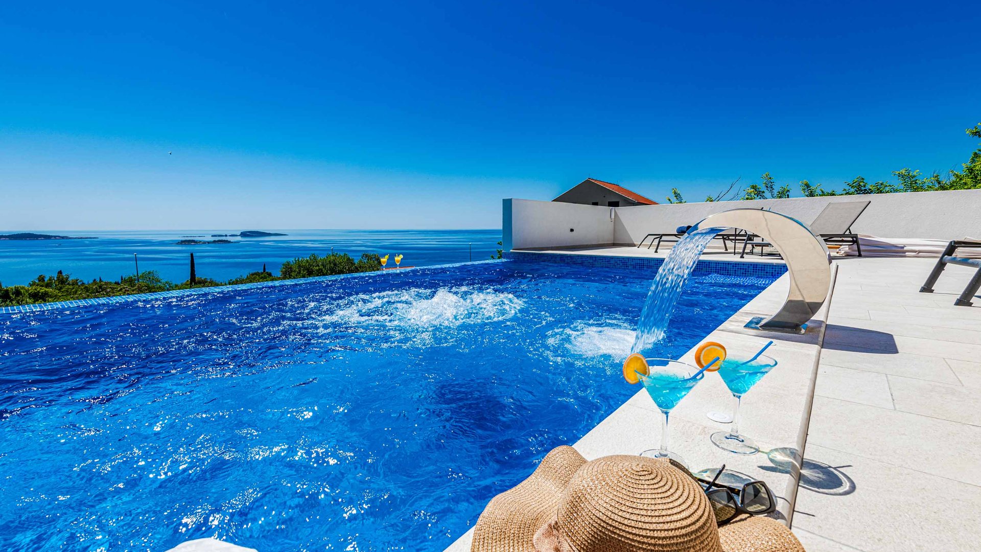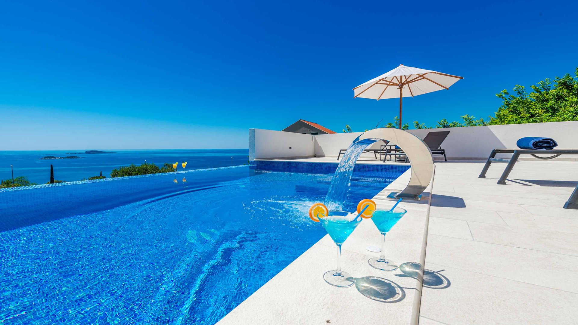 Moderna möbler och högkvalitativa material kompletterar den eleganta arkitekturen och den sofistikerade designen. Vid foten av detta extraordinära hus ligger den privata uppvärmda infinitypoolen, din plats på första parkett mot de fascinerande vågorna. Den lugna innergården är den perfekta platsen att varva ner på eftermiddagen i den bekväma soffan och njuta av havsbrisen under taket. När kvällen faller finns det inget bättre ställe för middag än matplatsen utomhus, komplett med grill.
