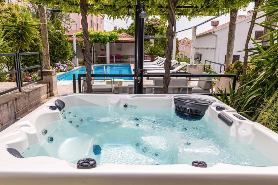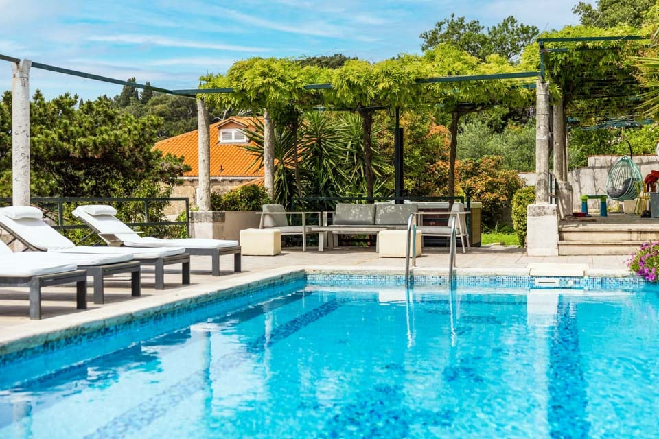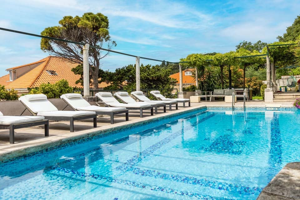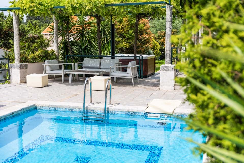 Den glittrande privata poolen är omgiven av en trädgård som blomstrar av liv, omgiven av livfulla gröna gräsmattor, slingrande träd, exotiska växter och frodiga buskar. Solstolarna är perfekta för en ljuvlig solbadning på dagen, samtidigt som du blickar ut över den fenomenala stadsbilden. Längst ner på terrassen finns en charmig loungedel och ett matbord i skuggan av grönskande växtlighet och blåregn sammanflätade i pergolan, så att du kan varva ner med en drink eller två i den varma kroatiska värmen.