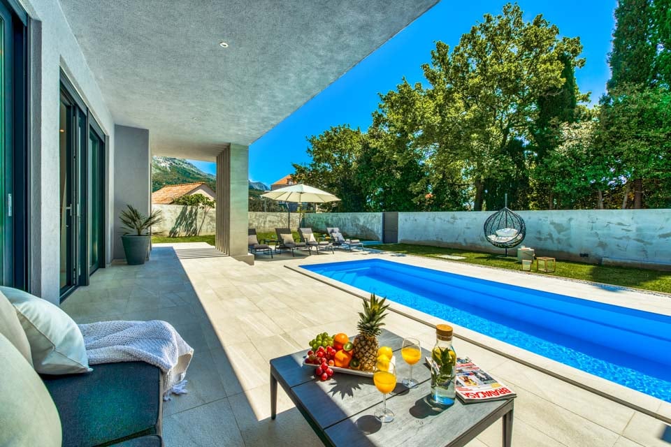 Kliv in i det ljusa, öppna vardagsrummet och njut av den eleganta omgivningen. Varje möbel i villan har handplockats för att gästerna ska känna sig speciella. Sjunk ner i den bekväma soffan med den stora platt-TV:n efter en lång dag i solen. Vardagsrummet är luftkonditionerat för att hålla dig sval och stora glasdörrar leder direkt ut till poolterrassen. I köket hittar du den eleganta designen och alla moderna bekvämligheter som behövs för att säkerställa att du får en smidig vistelse, inklusive diskmaskin och vinkyl! Båda sovrummen är ljusa och luftiga med samma coola design som löper genom hela villan. De har eget badrum, luftkonditionering och TV-apparater för att göra din vistelse så mycket bättre.