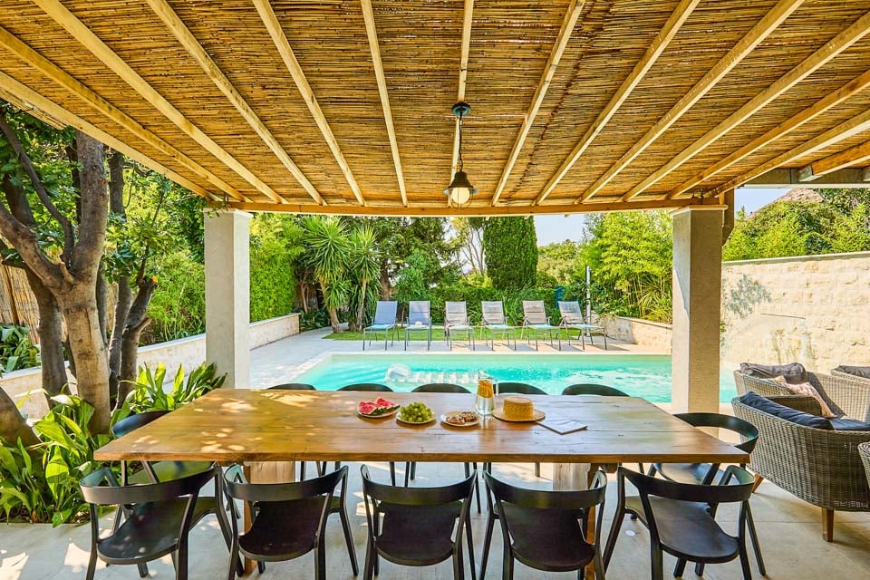 Uteserveringen är den perfekta flykten från stadens livliga gator, tropisk och lugn tack vare de omgivande stenmurarna och de frodiga buskagen. Den stora uppvärmda poolen är som gjord för en dag med simning, flyt och plask och har till och med hydromassage och motströmsström. Terrassen är beströdd med flera solstolar med fri utsikt mot himlen, så att du enkelt kan ladda upp dina sommarsolskydd. Verandan är den ultimata platsen för intima kvällar, med en bekväm soffgrupp och en intim matplats, som bäst avnjuts med ett glas bubbel medan man tittar på solnedgången. Med en utomhusgrill kan du laga till en festmåltid i solskenet med färska lokala ingredienser som finns i den närliggande mataffären.