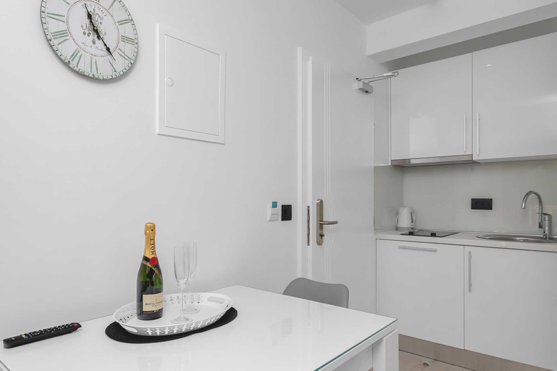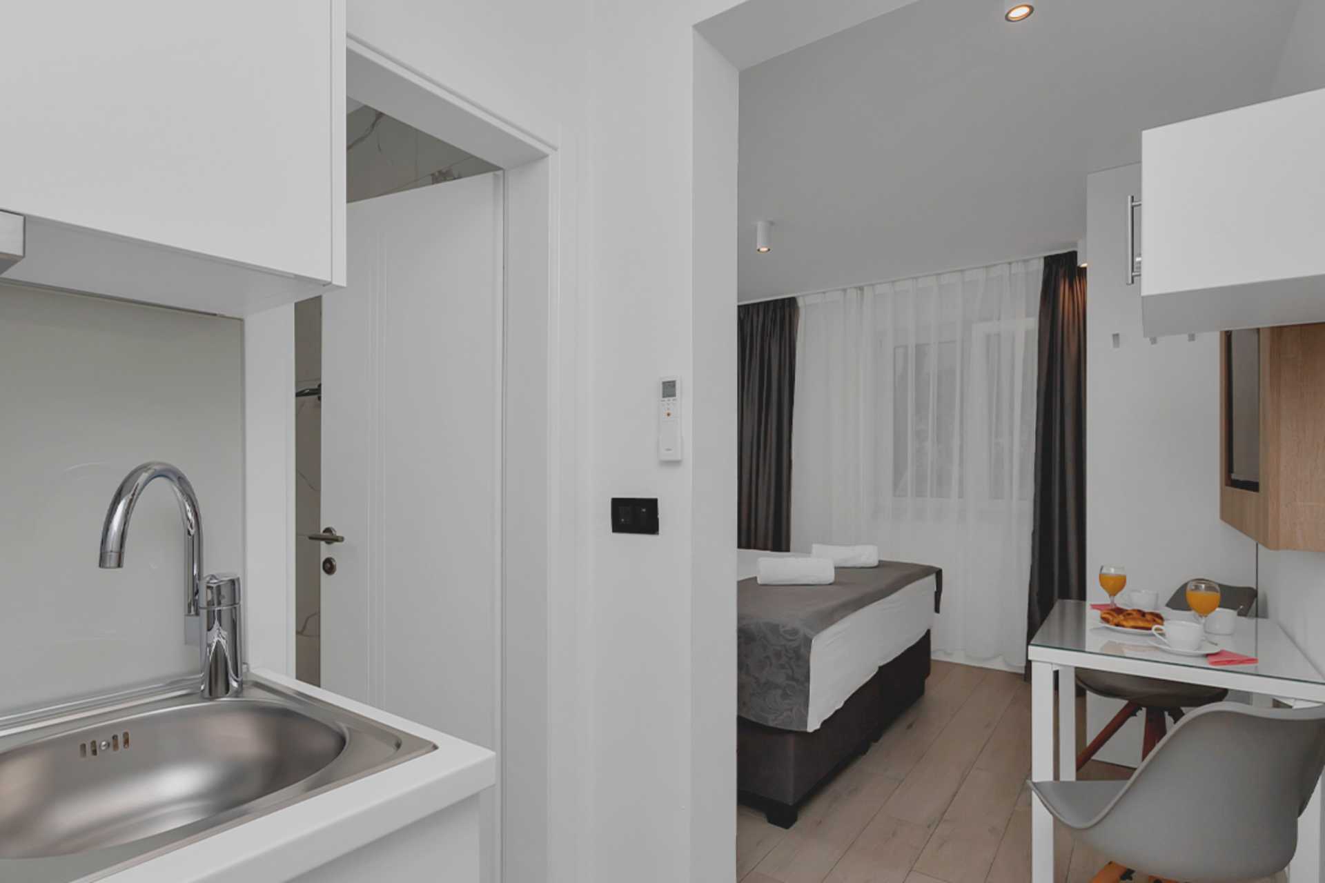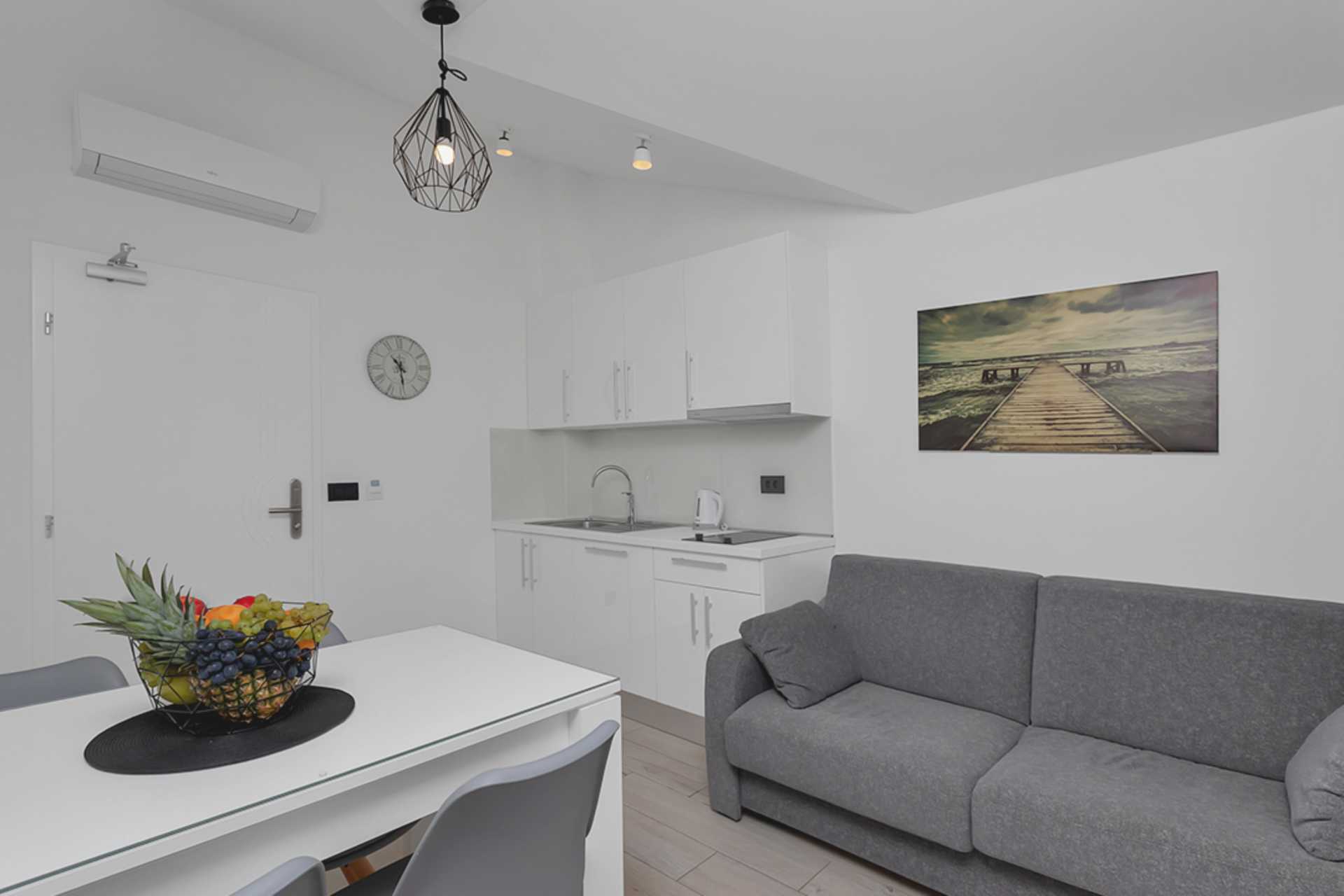 Enrumslägenhet utan uteplats. Kombinerat sovrum med minikök. En dubbelsäng eller två enkelsängar. Minikök med kokplattor, kylskåp, mikrovågsugn och enkel köksutrustning. Kaffemaskin - fyra kapslar ingår. Wifi, luftkonditionering och deponering ingår. Tv med internationella kanaler. Hårtork. Badrum med dusch och wc. Städning 3 ggr/vecka.