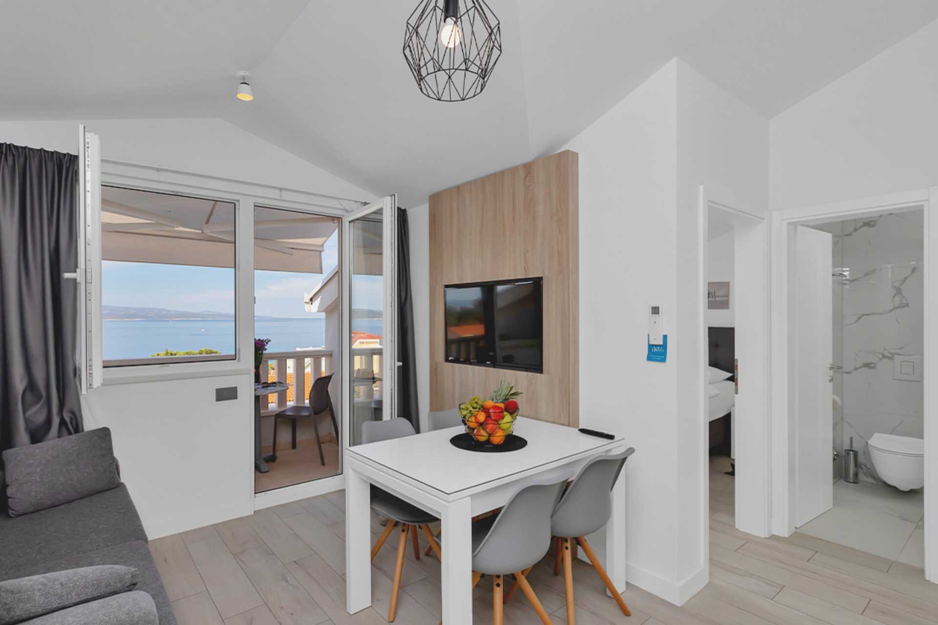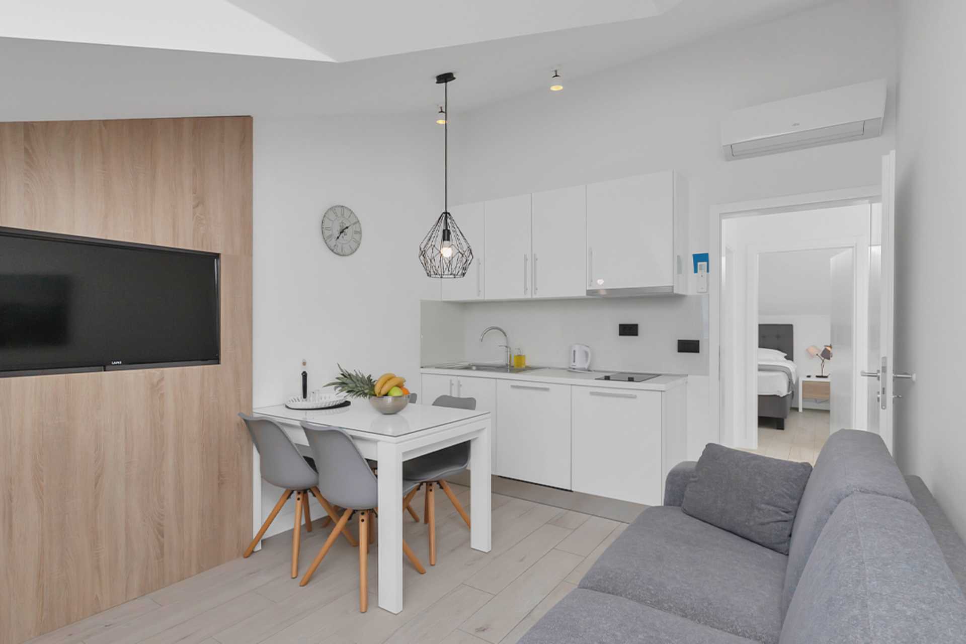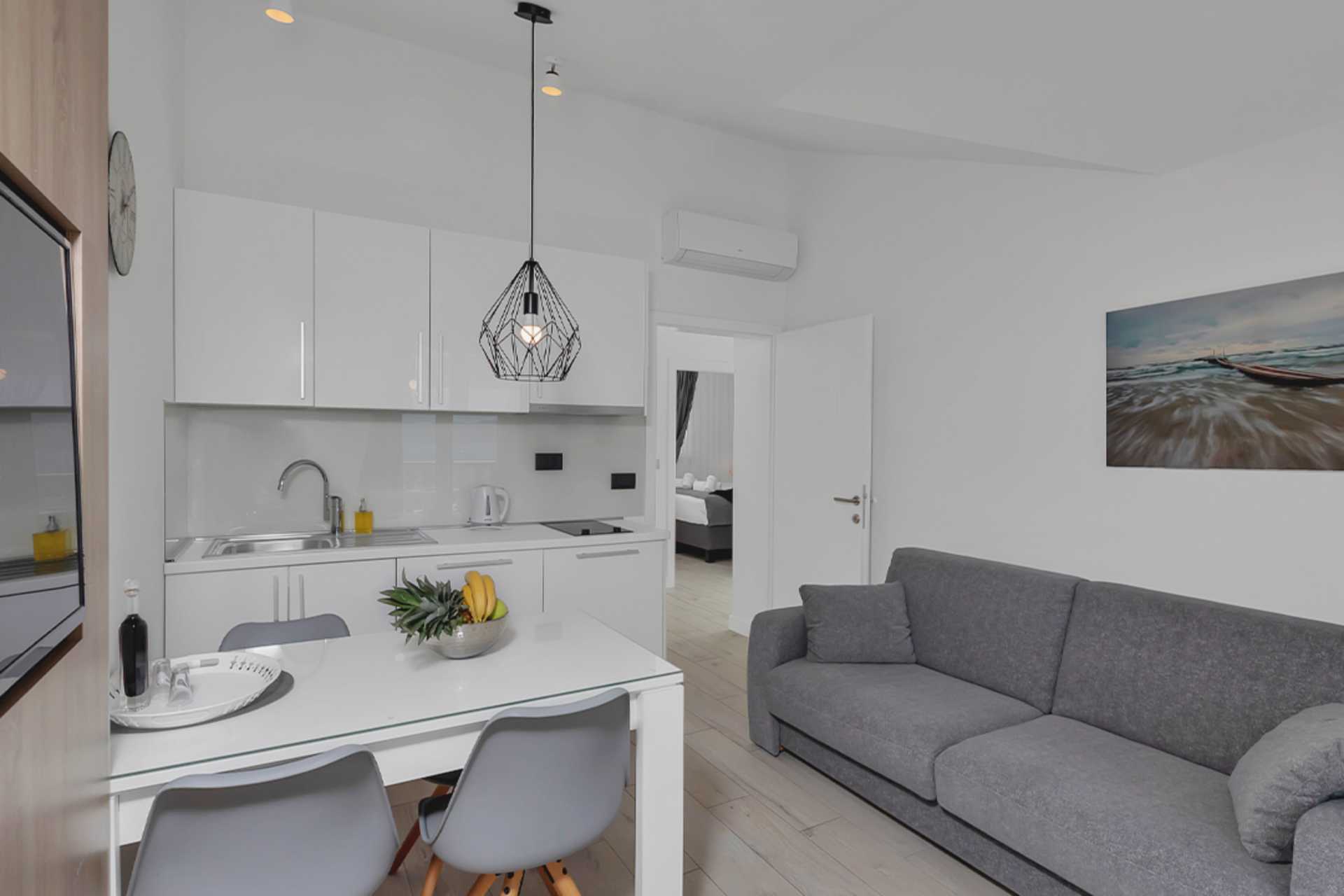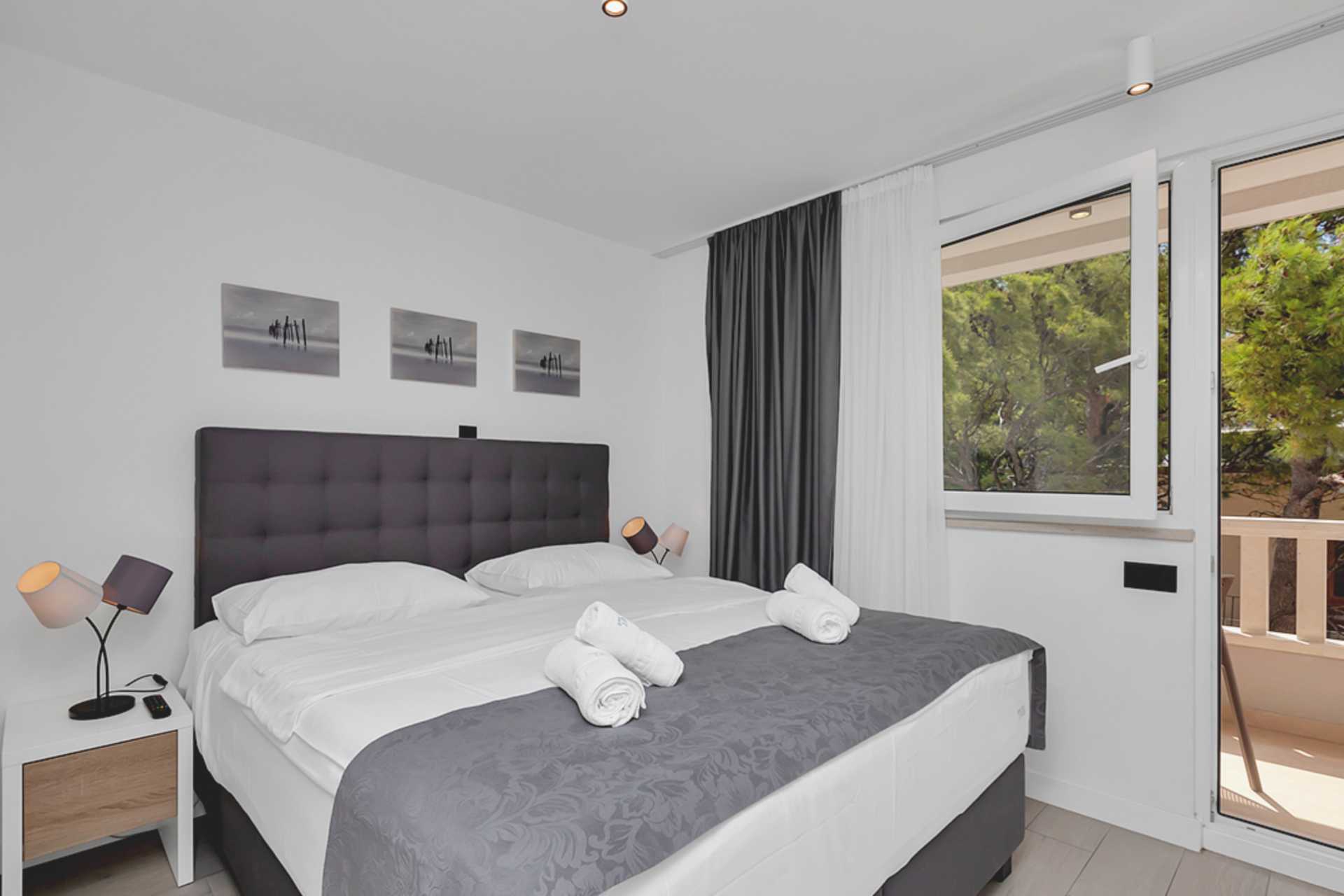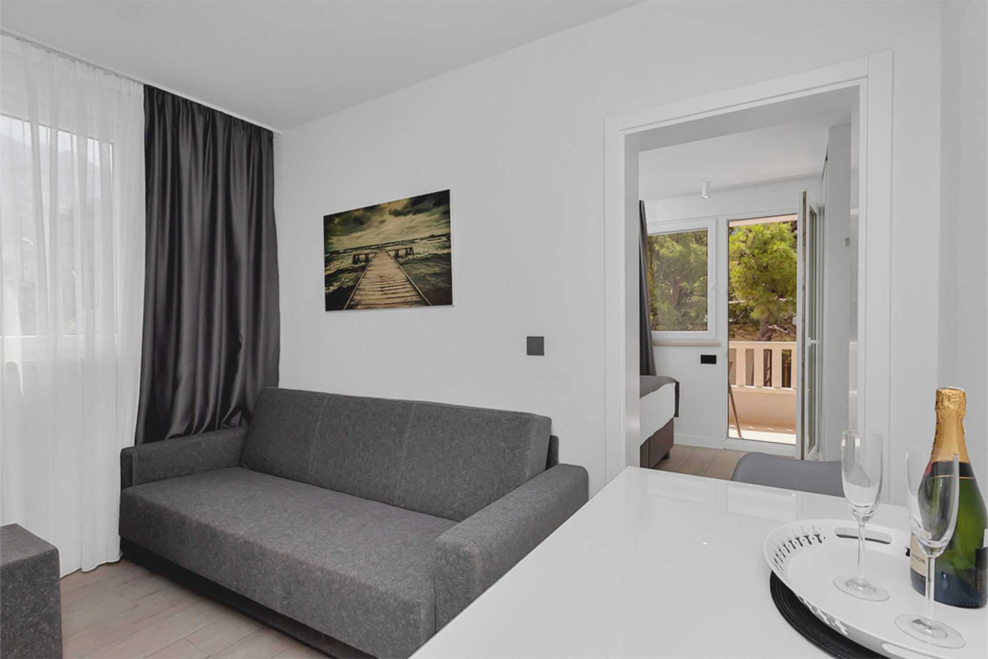 Trerumslägenhet med balkong eller markbalkong, vissa balkonger har havsutsikt eller begränsad havsutsikt. Lägenheter belägna högst upp i byggnaden har något lägre takhöjd. Två sovrum och ett kombinerat vardagsrum/minikök. En dubbelsäng eller två enkelsängar. Möjlighet till extrabäddar i bäddsoffa. Minikök med kokplattor, kylskåp, diskmaskin, mikrovågsugn och enkel köksutrustning. Kaffemaskin, fyra kapslar ingår. Wifi, luftkonditionering och deponering ingår. Tv med intrenationella kanaler. Hårtork. Badrum med dusch och wc. Städning 3 ggr/vecka.