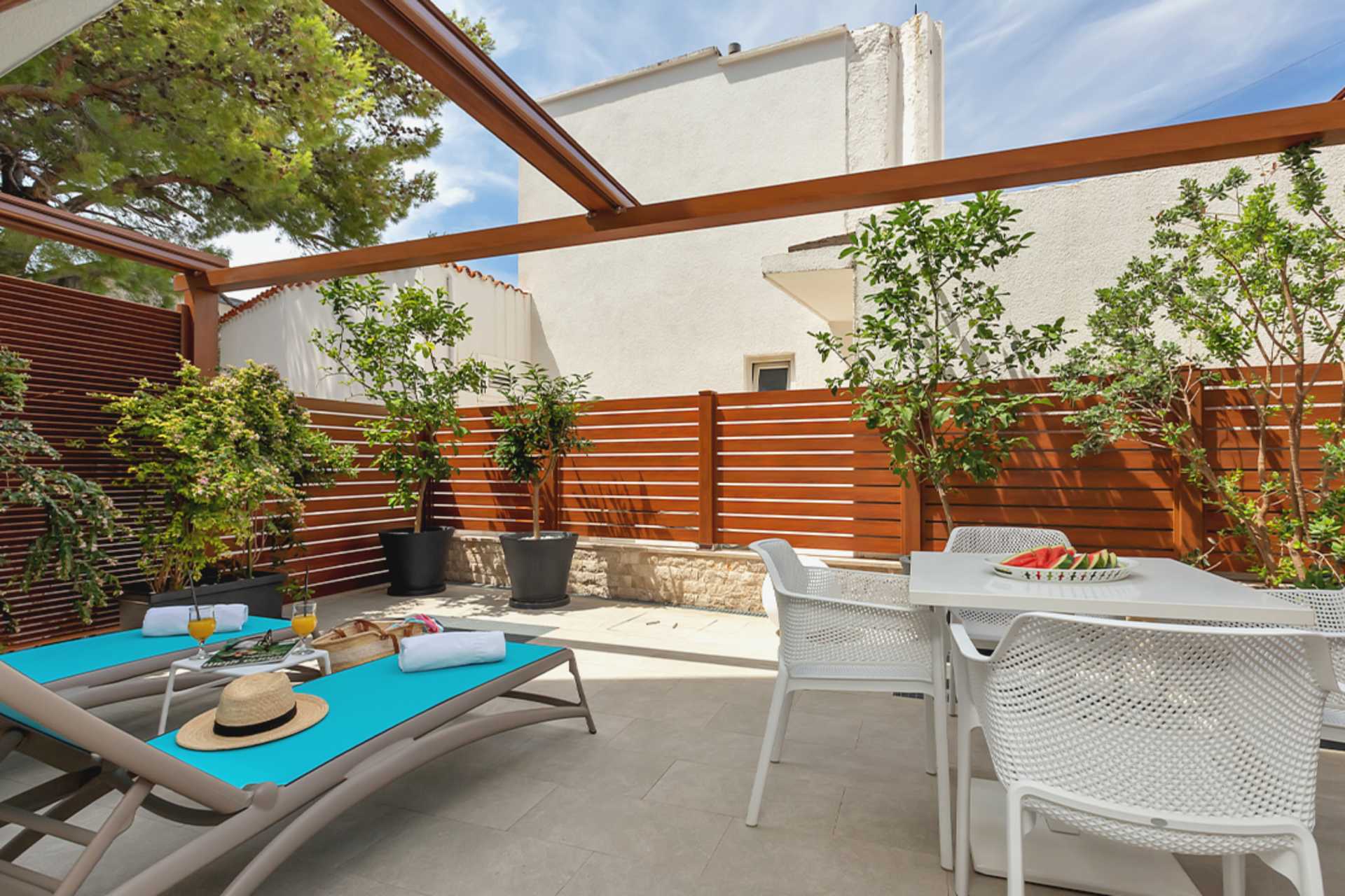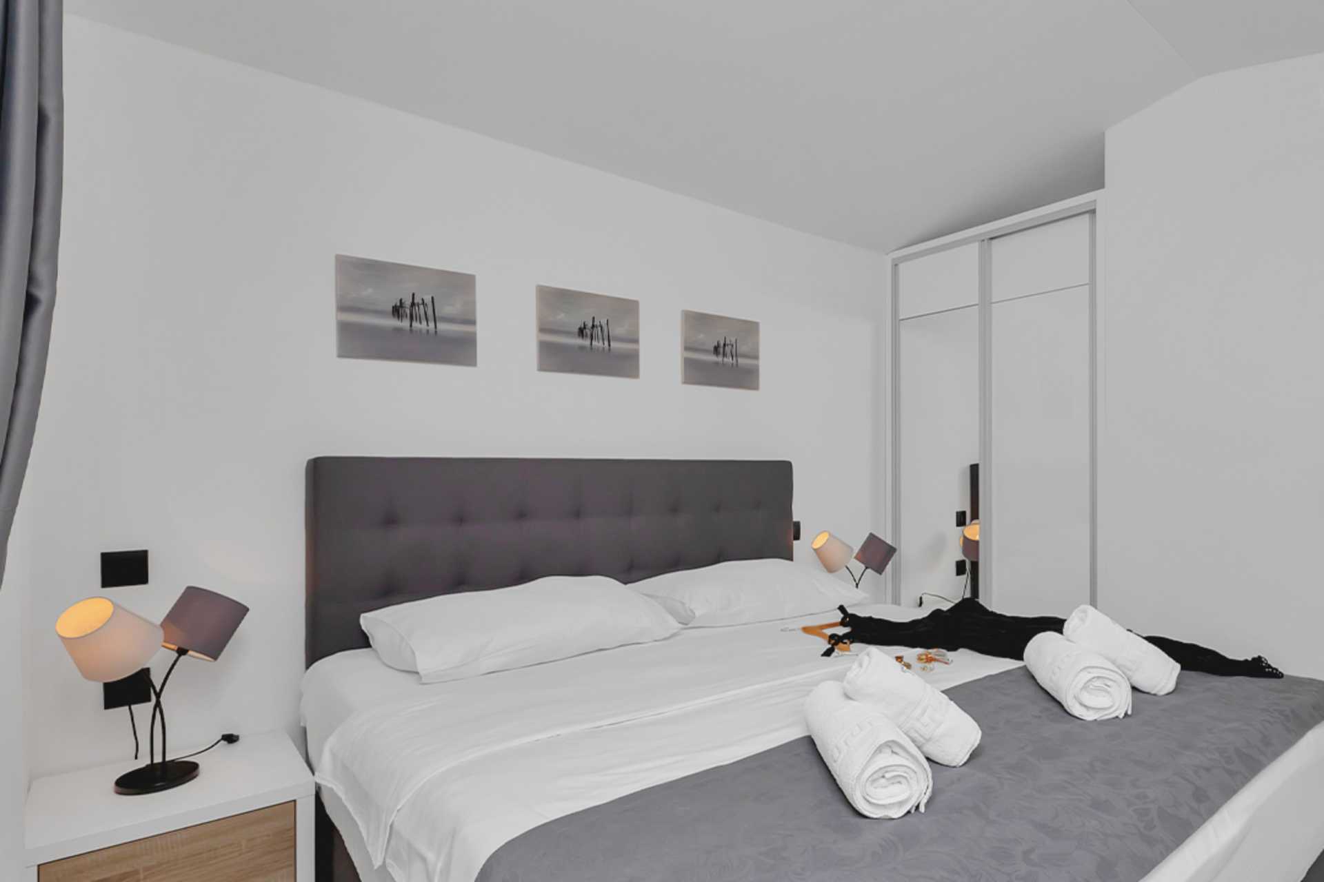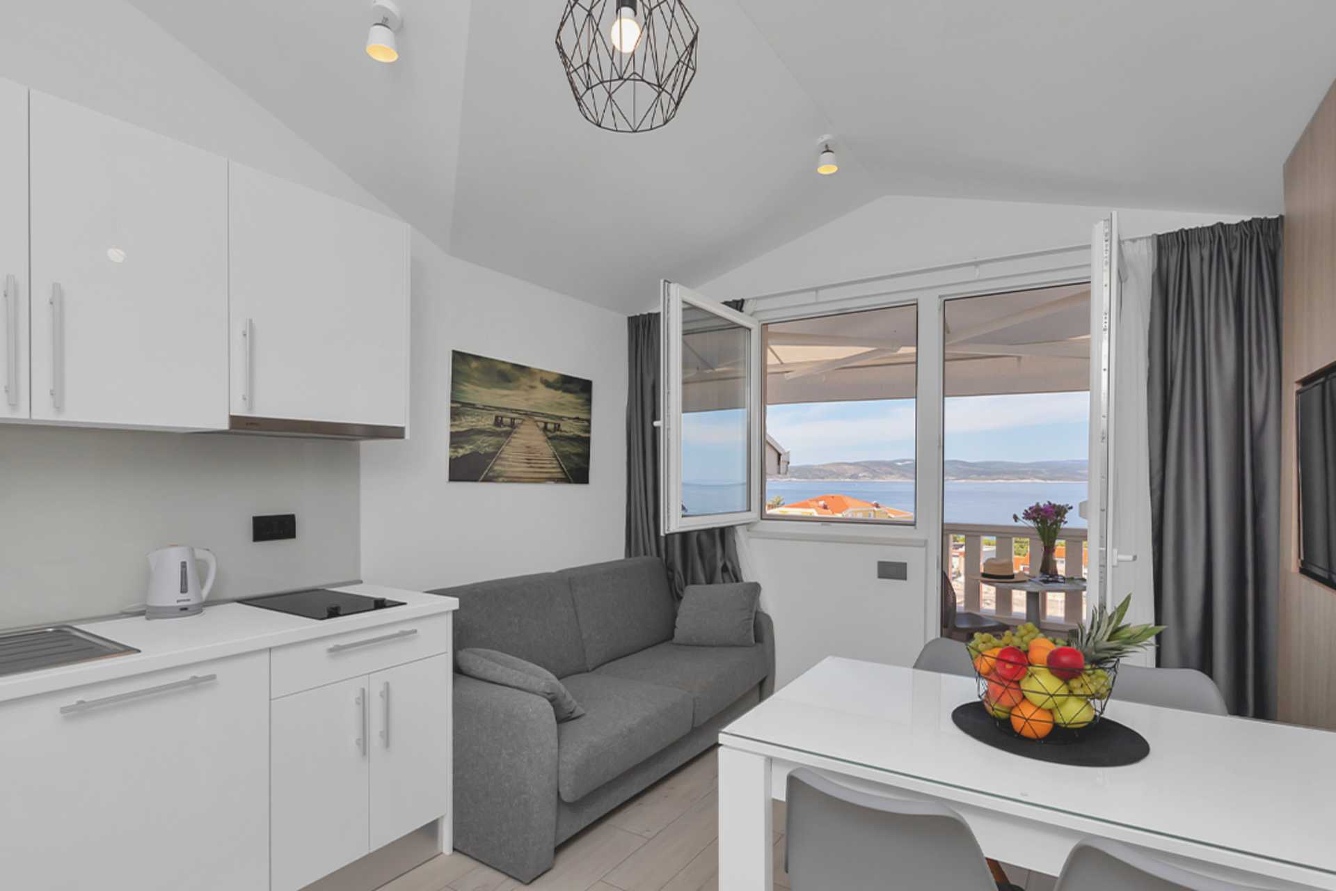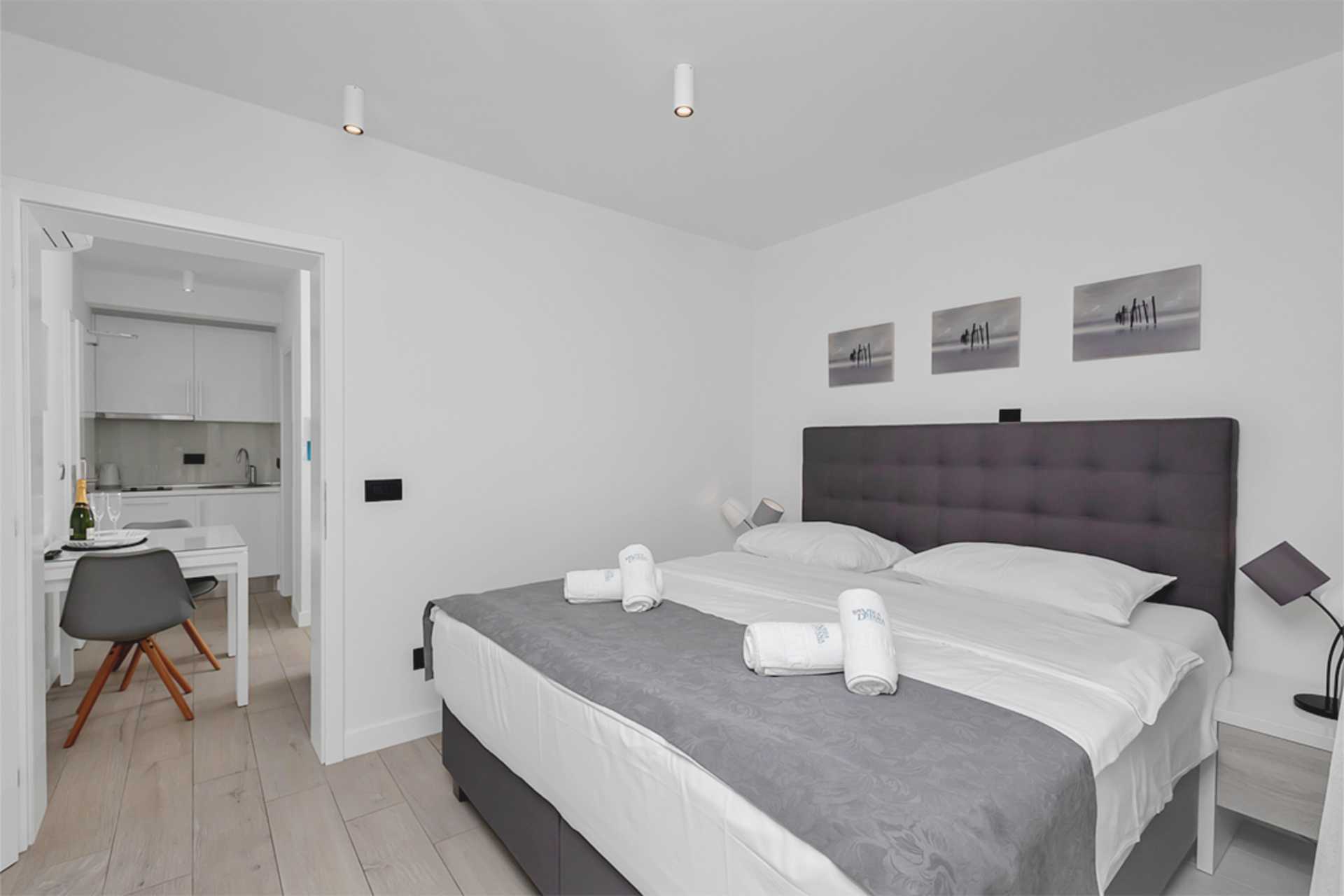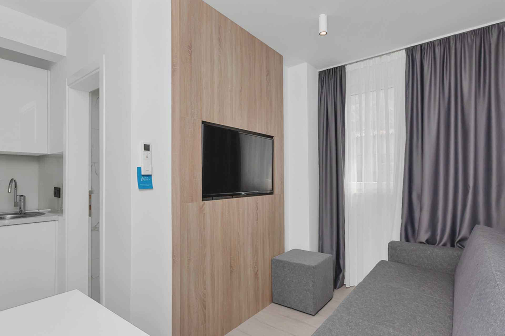 Trerumslägenhet med balkong eller markbalkong, vissa balkonger har havsutsikt eller begränsad havsutsikt. Lägenheter belägna högst upp i byggnaden har något lägre takhöjd. Två sovrum och ett kombinerat vardagsrum/minikök. En dubbelsäng eller två enkelsängar. Möjlighet till extrabäddar i bäddsoffa. Minikök med kokplattor, kylskåp, diskmaskin, mikrovågsugn och enkel köksutrustning. Kaffemaskin, fyra kapslar ingår. Wifi, luftkonditionering och deponering ingår. Tv med intrenationella kanaler. Hårtork. Badrum med dusch och wc. Städning 3 ggr/vecka.