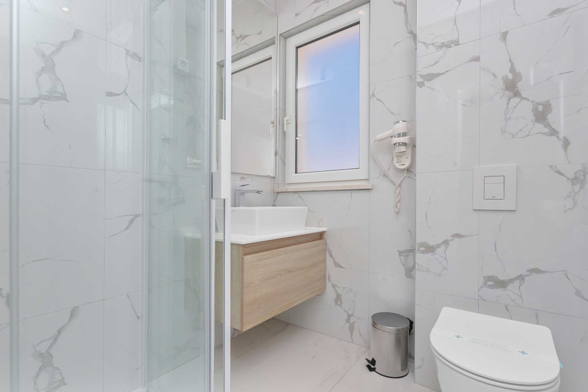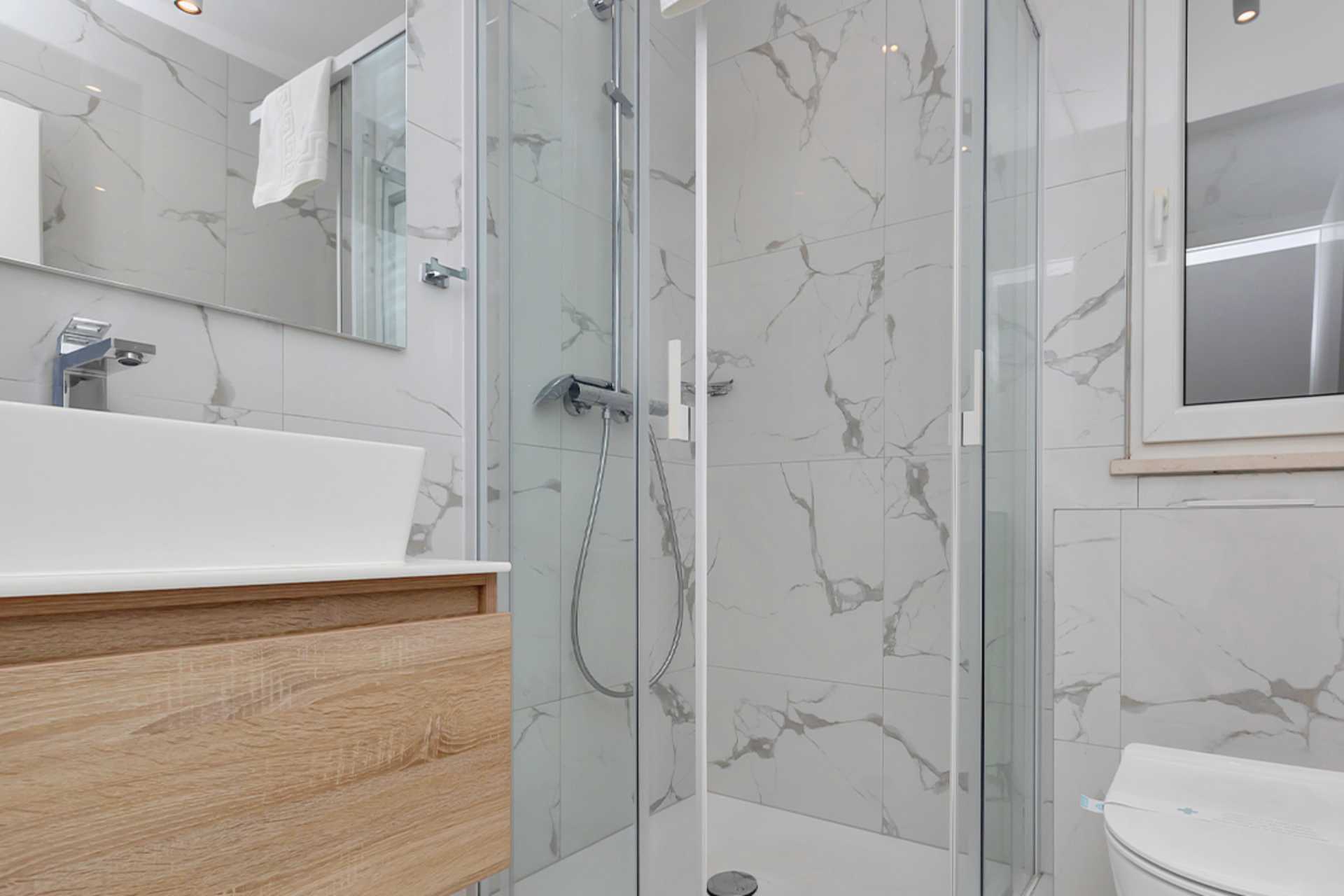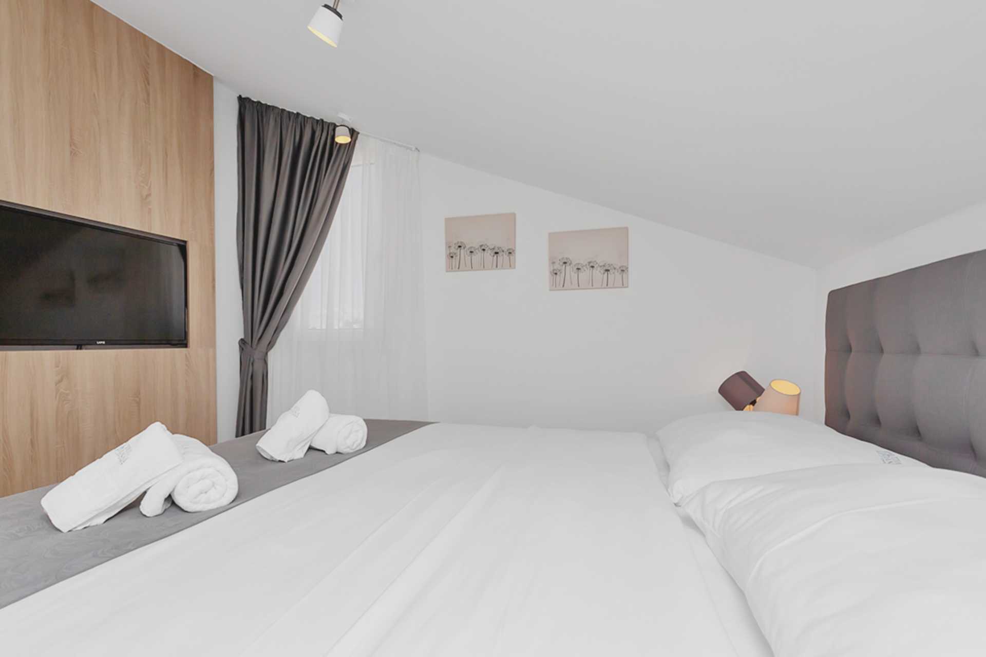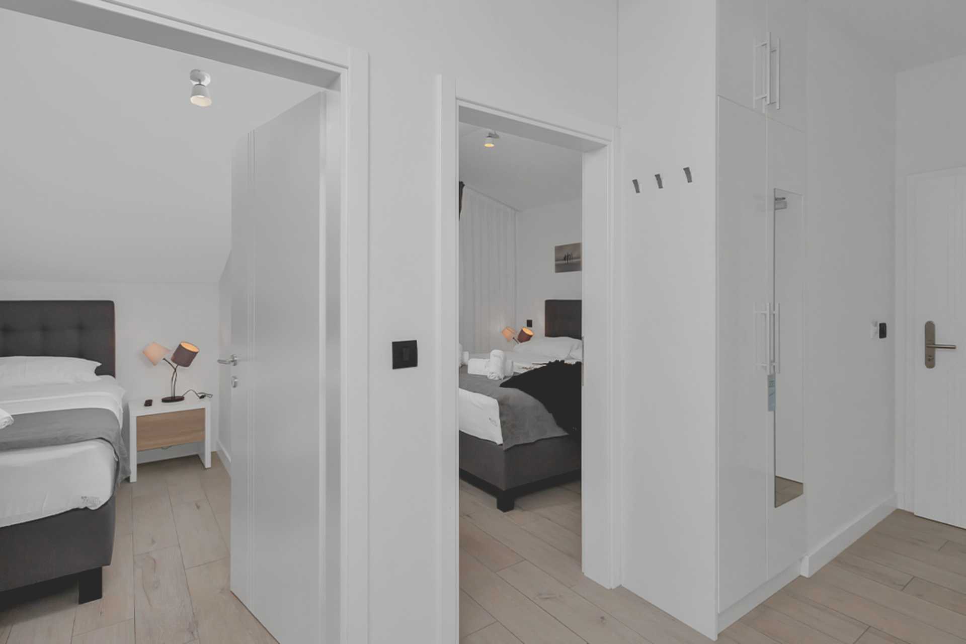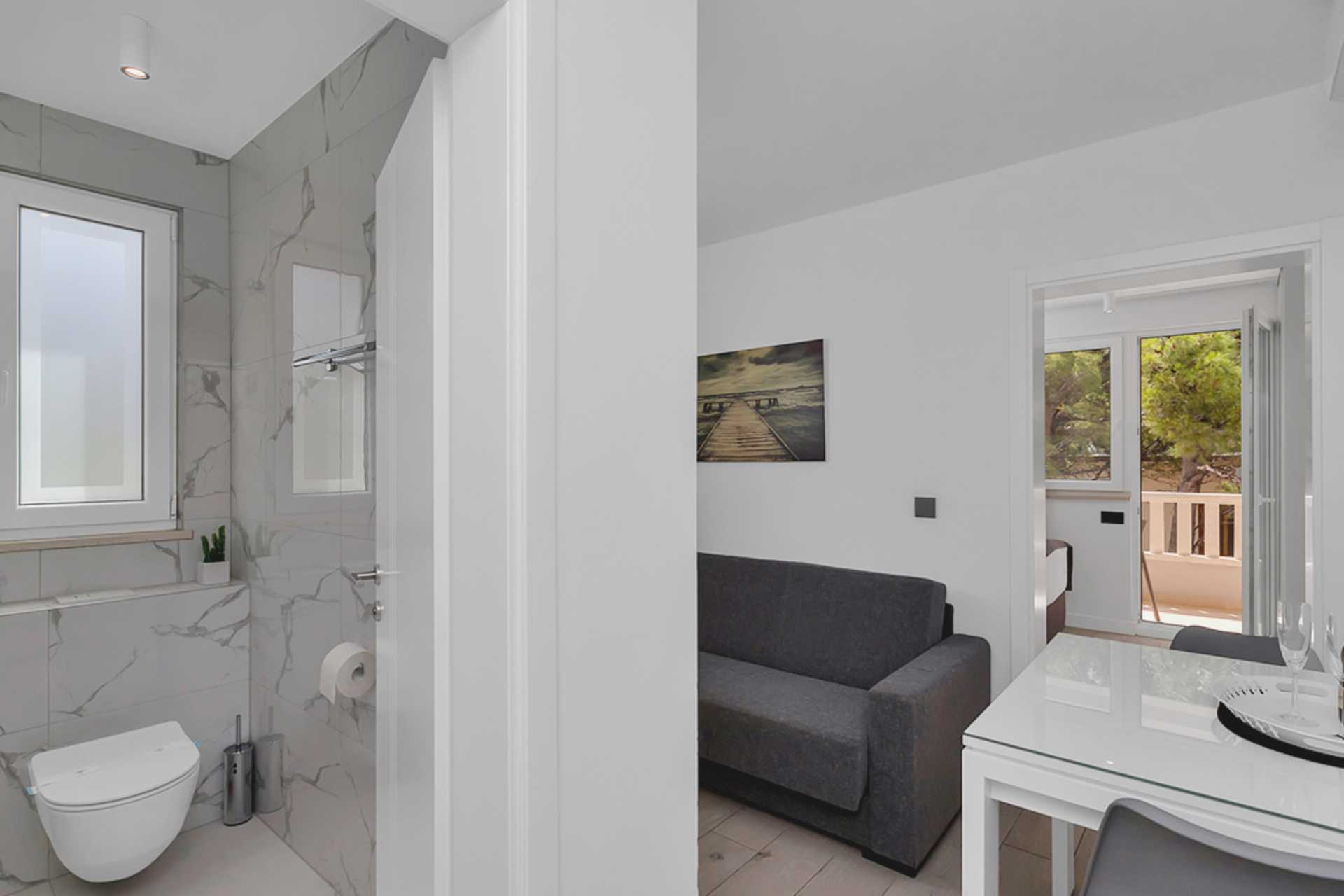 Trerumslägenhet med balkong eller markbalkong, vissa balkonger har havsutsikt eller begränsad havsutsikt. Lägenheter belägna högst upp i byggnaden har något lägre takhöjd. Två sovrum och ett kombinerat vardagsrum/minikök. En dubbelsäng eller två enkelsängar. Möjlighet till extrabäddar i bäddsoffa. Minikök med kokplattor, kylskåp, diskmaskin, mikrovågsugn och enkel köksutrustning. Kaffemaskin, fyra kapslar ingår. Wifi, luftkonditionering och deponering ingår. Tv med intrenationella kanaler. Hårtork. Badrum med dusch och wc. Städning 3 ggr/vecka.