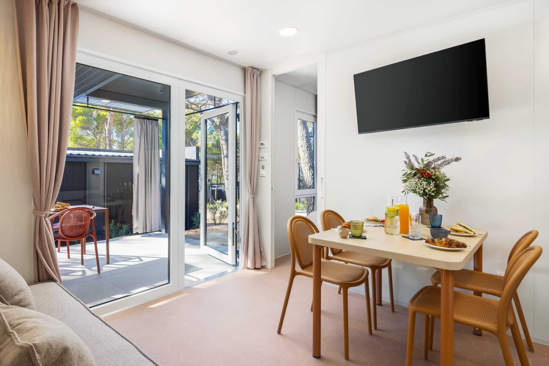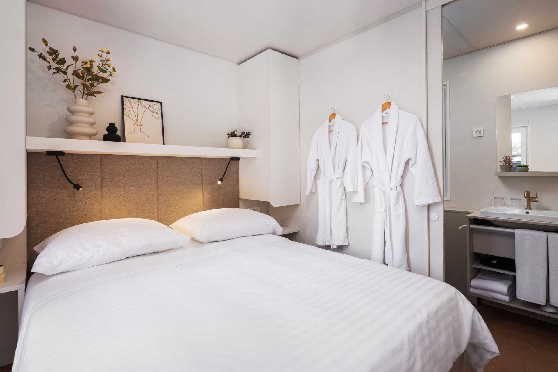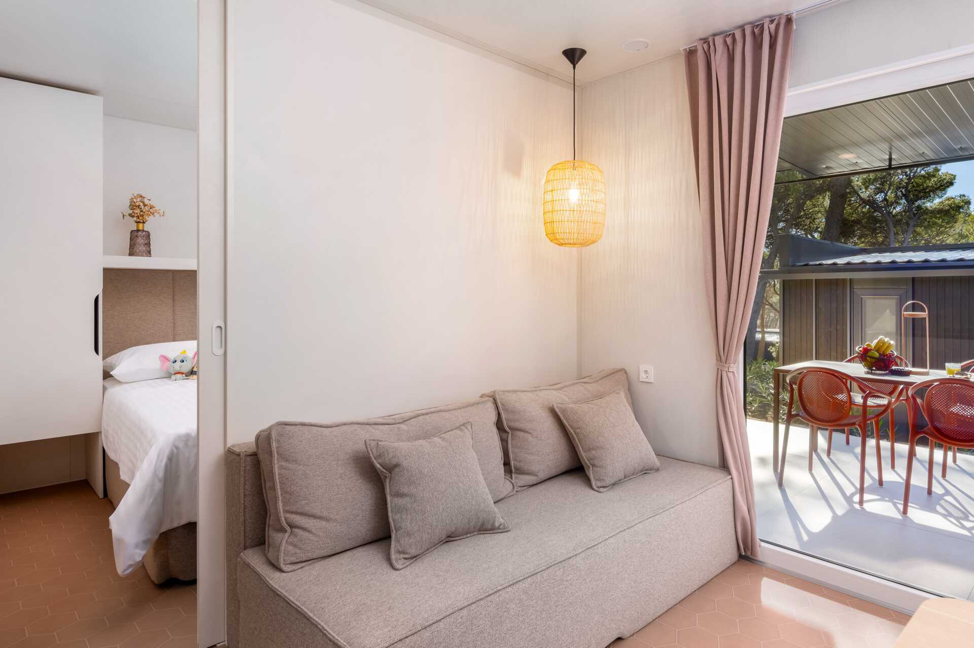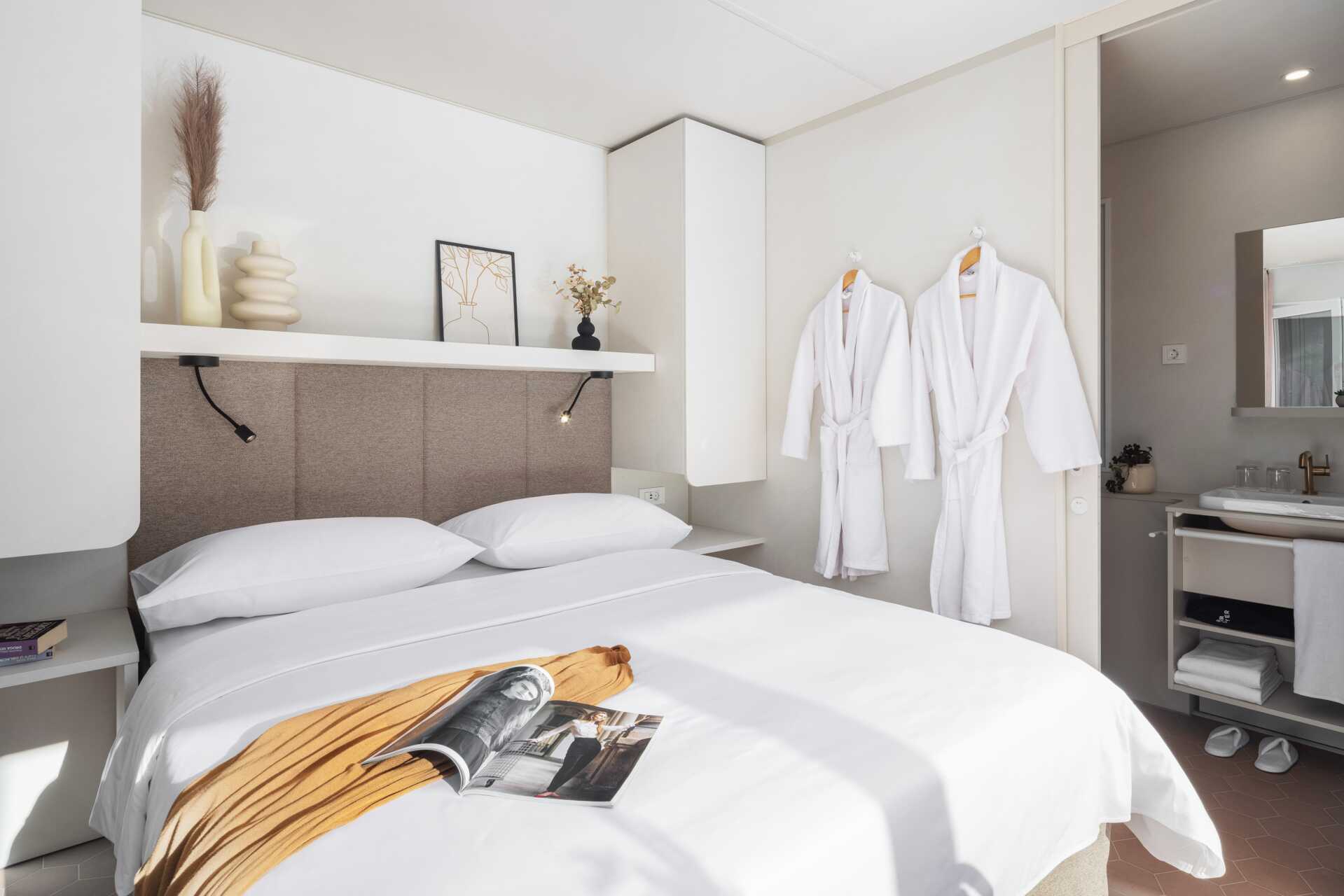Trerumslägenhet superior med markterrass med solsängar. Två separata sovrum, varav ett med en dubbelsäng och ett med två enkelsängar. Bäddsoffa. Köksdel med kylskåp, spis, vattenkokare, kaffemaskin, diskmaskin och enklare köksutrustning. Wifi, luftkonditionering och deponering ingår. Tv. Hårtork. Två badrum med bad/dusch och wc. Städning 1 gång per vecka. Barn under två år räknas in i max antal personer i rummet. Trerumslägenheter superior är belägna centralt på området, nära poolen och lekplatsen.