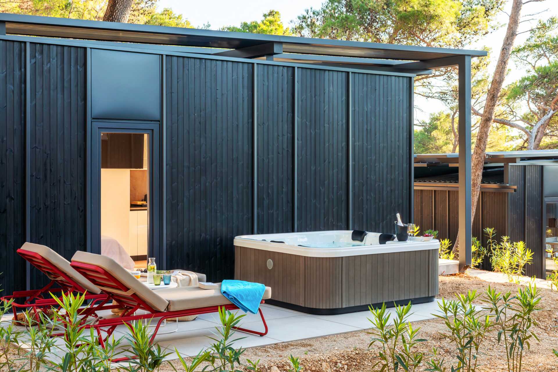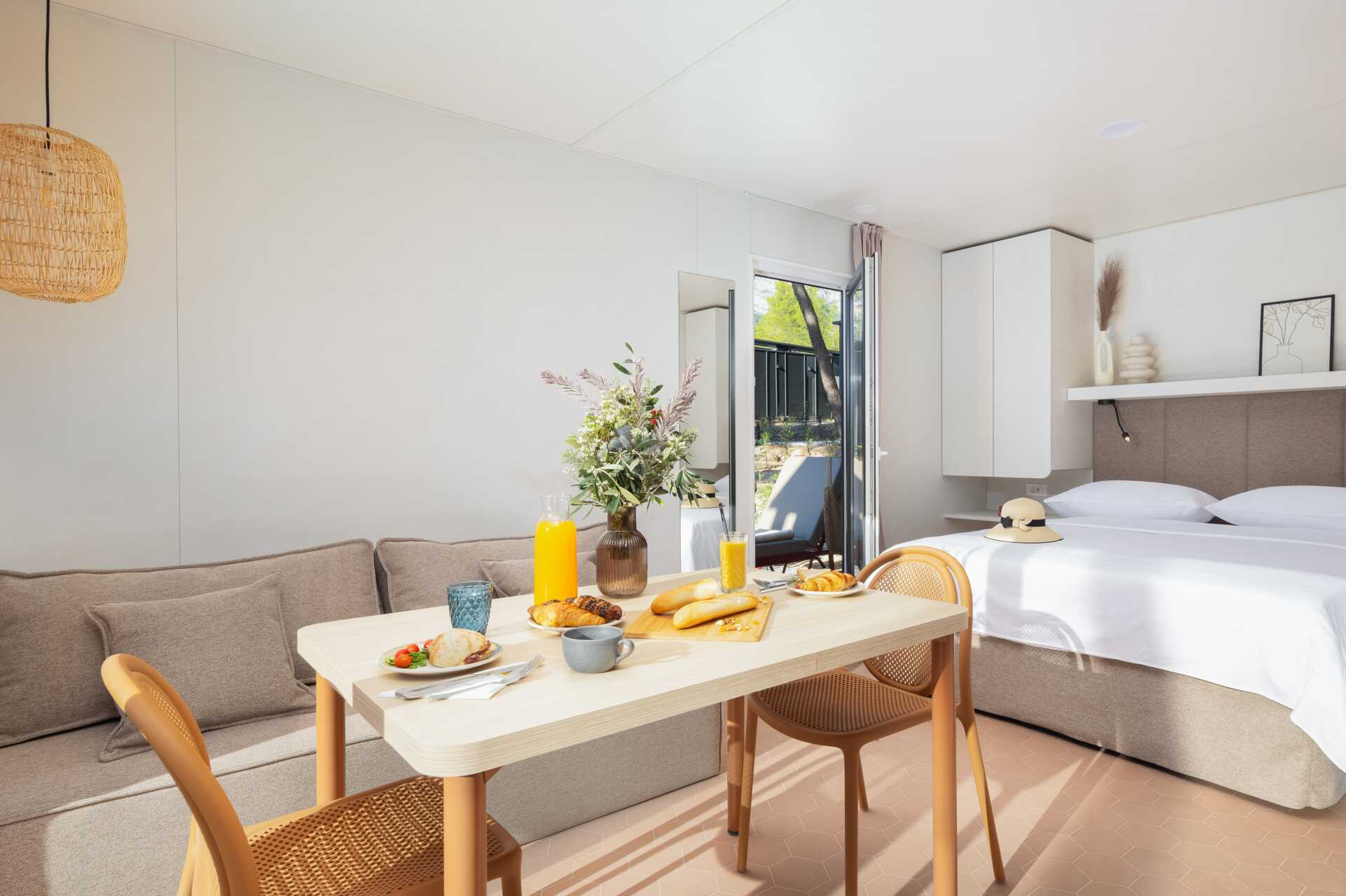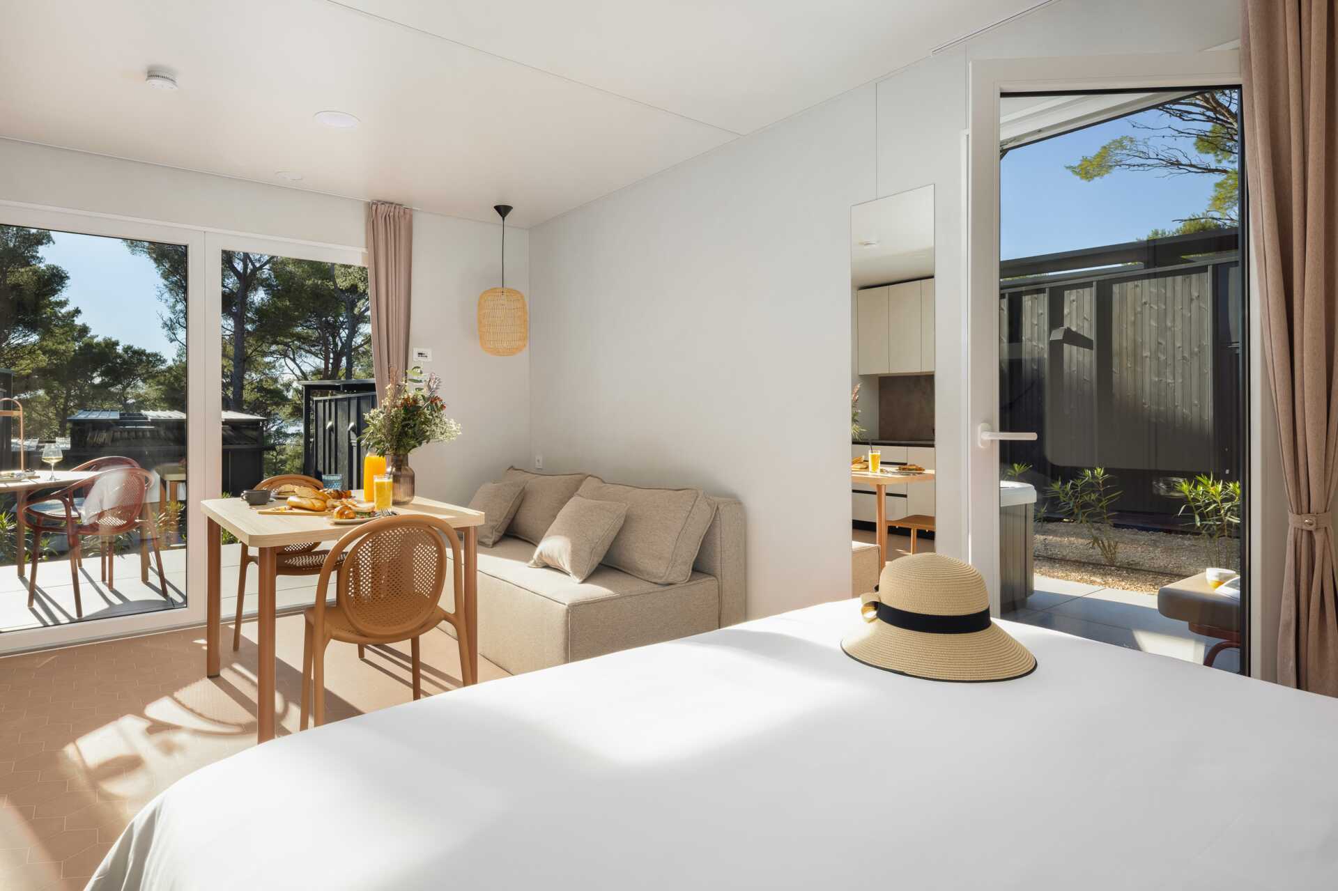 Enrumslägenhet med markterrass som har en privat jacuzzi. En dubbelsäng och en bäddsoffa. Köksdel med kylskåp, spis, diskmaskin, vattenkokare, kaffemaskin och enklare köksutrustning. Wifi, luftkonditionering och deponering ingår. Tv. Hårtork. Badrum med bad/dusch och wc. Städning 1 gång/vecka. Barn under två år räknas in i max antal personer i rummet.