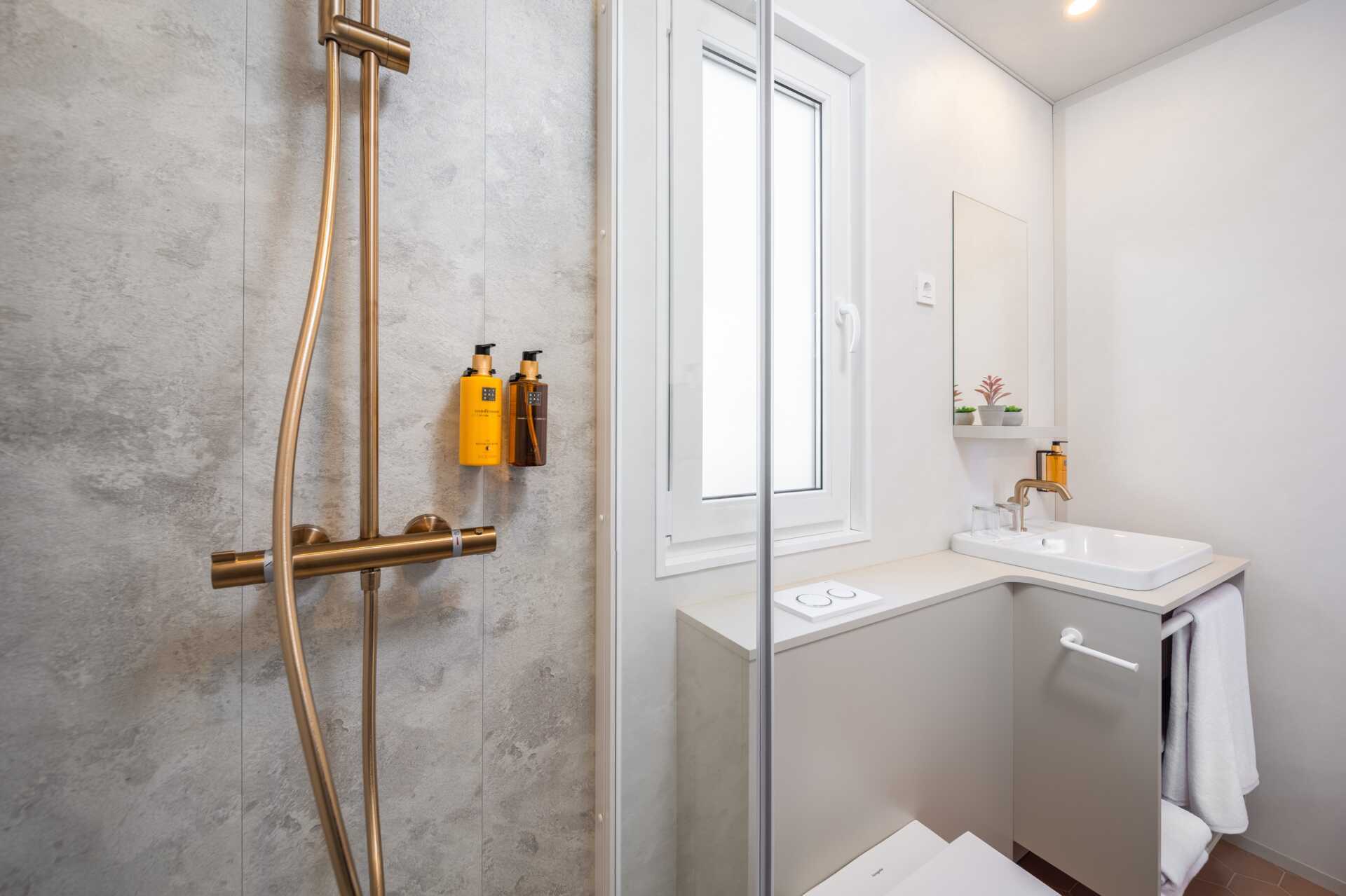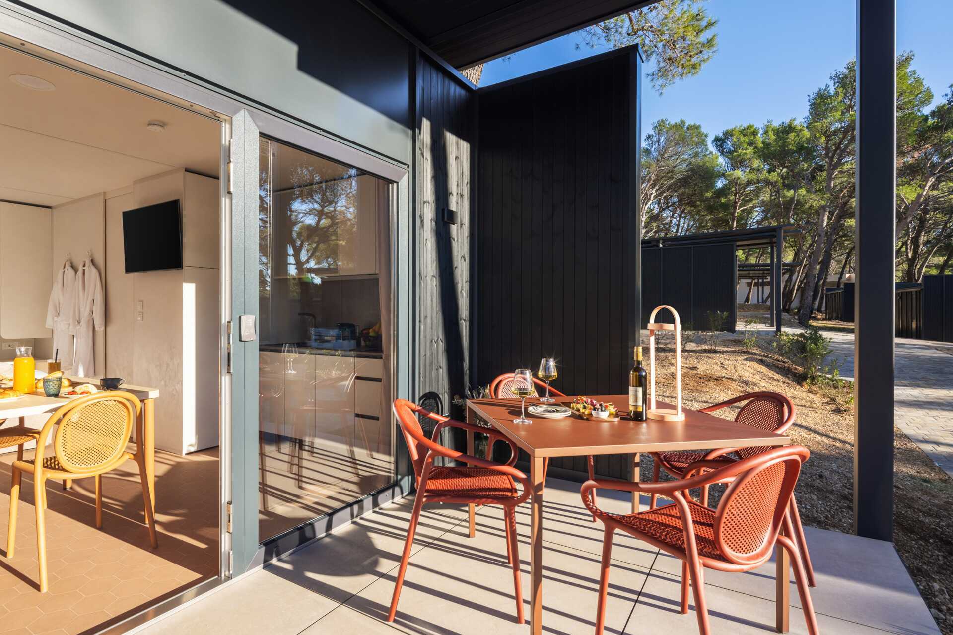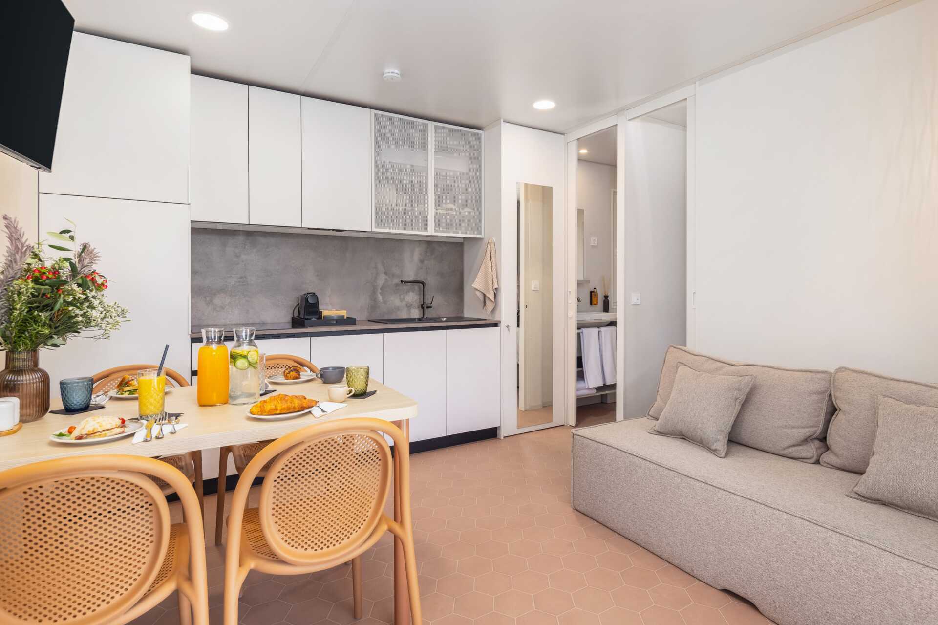 Enrumslägenhet med markterrass som har en privat jacuzzi. En dubbelsäng och en bäddsoffa. Köksdel med kylskåp, spis, diskmaskin, vattenkokare, kaffemaskin och enklare köksutrustning. Wifi, luftkonditionering och deponering ingår. Tv. Hårtork. Badrum med bad/dusch och wc. Städning 1 gång/vecka. Barn under två år räknas in i max antal personer i rummet.