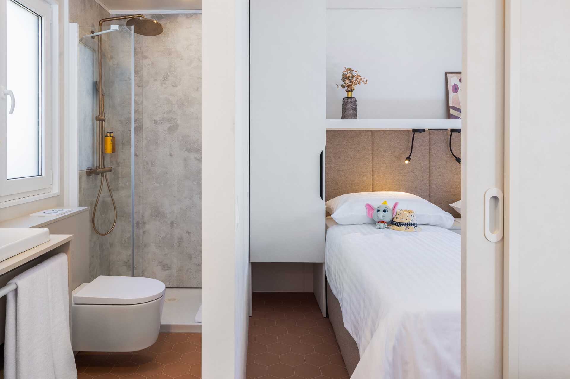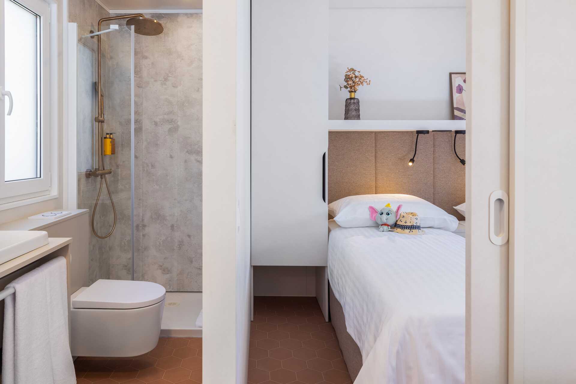Trerumslägenhet med markterrass med solsängar. Två separata sovrum, varav ett med en dubbelsäng och ett med två enkelsängar. Bäddsoffa. Köksdel med kylskåp, spis, vattenkokare, kaffemaskin, diskmaskin och enklare köksutrustning. Wifi, luftkonditionering och deponering ingår. Tv. Hårtork. Två badrum med bad/dusch och wc. Städning 1 gång per vecka. Barn under två år räknas in i max antal personer i rummet.