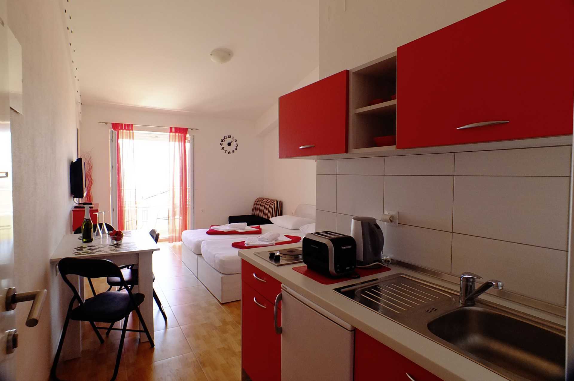 Enrumslägenhet med balkong eller markterrass. Balkongerna kan vara i olika storlek, vissa har begränsad havsutsikt och vissa vetter mot havet men har inte havsutsikt - havet skymtas på avstånd mellan husen. Sovrum kombinerat med minikök. En dubbelsäng. Möjlighet till extrabädd i bäddsoffa. Minikök med kylskåp, kokplattor, vattenkokare och enkel köksutrustning. Wifi, luftkonditionering och deponering ingår. Tv med internationella kanaler. Badrum med dusch samt wc. Städning 6 ggr/vecka.