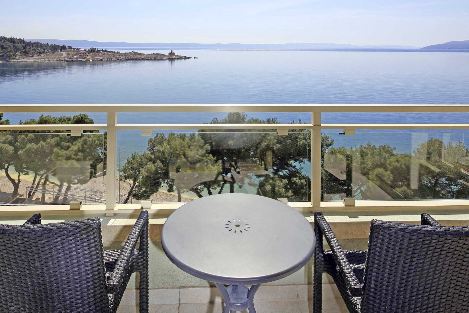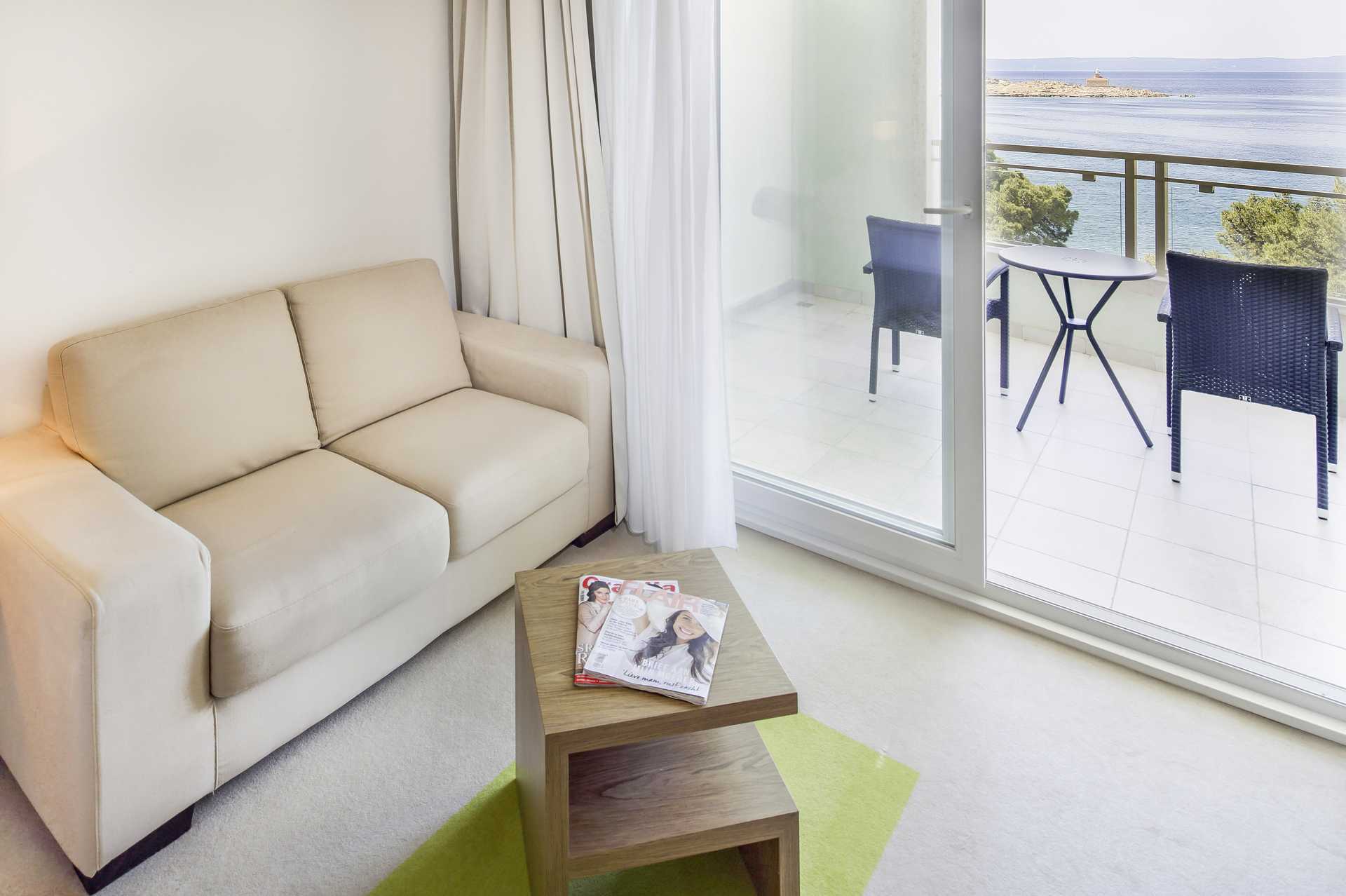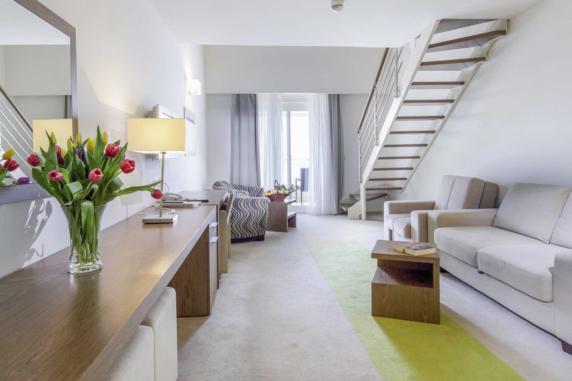 Sviter i etage med balkong och havsutsikt. En trappa upp finns en dubbelsäng och på nedre plan finns ett vardagsrum med möjlighet till extrabädd i bäddsoffa. Öppen planlösning mellan våningarna. Wifi, luftkonditionering och deponering ingår. Minibar. Vattenkokare samt kaffe och te. Tv med internationella kanaler. Heltäckningsmatta. Hårtork. Ett badrum på varje plan, varav ett har badkar. Wc. Städning 7 ggr/vecka.