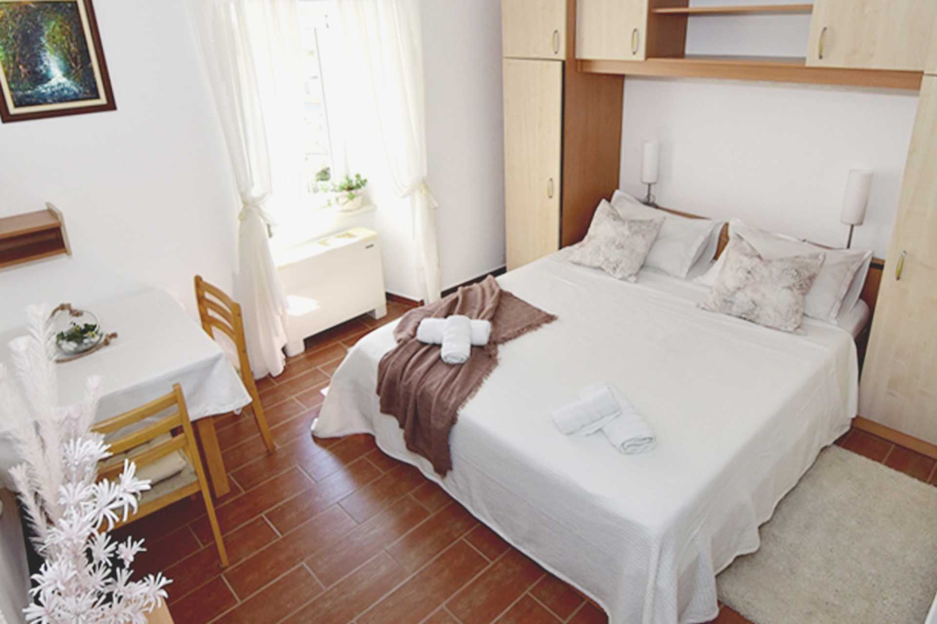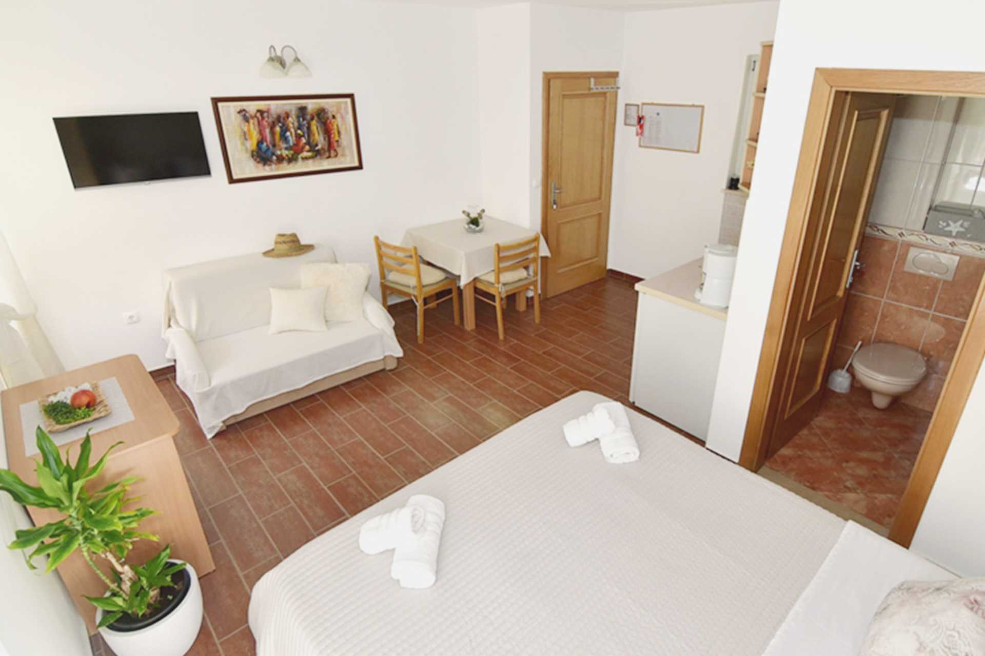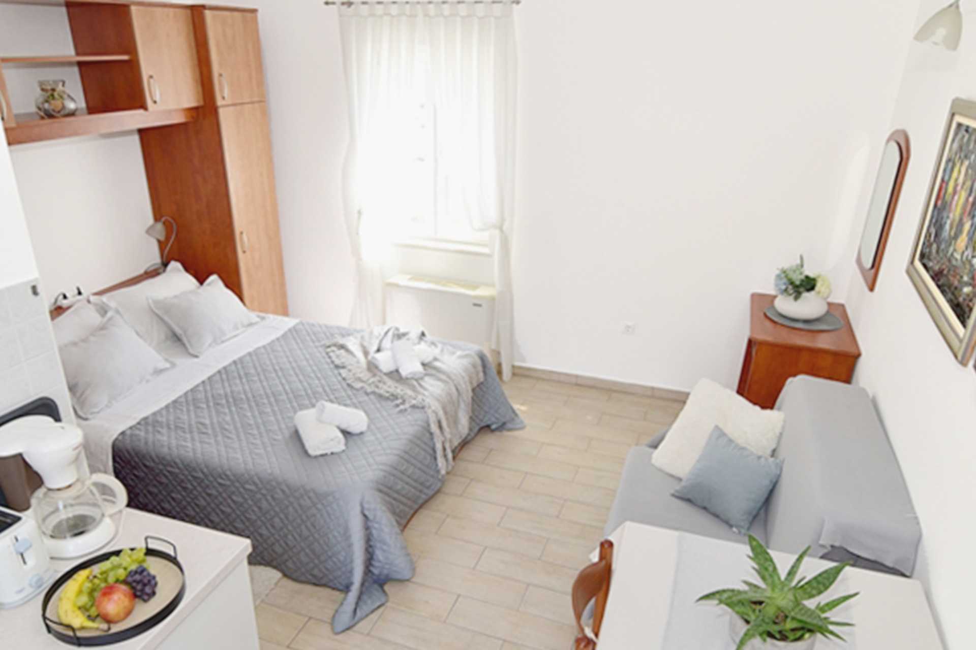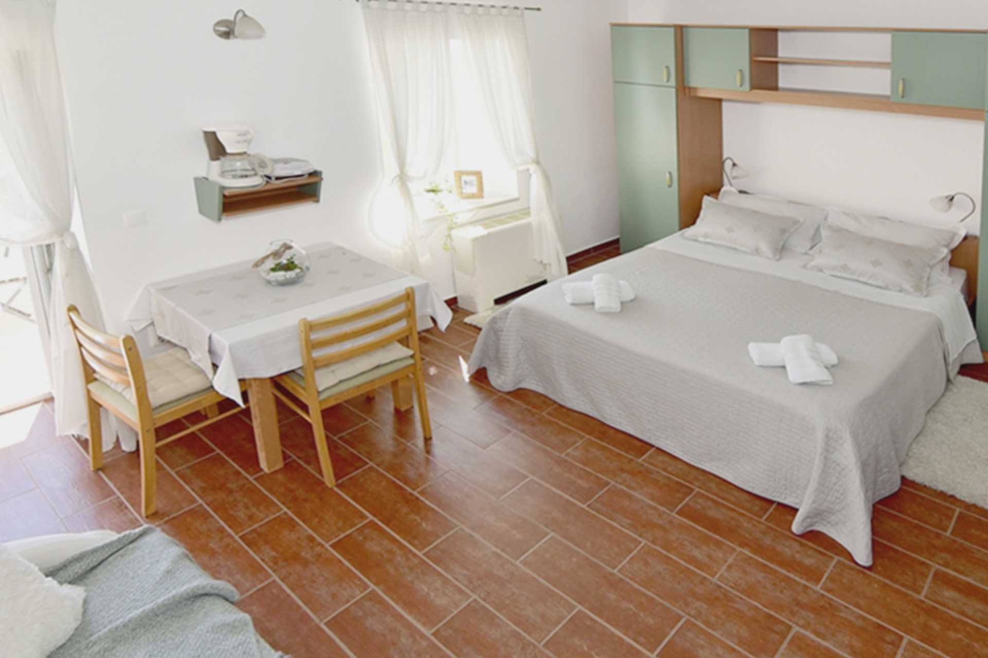 Enrumslägenheter med eller utan balkong. Lägenheterna varierar i storlek. Sovrum kombinerat med minikök. En dubbelsäng. Möjlighet till extrabädd i bäddsoffa. När extrabädden används blir det trångt i rummet. Minikök med kokplattor, kylskåp, kaffebryggare, brödrost och enkel köksutrustning. Wifi, luftkonditionering och deponering ingår. Tv med internationella kanaler. Hårtork. Badrum med dusch och wc. Städning 7 ggr/vecka.