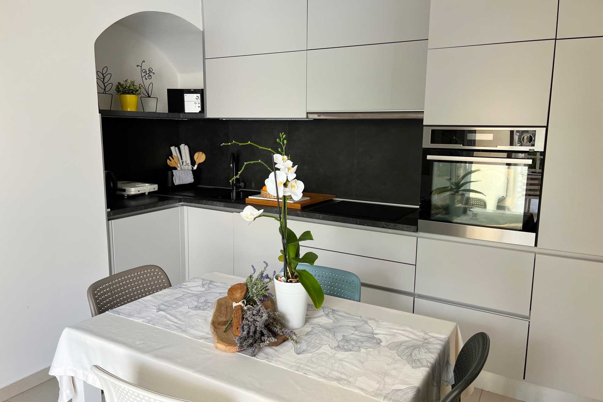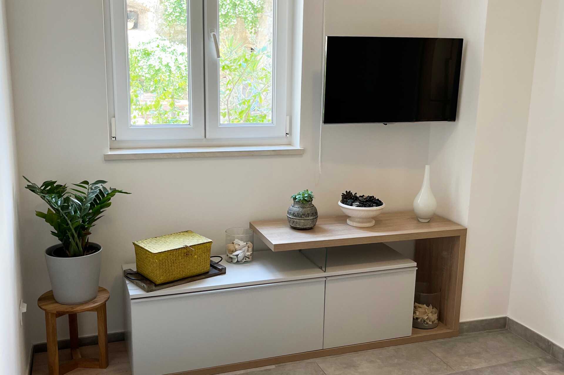 Tvårumslägenhet med jacuzzi och bastu i lägenheten och en markterrass med solstolar just utanför. Ett sovrum med en dubbelsäng och ett kombinerat vardagsrum/kök med möjlighet till extrabädd i bäddsoffa. Kök med kokplattor, ugn, kylskåp, mikrovågsugn, kaffebryggare, brödrost och enkel köksutrustning. Wifi, luftkonditionering och deponering ingår. Tv med internationella kanaler. Tvättmaskin i lägenheten. Hårtork. Badrum med dusch och separat wc. Städning 7 ggr/vecka.