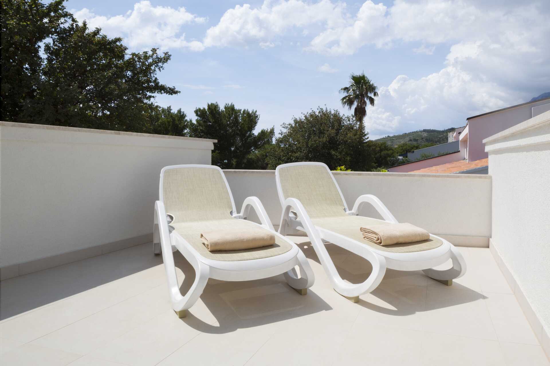 Familjerum med balkong eller terrass. Familjerummet är i etage. I entréplan finns ett kombinerat vardagsrum och sovrum med en dubbelsäng eller två enkelsängar, en bäddbar soffa samt ett badrum med hårtork, dusch och wc. Vattenkokare. Tv med internationella kanaler. En trappa upp finns ett sovloft med två enkelsängar. Wifi, luftkonditionering och deponering ingår. Städning 7 ggr/vecka.