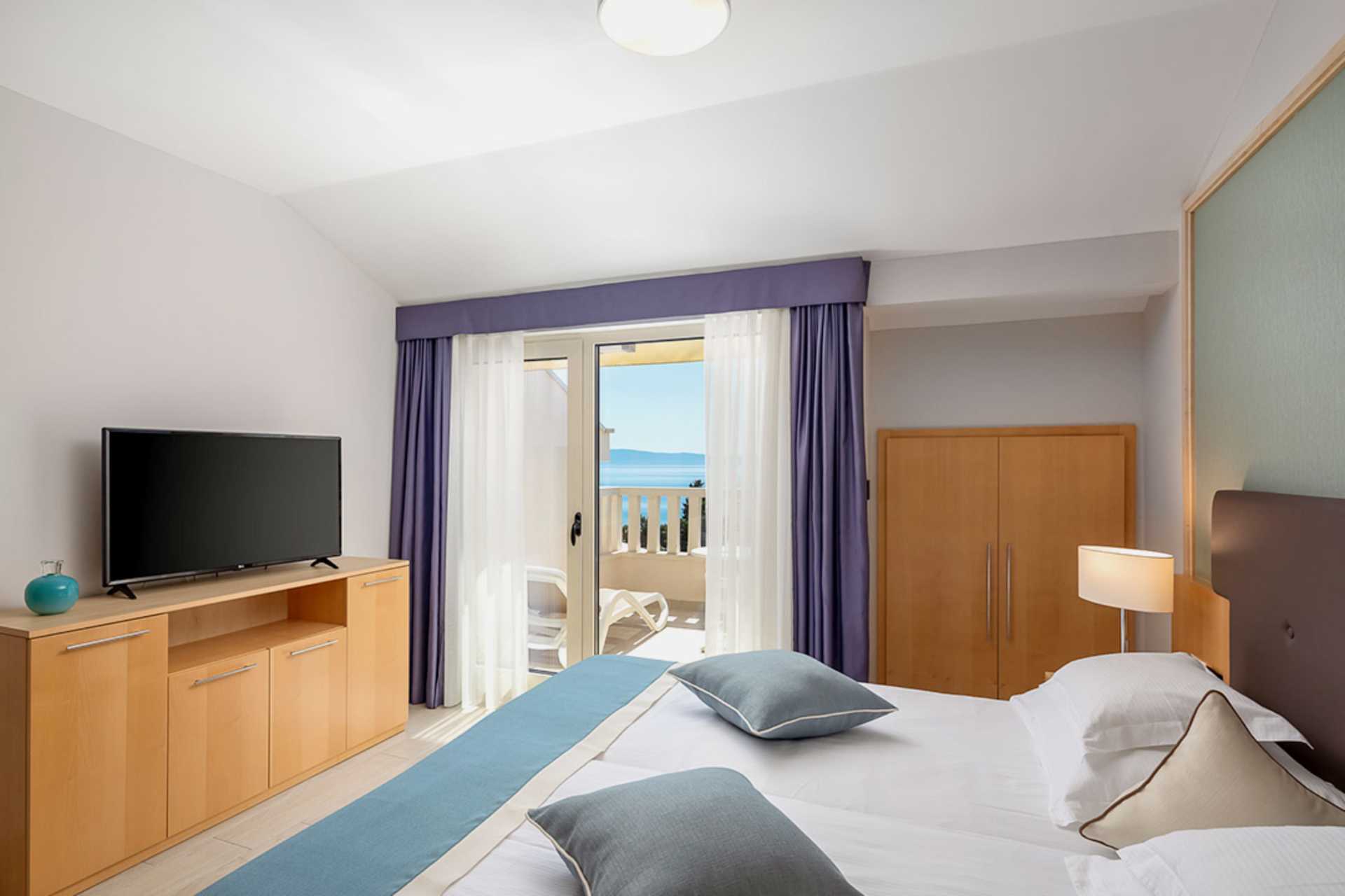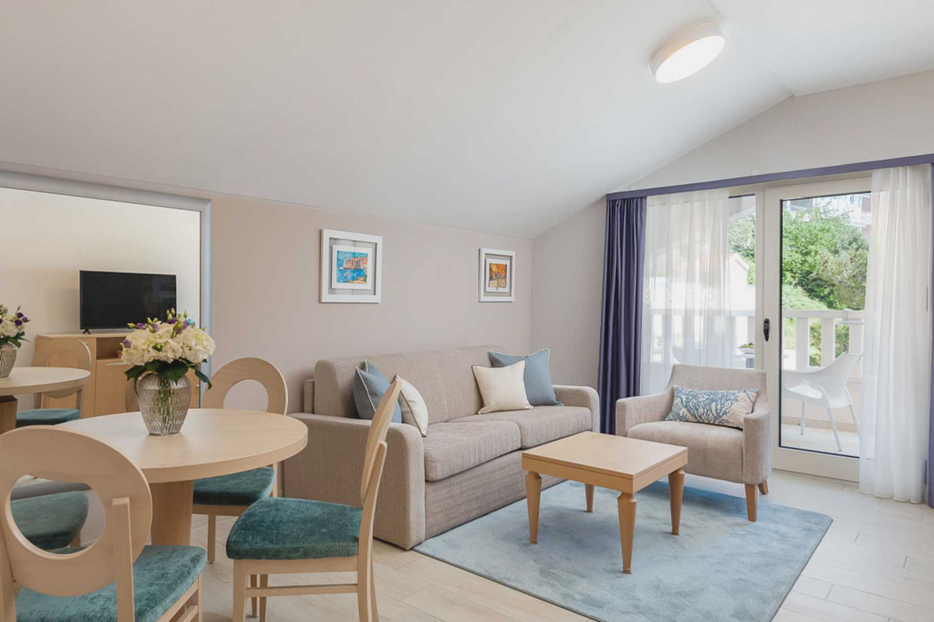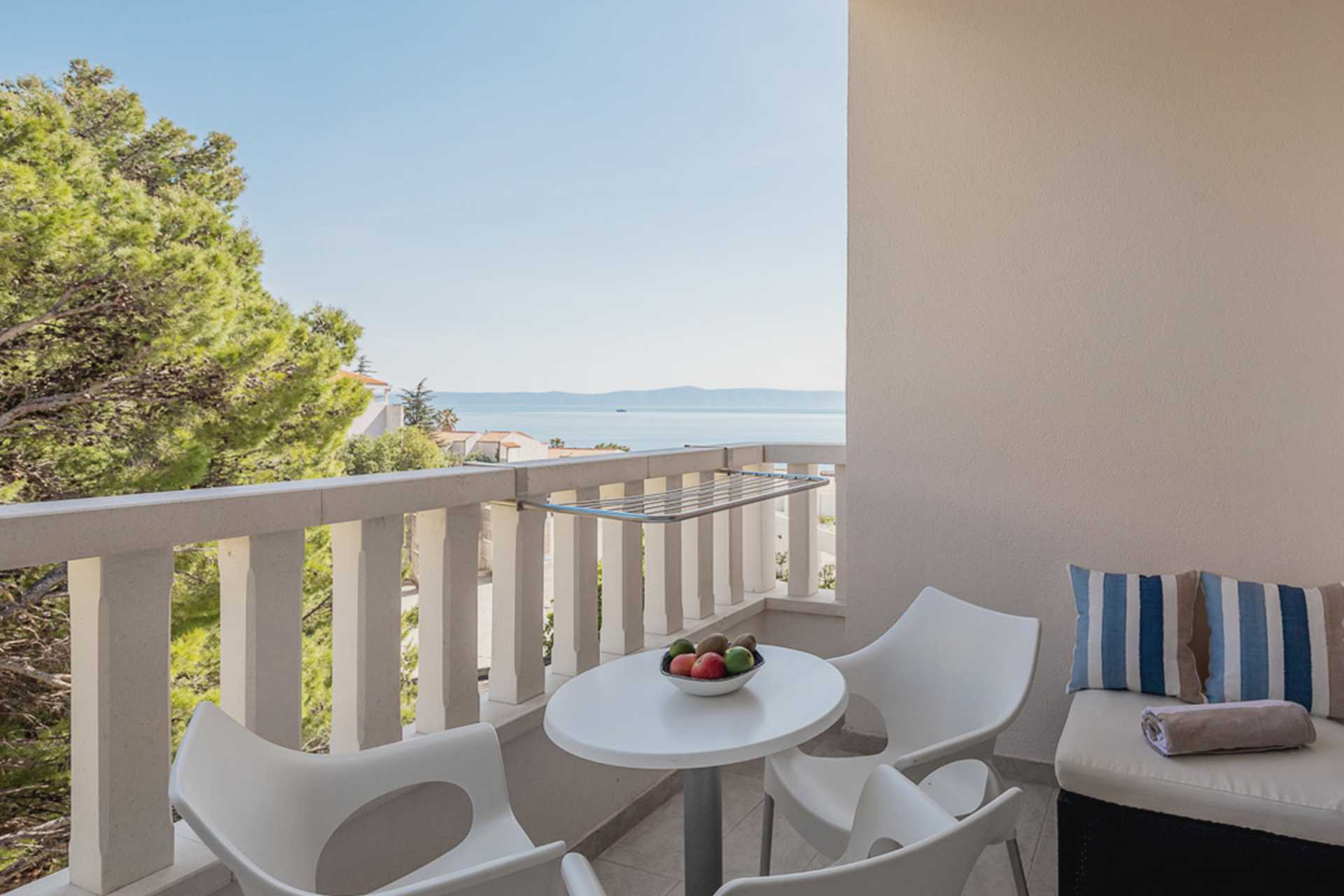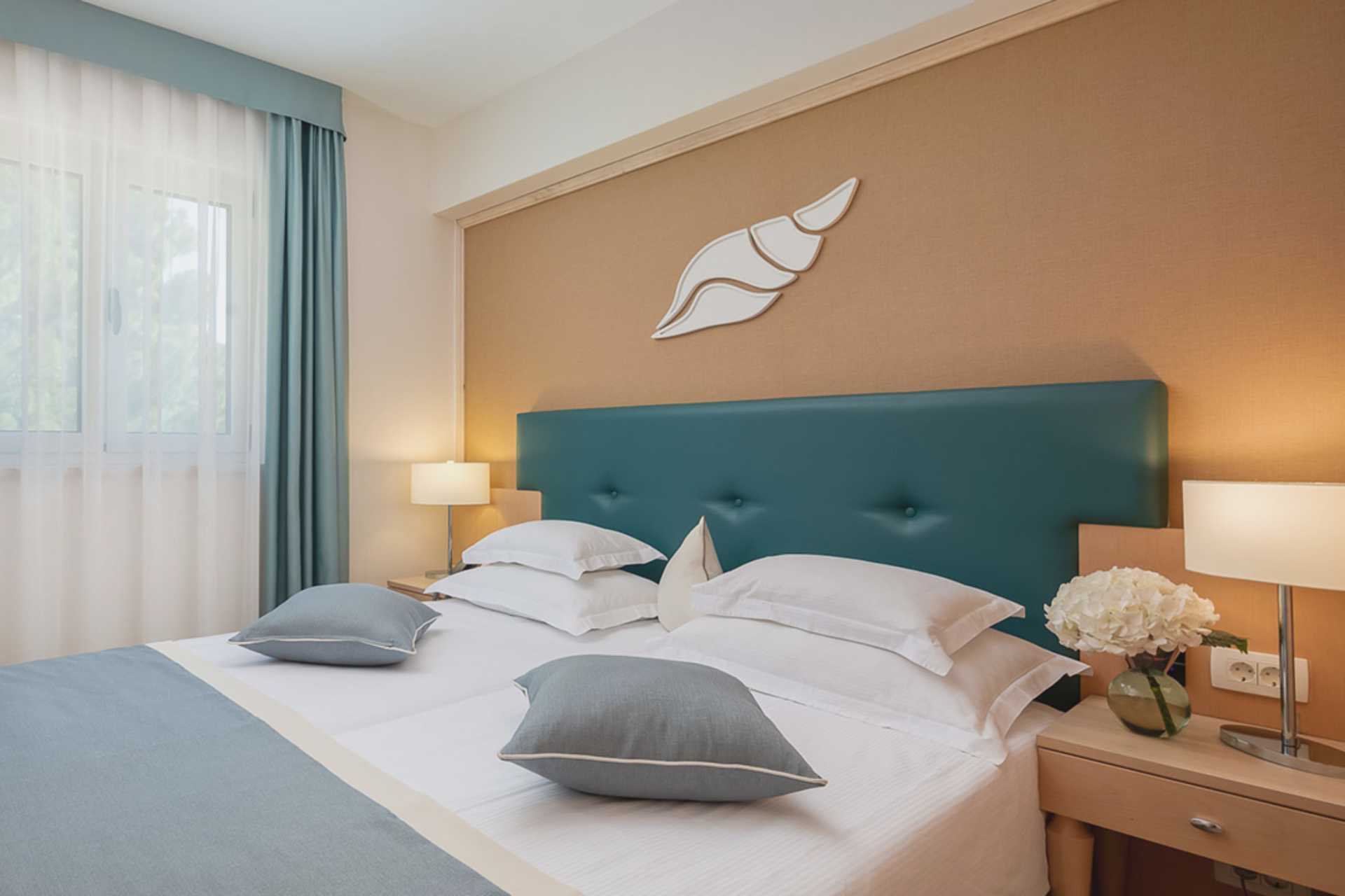 Tvårumslägenhet med markbalkong eller balkong, vissa balkonger har begränsad havsutsikt. Lägenheterna har olika utformning och lägenheterna på översta våningen har snedtak samt att balkongerna kan vara olika stora. Ett sovrum och ett kombinerat vardagsrum med minikök. En dubbelsäng. Möjlighet till extrabäddar i bäddsoffa. Minikök med kokplattor, kylskåp, mikrovågsugn, vattenkokare samt enkel köksutrustning. Wifi, luftkonditionering och deponering ingår. Tv med internationella kanaler. Hårtork. Badrockar och tofflor. Badrum med badkar eller dusch samt wc. Städning 7 ggr/vecka.