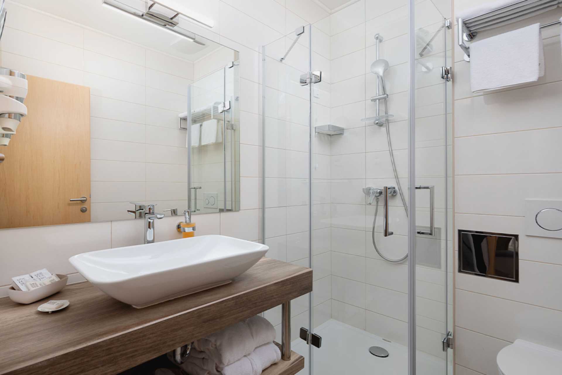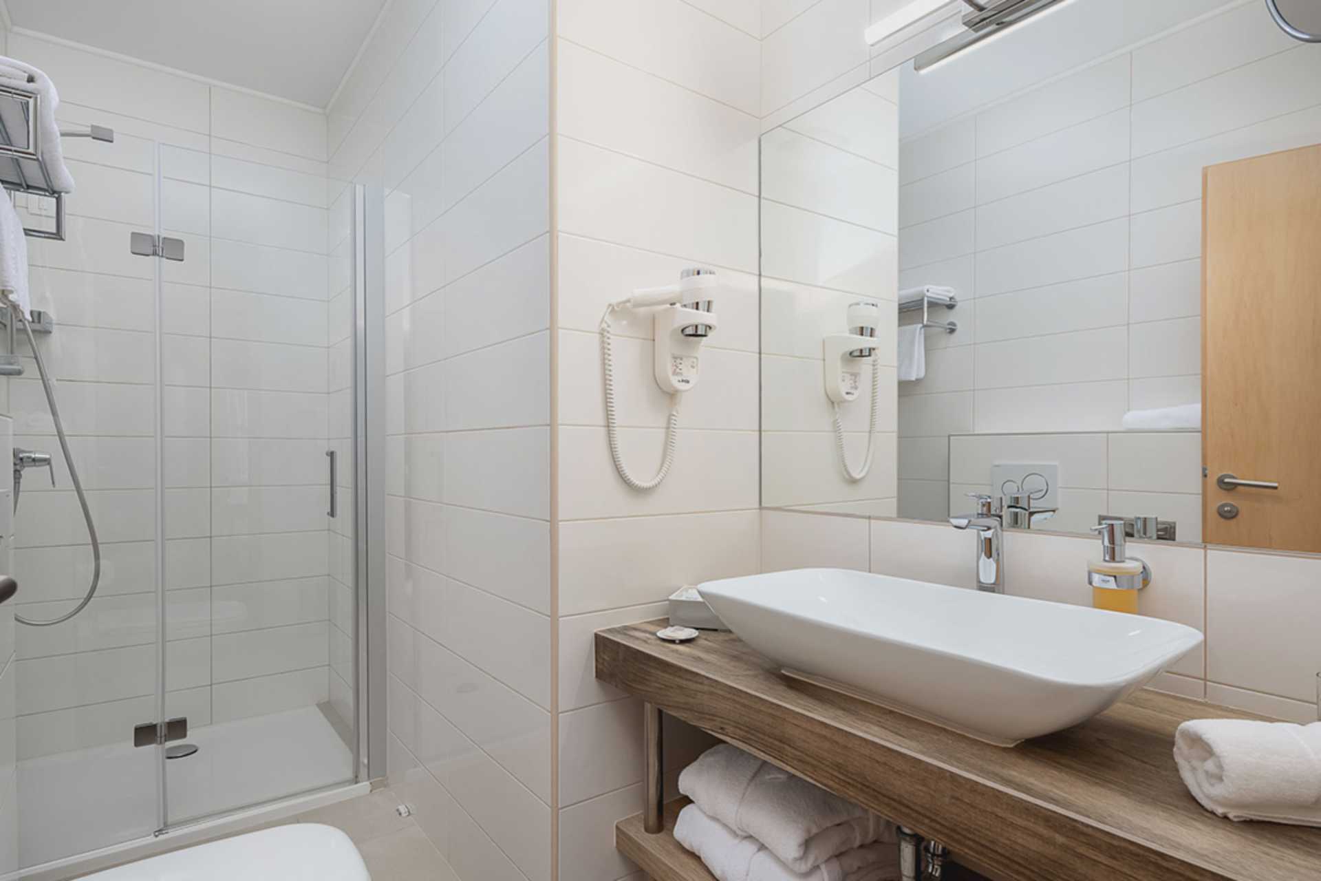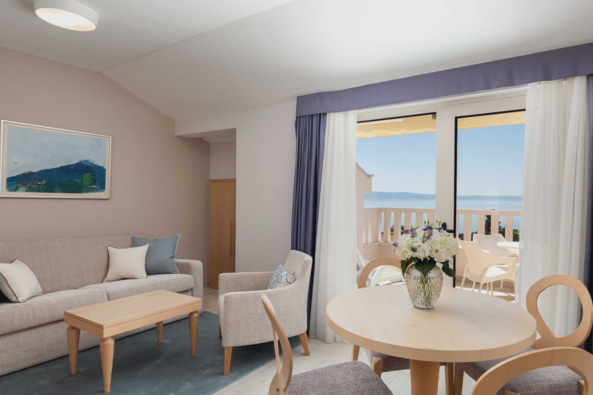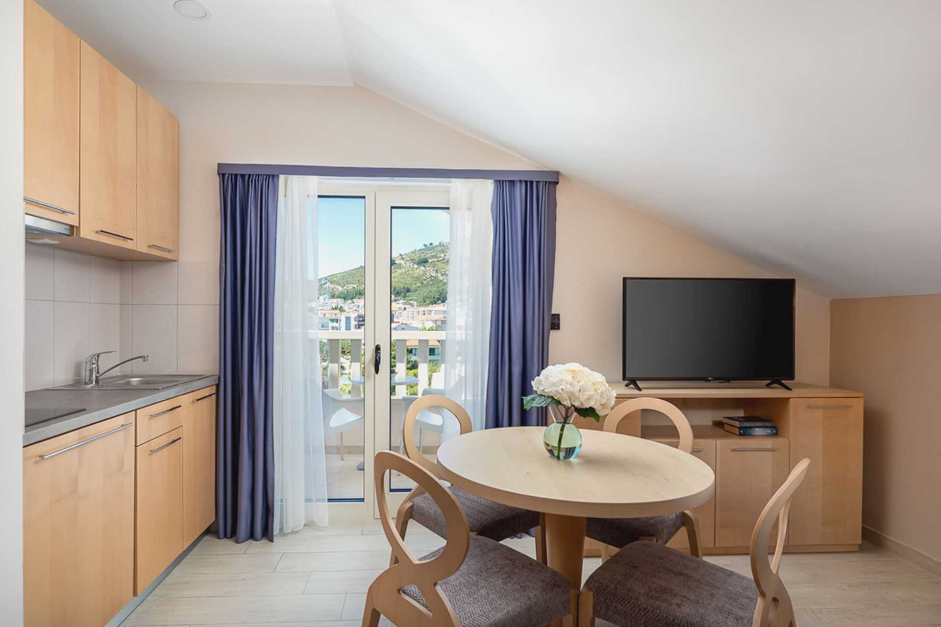 Tvårumslägenhet med markbalkong eller balkong, vissa balkonger har begränsad havsutsikt. Lägenheterna har olika utformning och lägenheterna på översta våningen har snedtak samt att balkongerna kan vara olika stora. Ett sovrum och ett kombinerat vardagsrum med minikök. En dubbelsäng. Möjlighet till extrabäddar i bäddsoffa. Minikök med kokplattor, kylskåp, mikrovågsugn, vattenkokare samt enkel köksutrustning. Wifi, luftkonditionering och deponering ingår. Tv med internationella kanaler. Hårtork. Badrockar och tofflor. Badrum med badkar eller dusch samt wc. Städning 7 ggr/vecka.