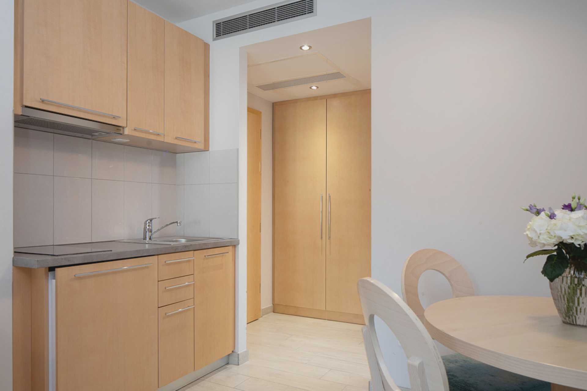 Enrumslägenhet med markbalkong eller balkong, vissa balkonger har begränsad havsutsikt. Lägenheterna har olika utformning och lägenheterna på översta våningen har snedtak samt att balkongerna kan vara olika stora. Kombinerat sovrum med minikök. En dubbelsäng. Möjlighet till extrabädd i bäddsoffa. Minikök med kokplattor, kylskåp, mikrovågsugn, vattenkokare samt enkel köksutrustning. Wifi, luftkonditionering och deponering. Tv med internationella kanaler. Hårtork. Badrockar och tofflor. Badrum med badkar eller dusch samt wc. Städning 7 ggr/vecka.