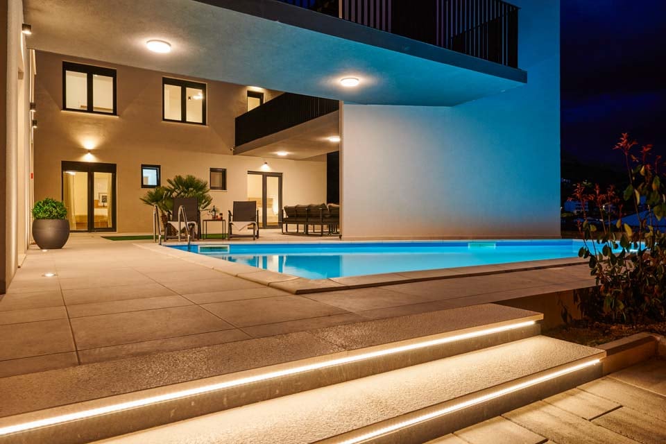 Denna unikt designade villa är unik i sitt slag, med en sandstensfasad polerad som en sten och en takterrass utomhus som erbjuder en fågelperspektiv över den pittoreska staden Omiš.