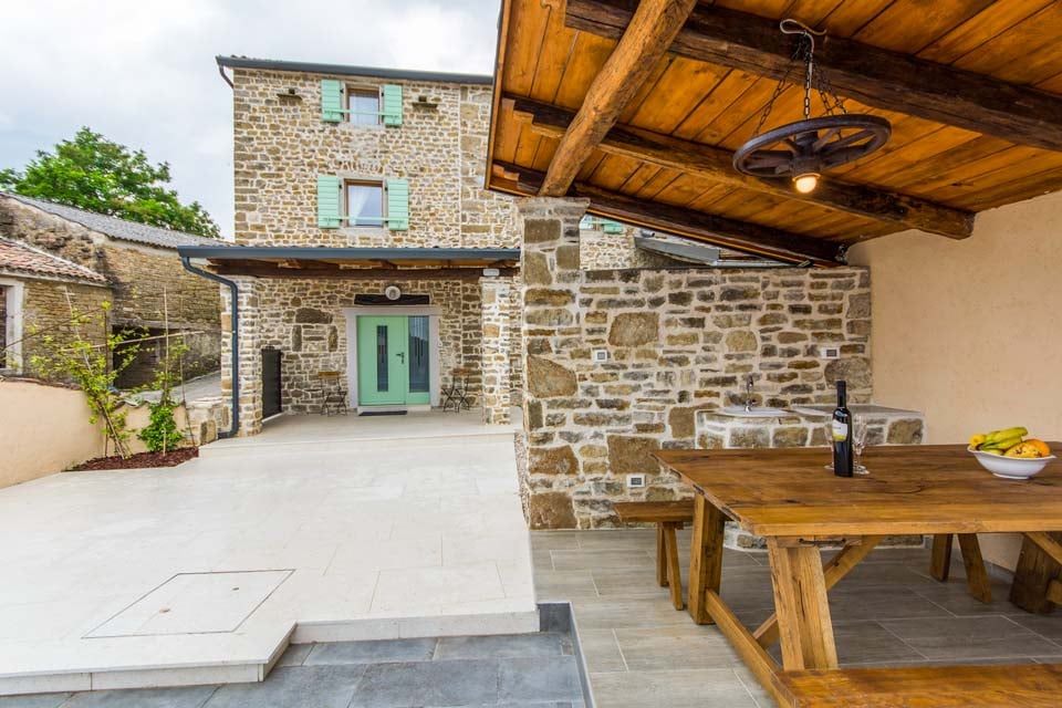 Denna sublima stenvilla är full av klassisk karaktär och uppvisar traditionell istrisk arkitektur som vackert återspeglar staden snidad med lokalt tegel och pastellfärgade fönsterluckor. Inuti håller traditionen levande, med träbjälkar i tak, stenfasader och vitkalkade stuckaturväggar. Inredningen är modern men behåller fortfarande den gammaldags stilen, med trämöbler och en tartanmönstrad soffa som skapar en varm och hemtrevlig miljö. Köket är en kocks dröm, färdigt med en modern touch med eleganta furuskåp i kombination med exklusiva vitvaror. Första våningen har två sovrum med mjuka dubbelsängar, med ett stort sovrum på andra våningen.