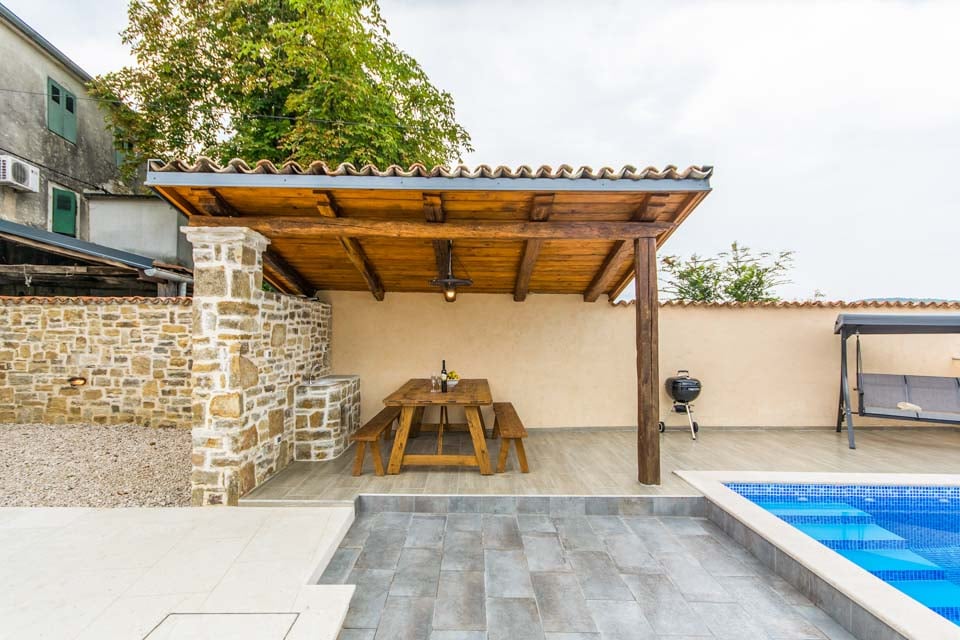 Huvudterrassen är en absolut dröm, med en glittrande utomhuspool och gott om lyxiga solstolar att varva ner och njuta av den vackra panoramautsikten. Middag på Villa Miris tillagas bäst utomhus, med en tegelgrill och en utomhusbänk som är perfekt för att slänga ihop en festmåltid i den svala brisen från sluttningen. Den dubbla gungfåtöljen är perfekt placerad med utsikt över det lantliga landskapet, där du kan njuta av den istriska landsbygdens storslagna natur.