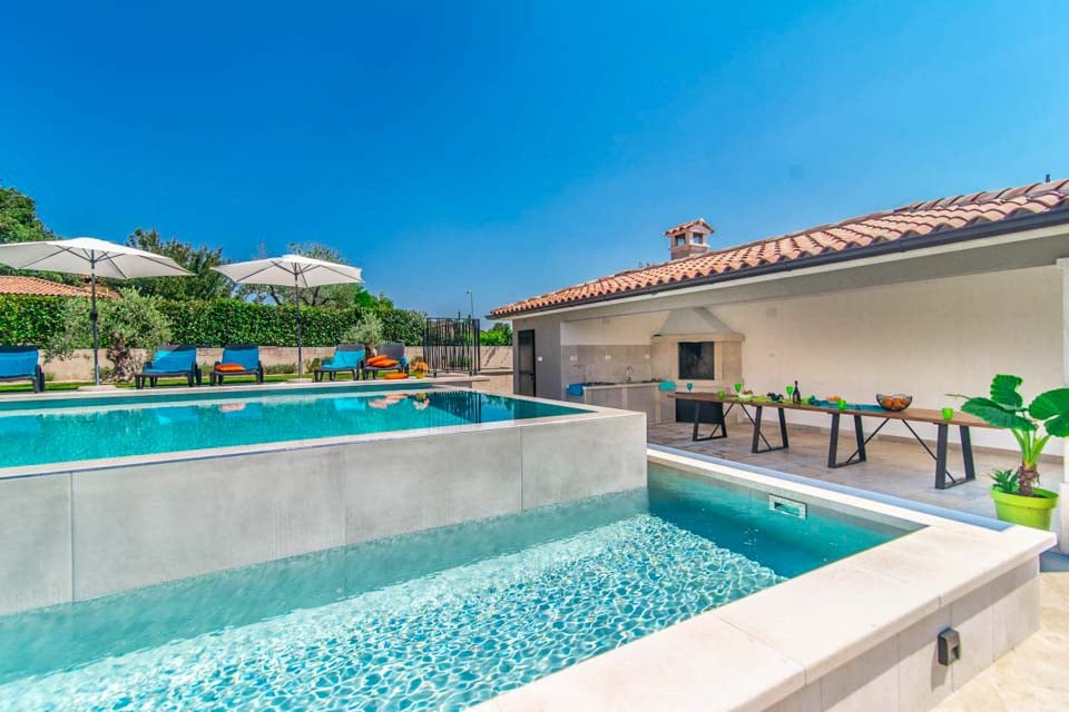 Dina ögon dras omedelbart till innergården, där gästerna hittar en vackert utformad infinitypool med trappor som leder ner till en vidsträckt gräsmatta bortom. Det finns gott om plats att sträcka ut sig och njuta av den härliga kroatiska solen, med en skuggig terrass som är den perfekta platsen att svalka sig och smutta på en uppfriskande cocktail.